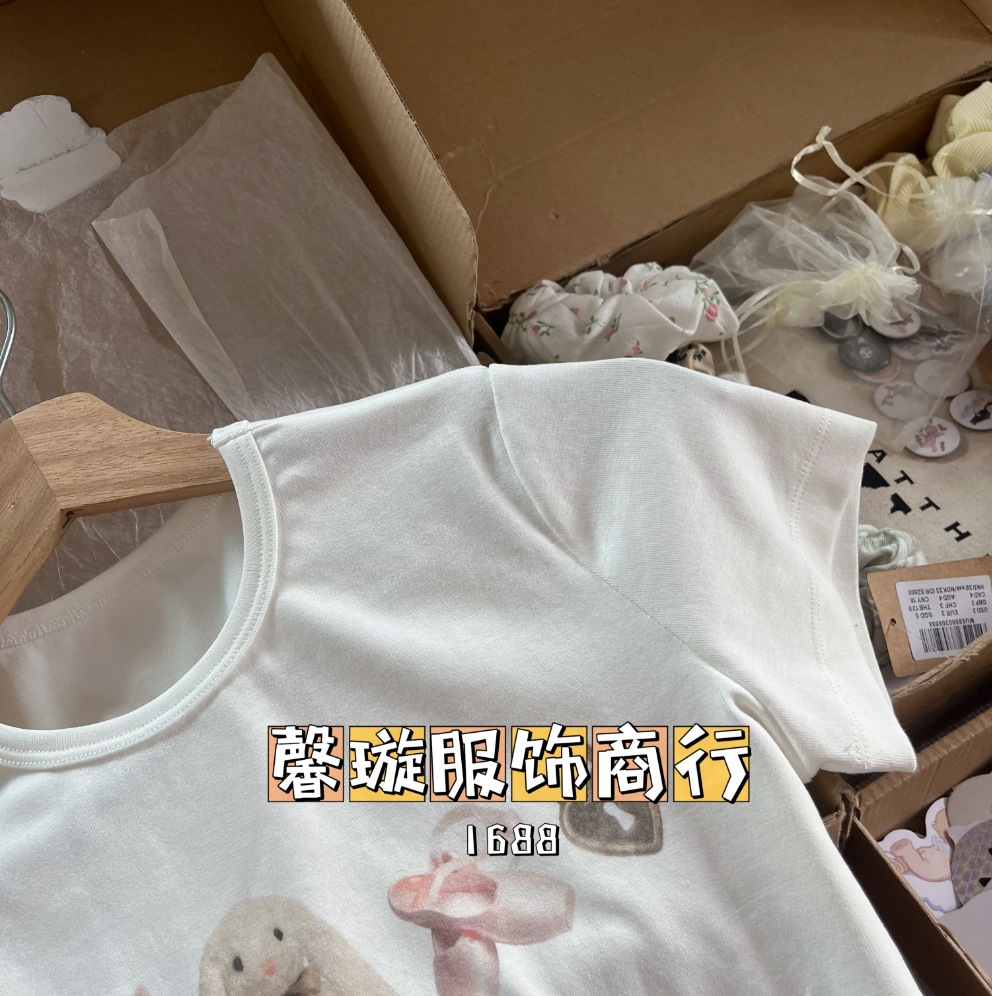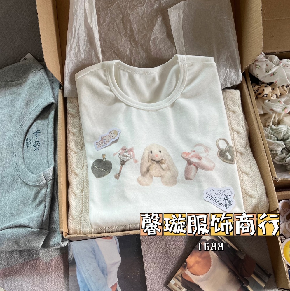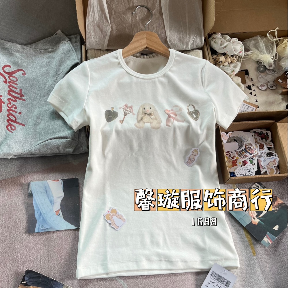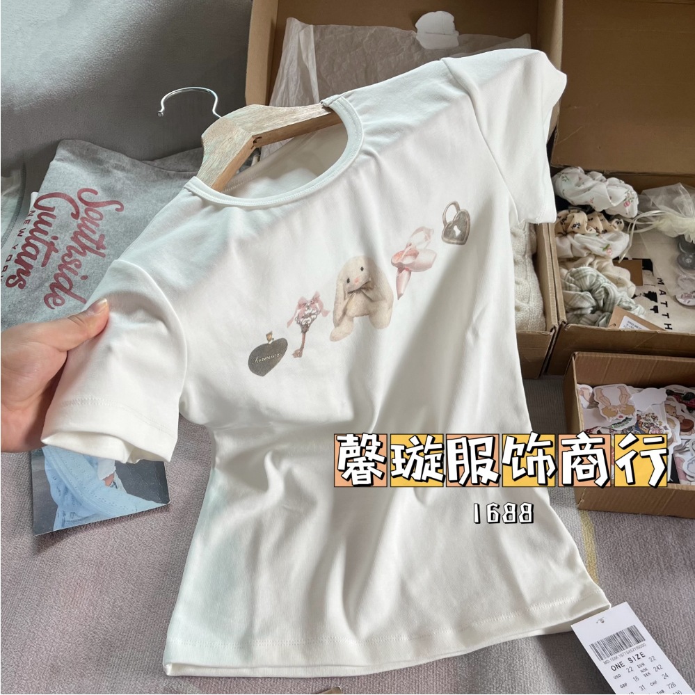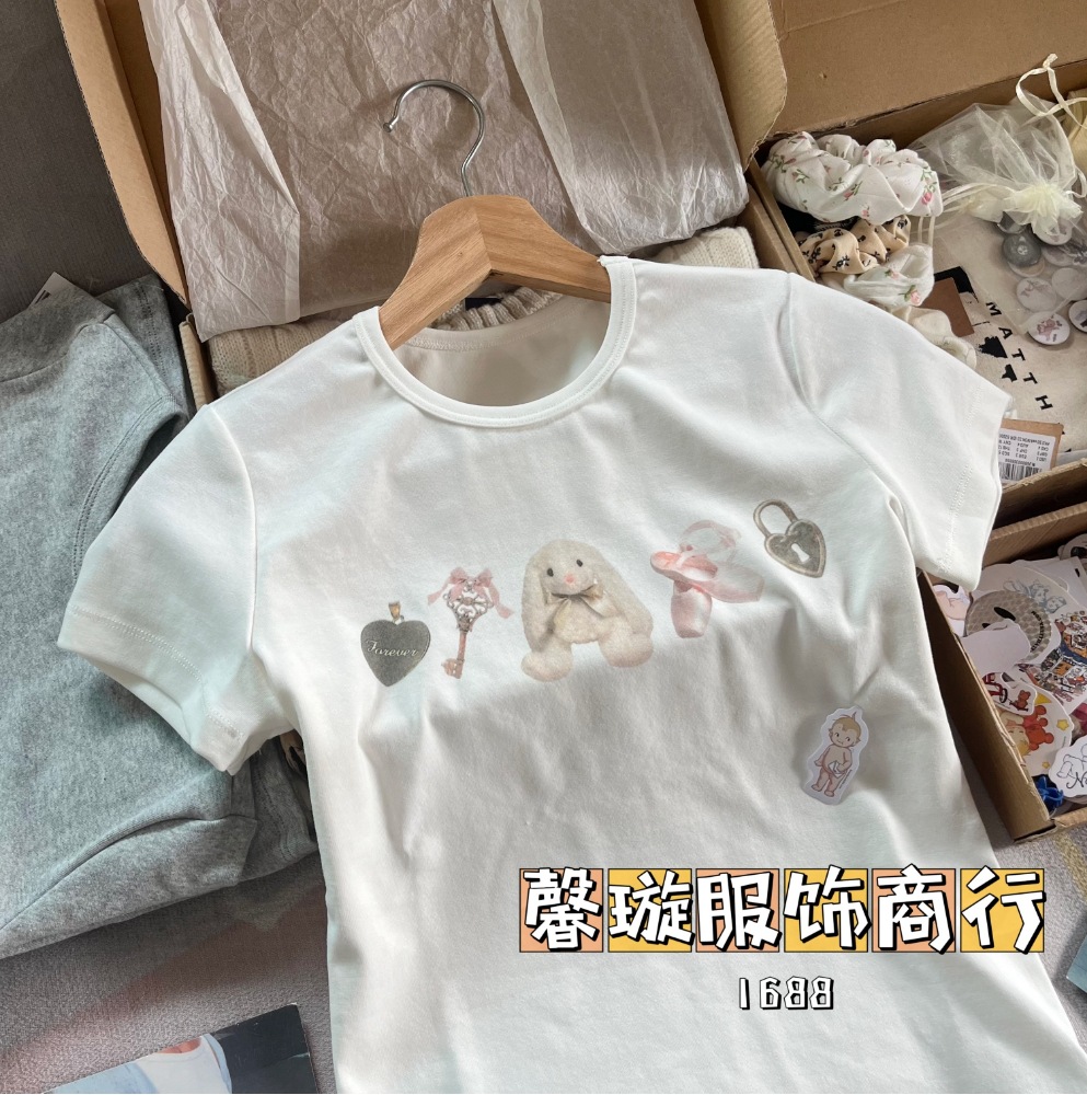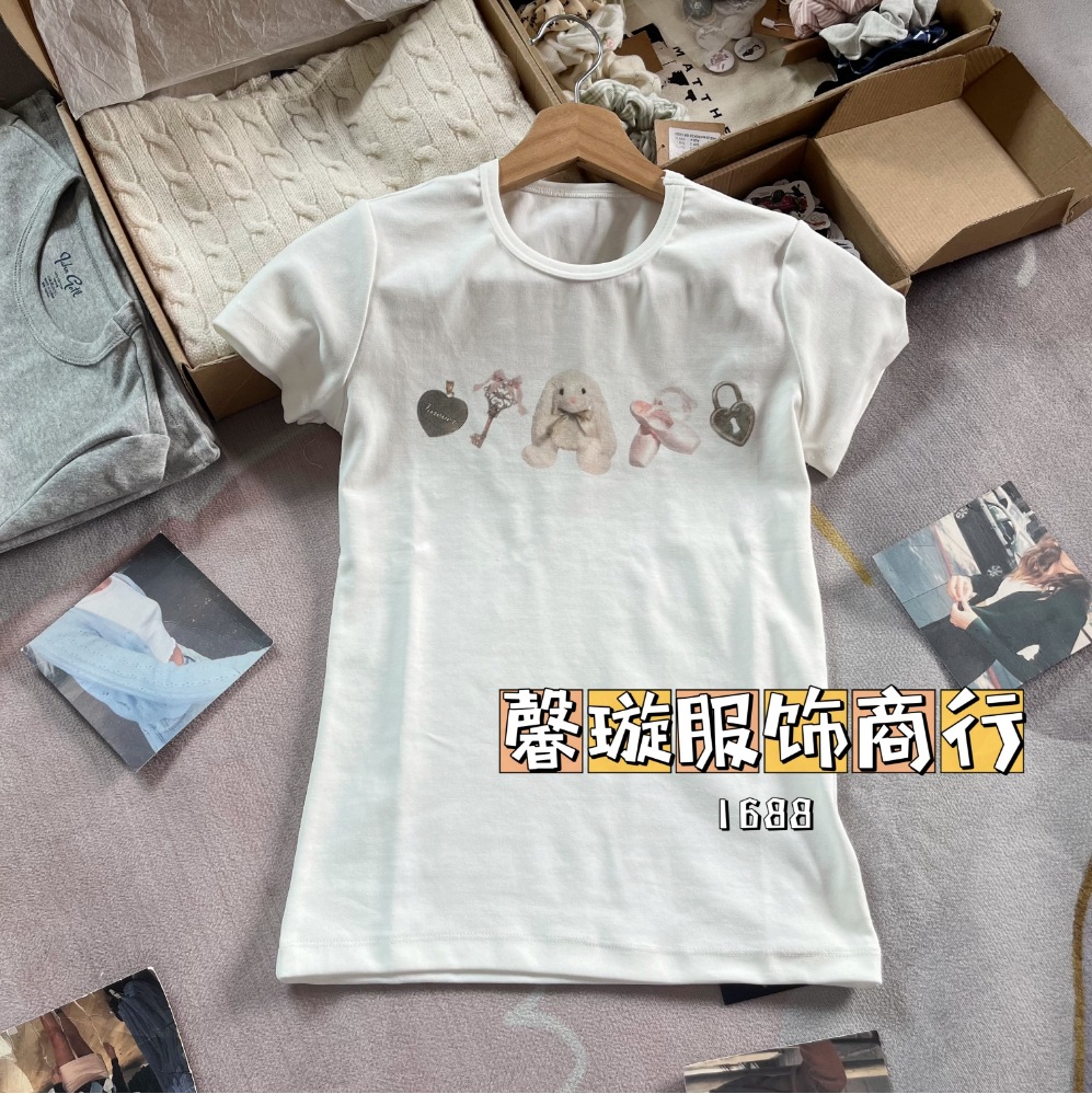 BM 스타일 새로운 BMM 반팔 티셔츠 발레 소녀 토끼 인쇄 라운드 넥 달콤하고 매운 슬림 탑 여성