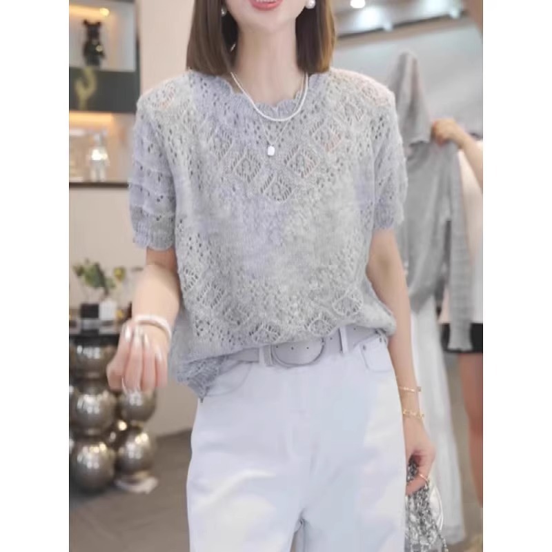 2025 봄과 가을 새로운 한국 스타일 느슨한 우아한 탑 여성용 할로우 얇은 반팔 티셔츠 둥근 목 니트베이스 셔츠