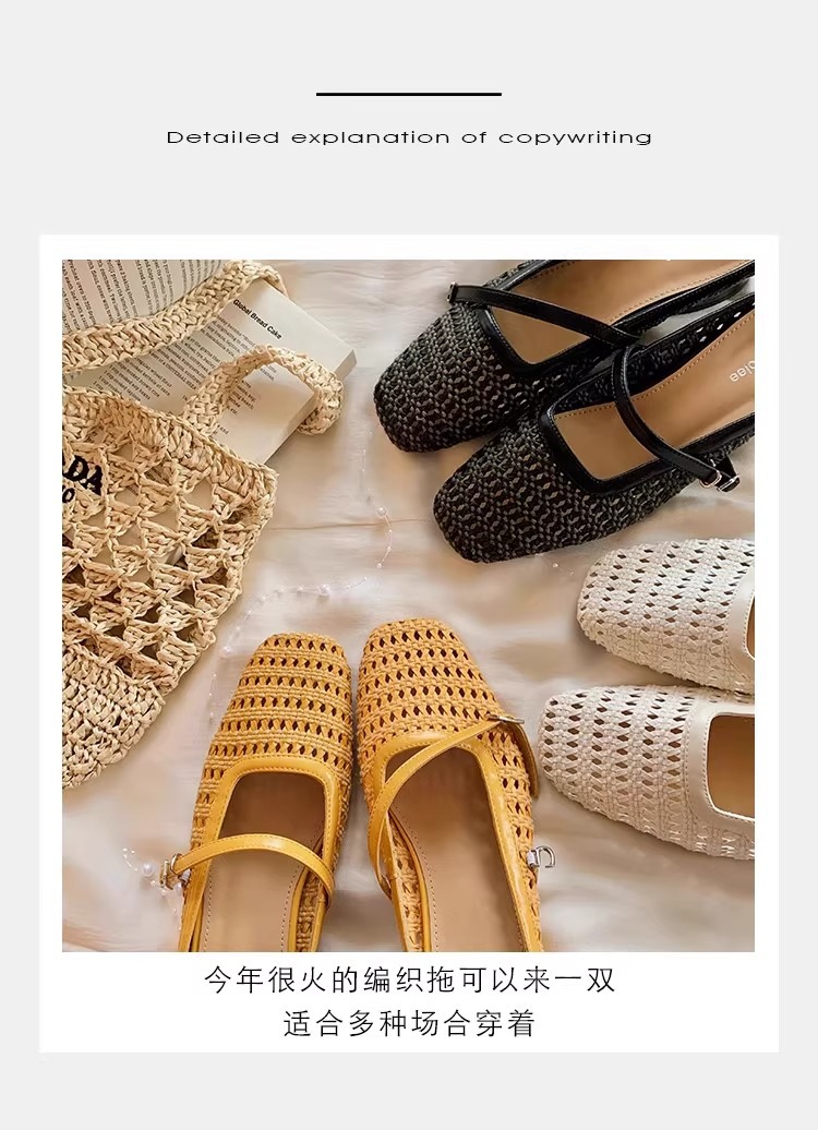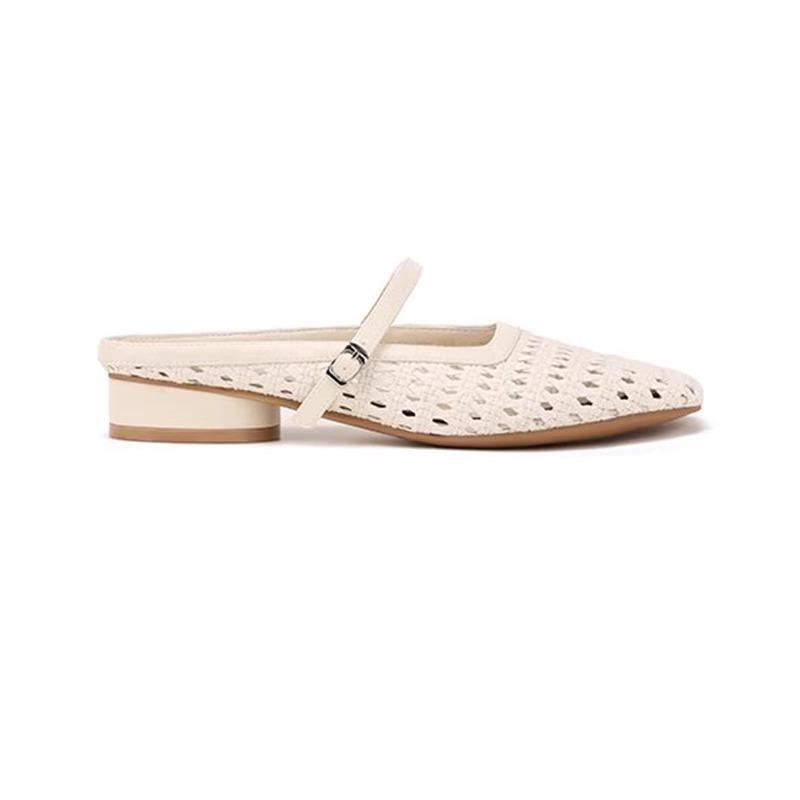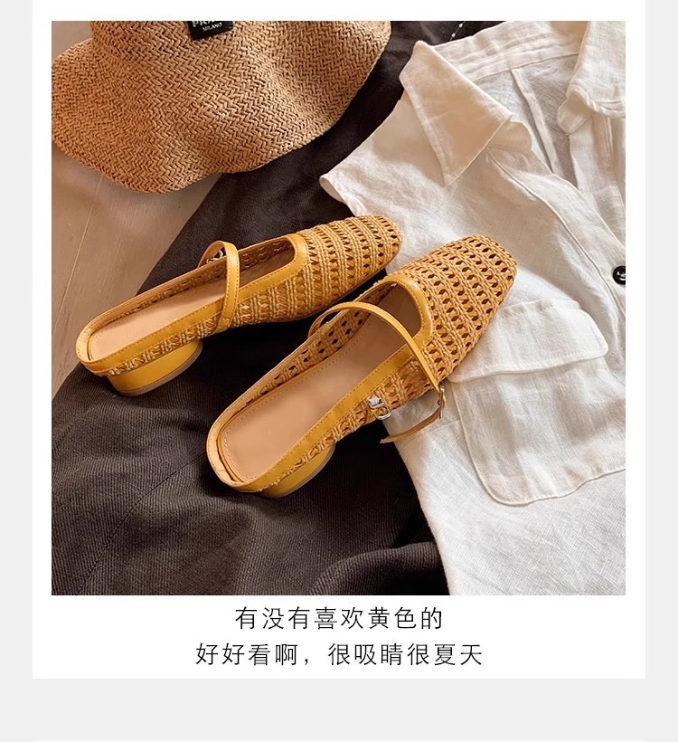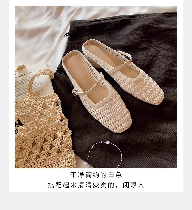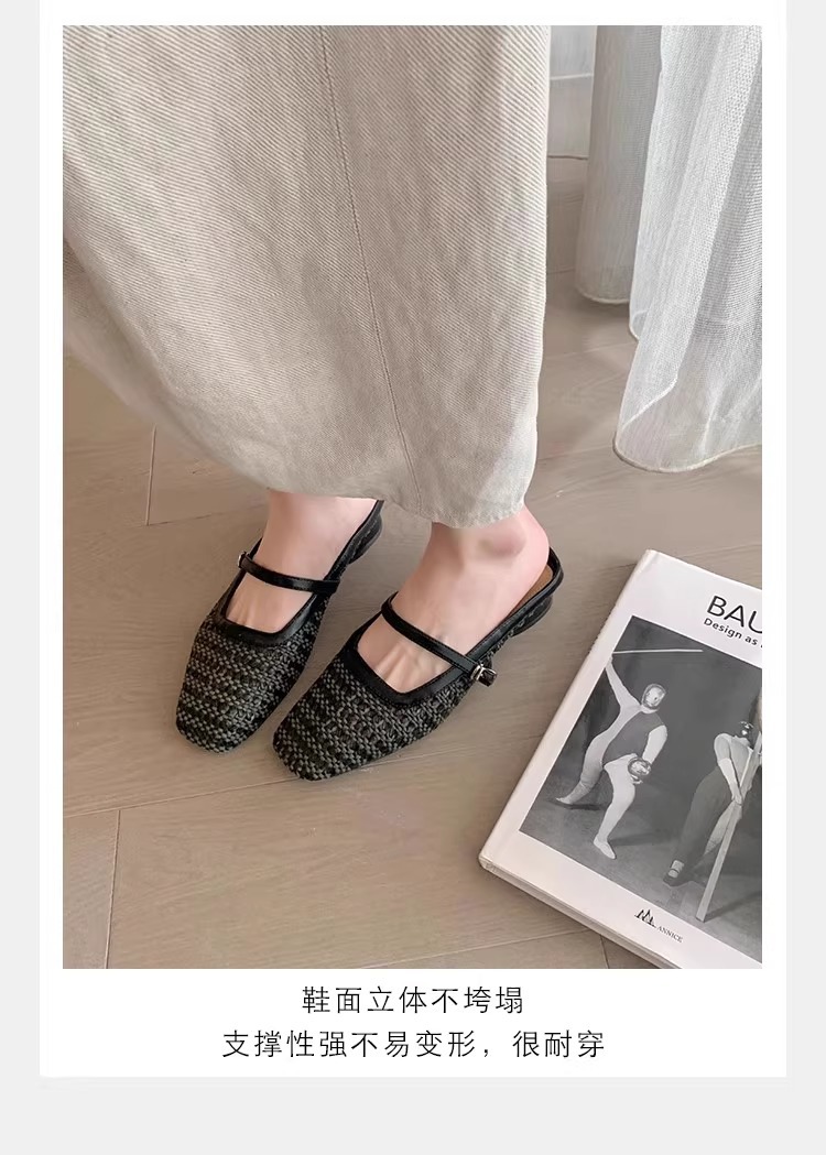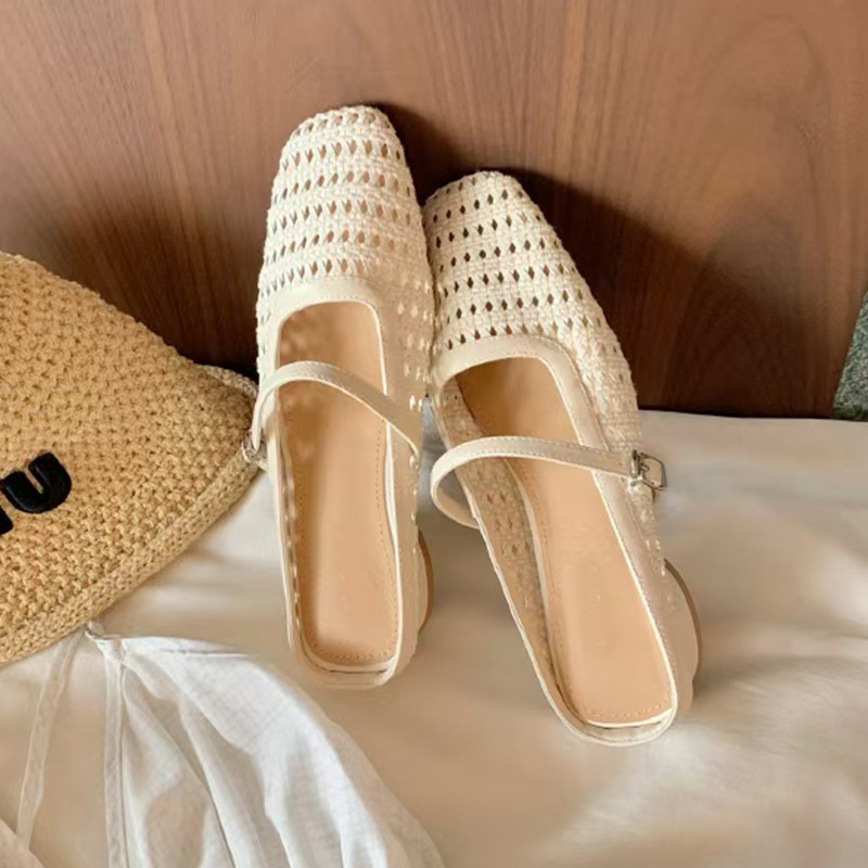 두꺼운 힐 뮬러 여성용 여름 의상 비치 우아한 발가락 샌들을 곁들인 빈티지 짠 할로우 스퀘어 발가락 하프 슬리퍼