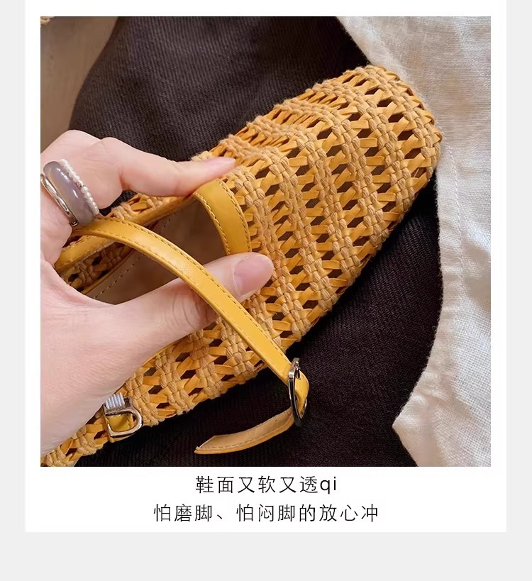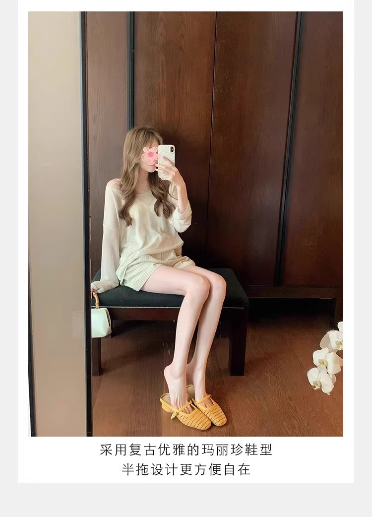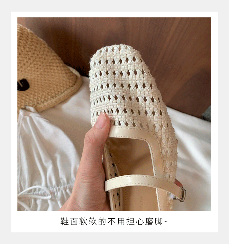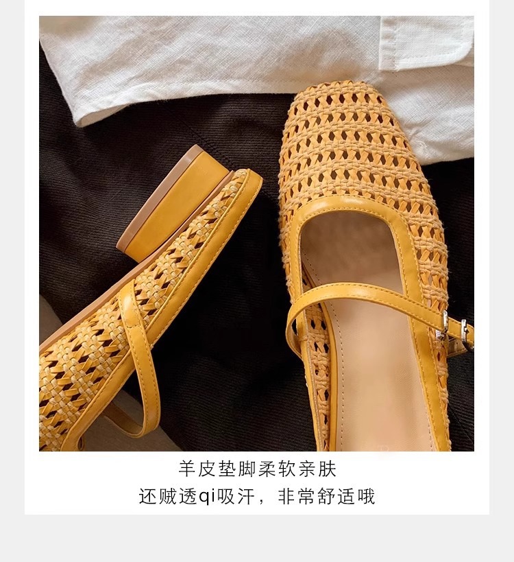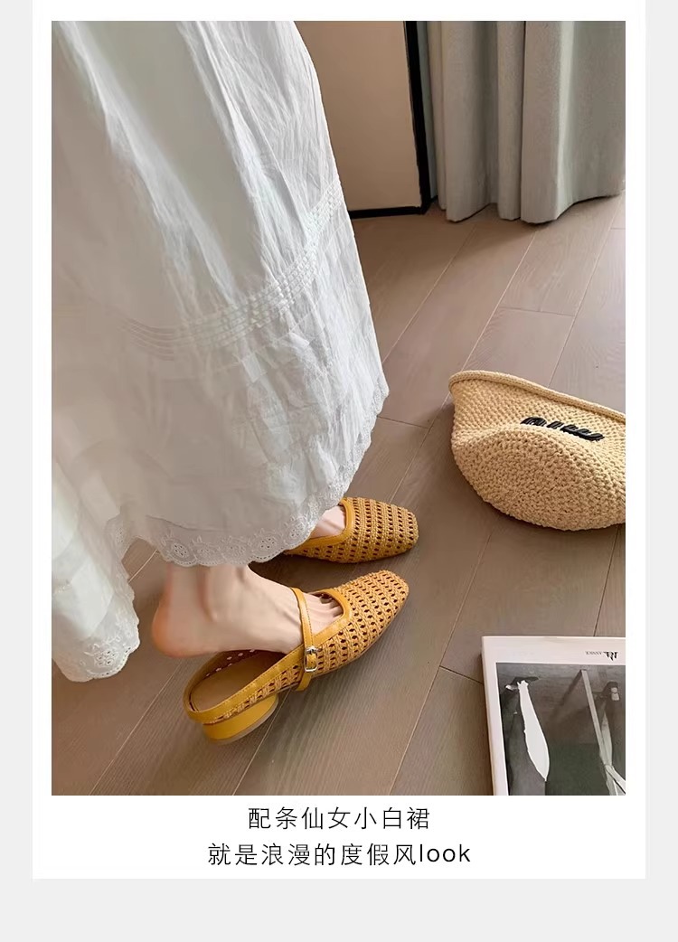 두꺼운 힐 뮬러 여성용 여름 의상 비치 우아한 발가락 샌들을 곁들인 빈티지 짠 할로우 스퀘어 발가락 하프 슬리퍼