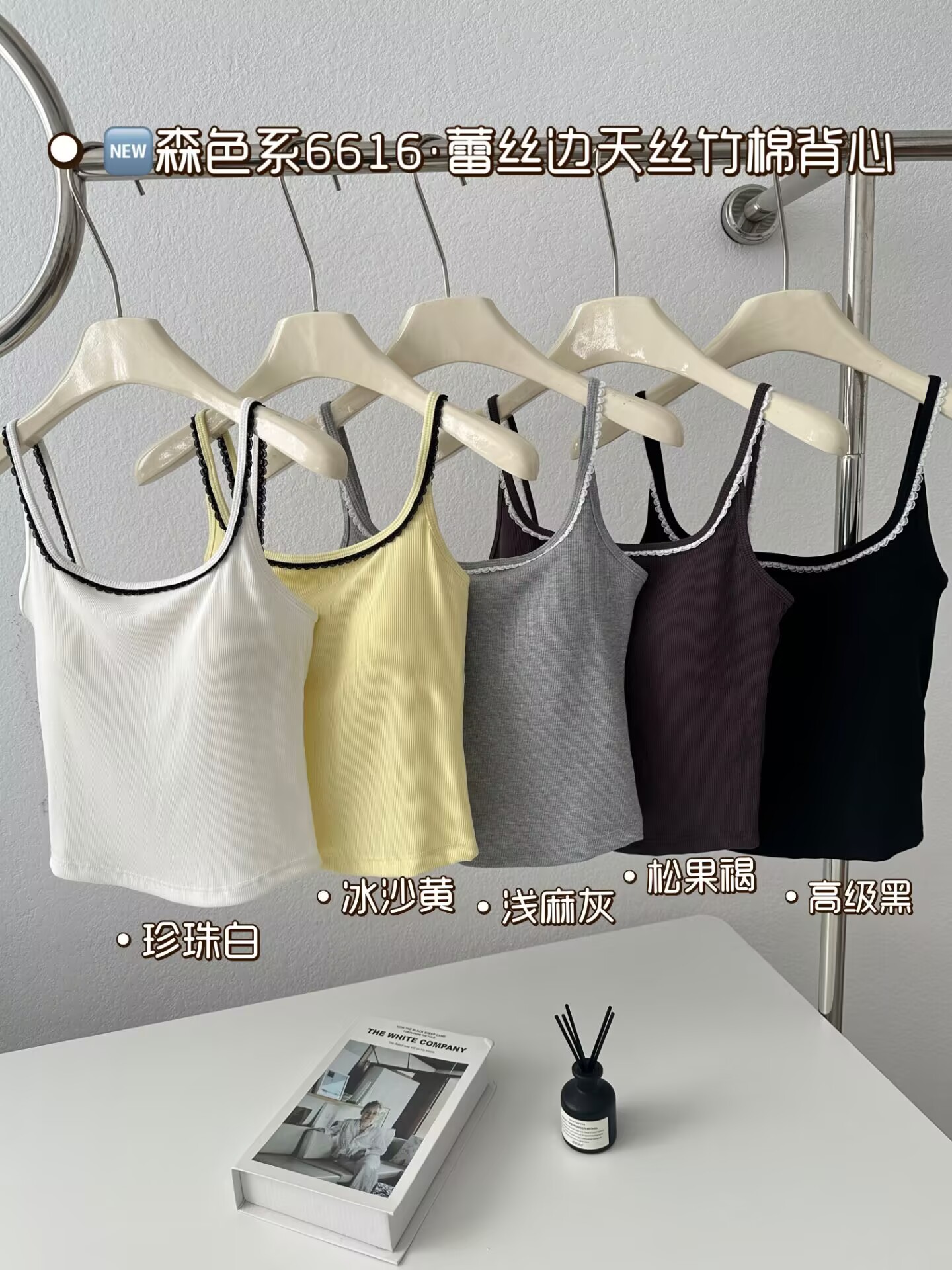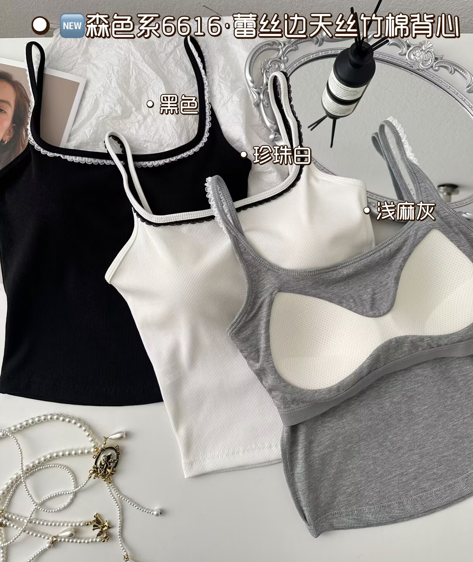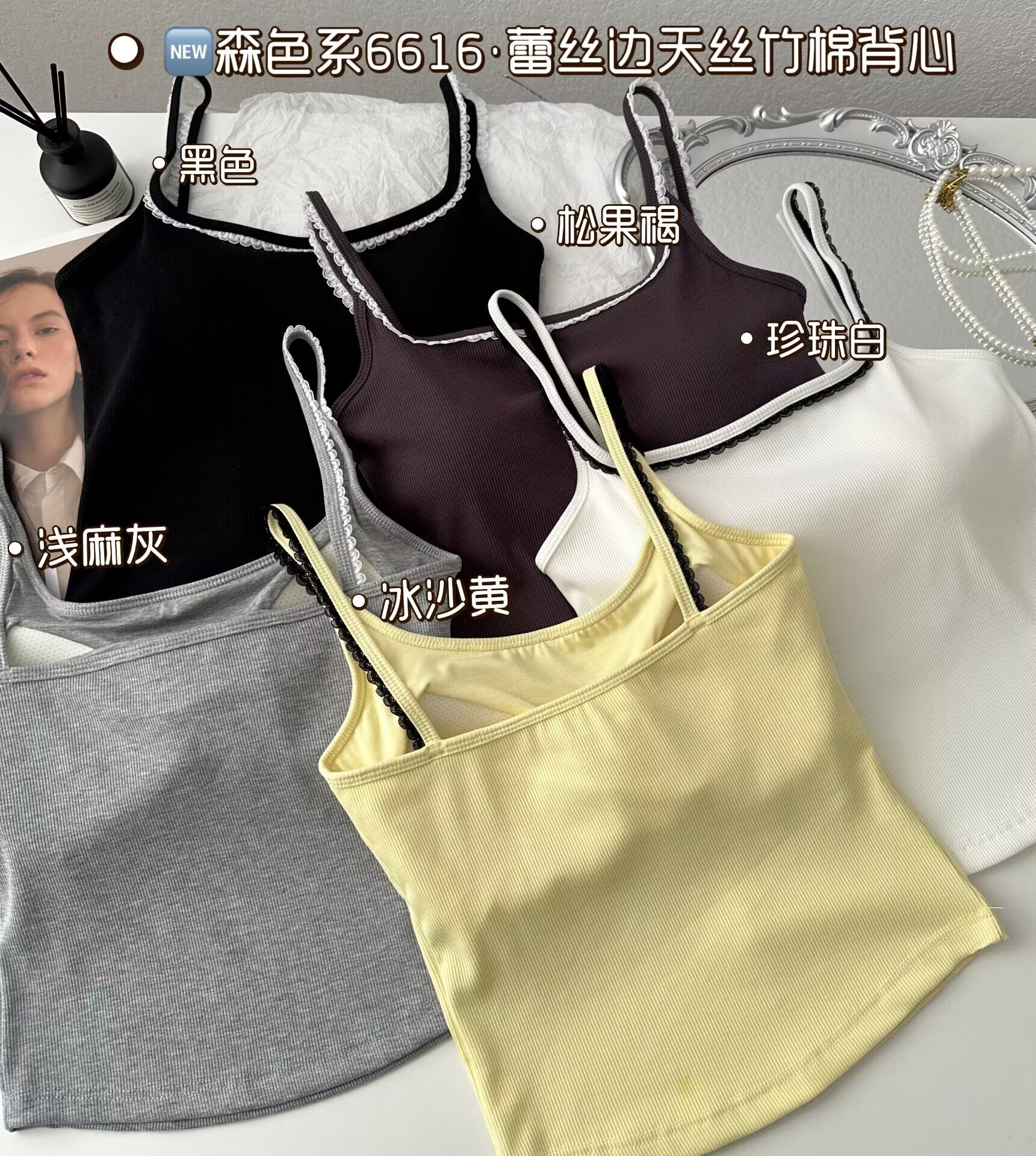 새로운 6616 레이스 텐셀 대나무 코튼 조끼 유행 여성 의류 패드 내부 명암 컬러 슬링베이스 아름다운 뒤