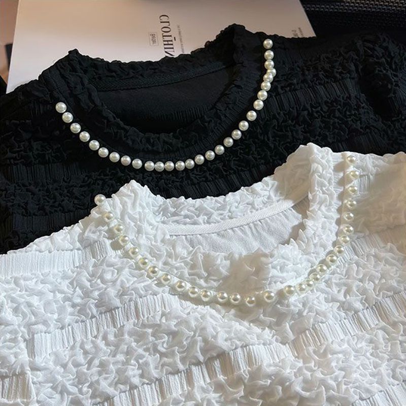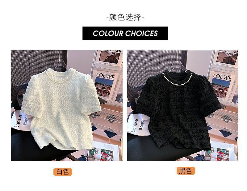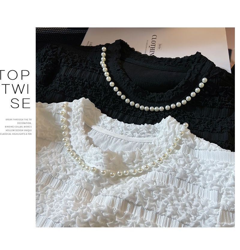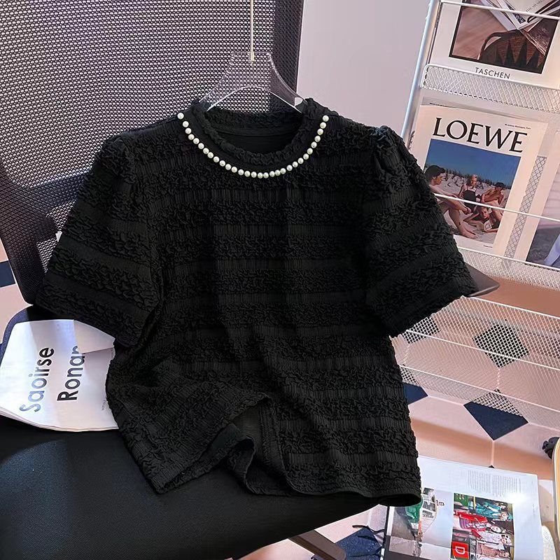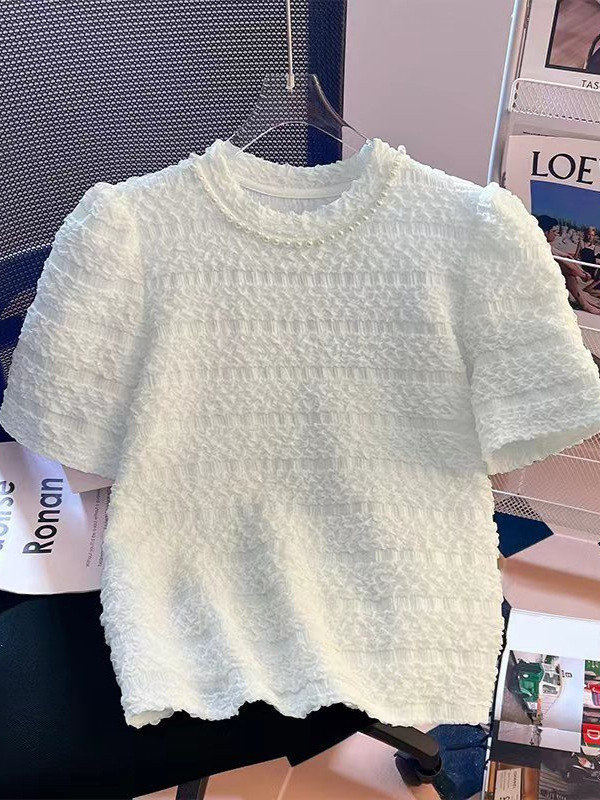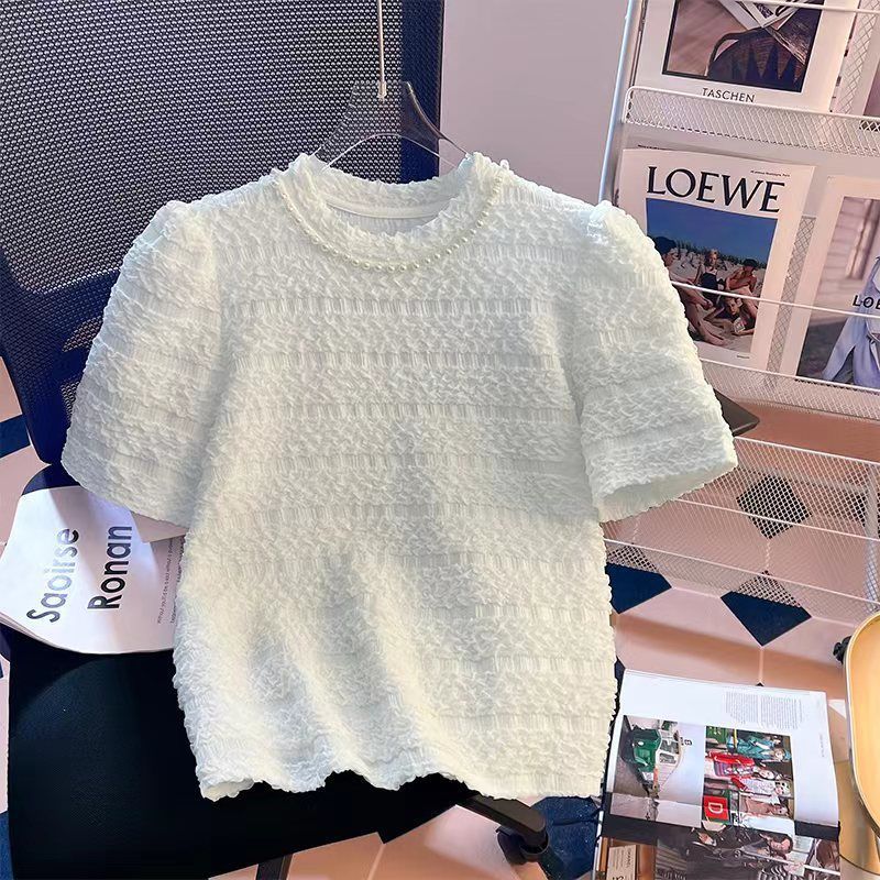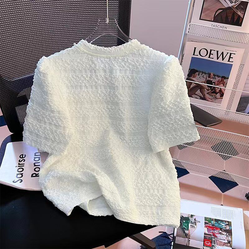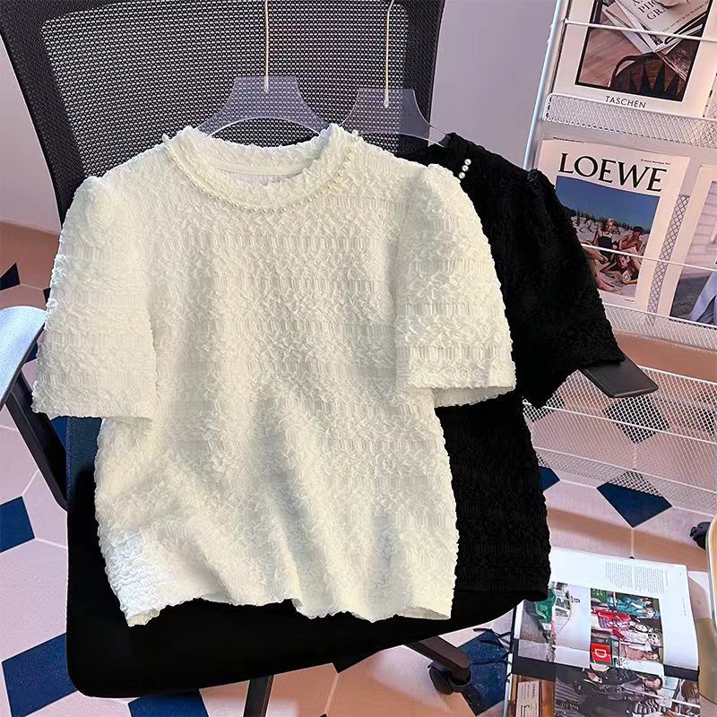 프랑스 스타일 디자인 센스 패션 캐주얼 라운드 넥 쉬폰 셔츠 여성의 여름 달콤한 에이지 감소 중공업 반팔 티셔츠 탑 트렌디스토어 가기