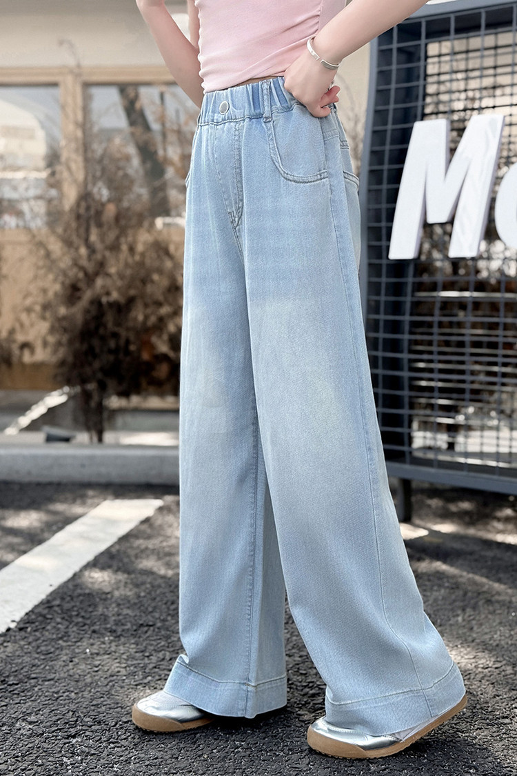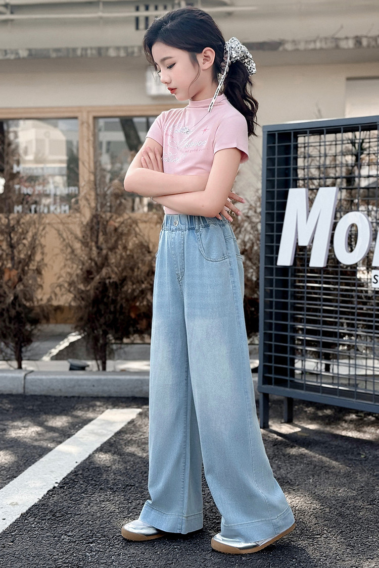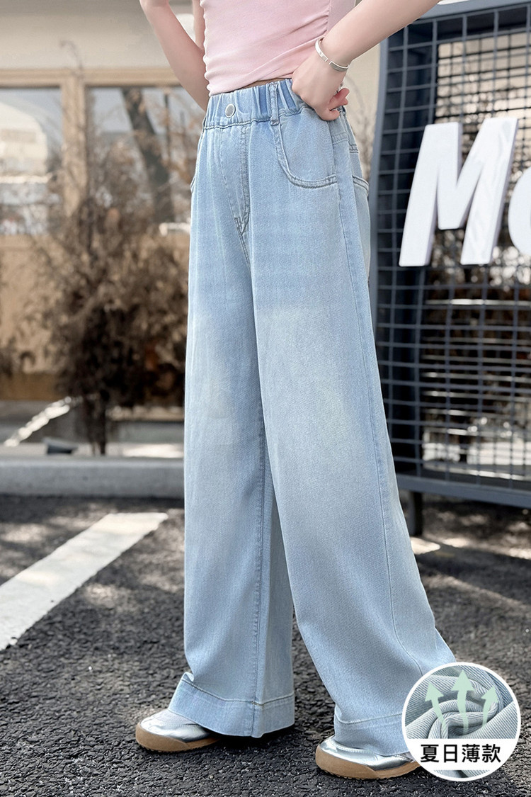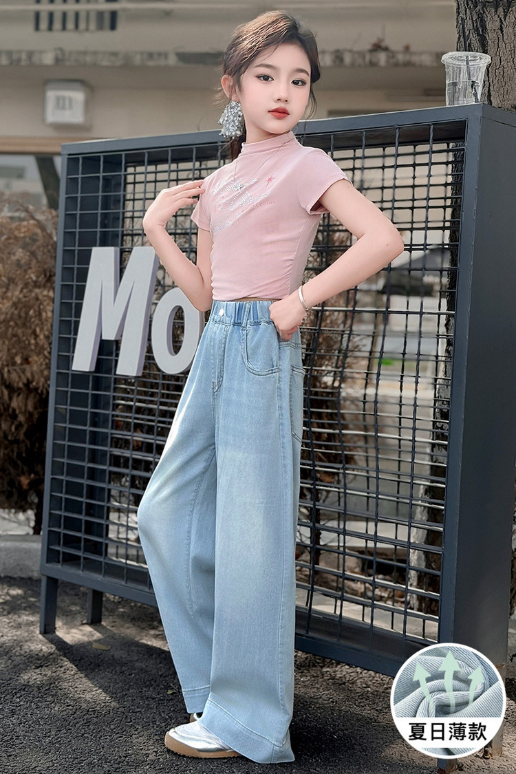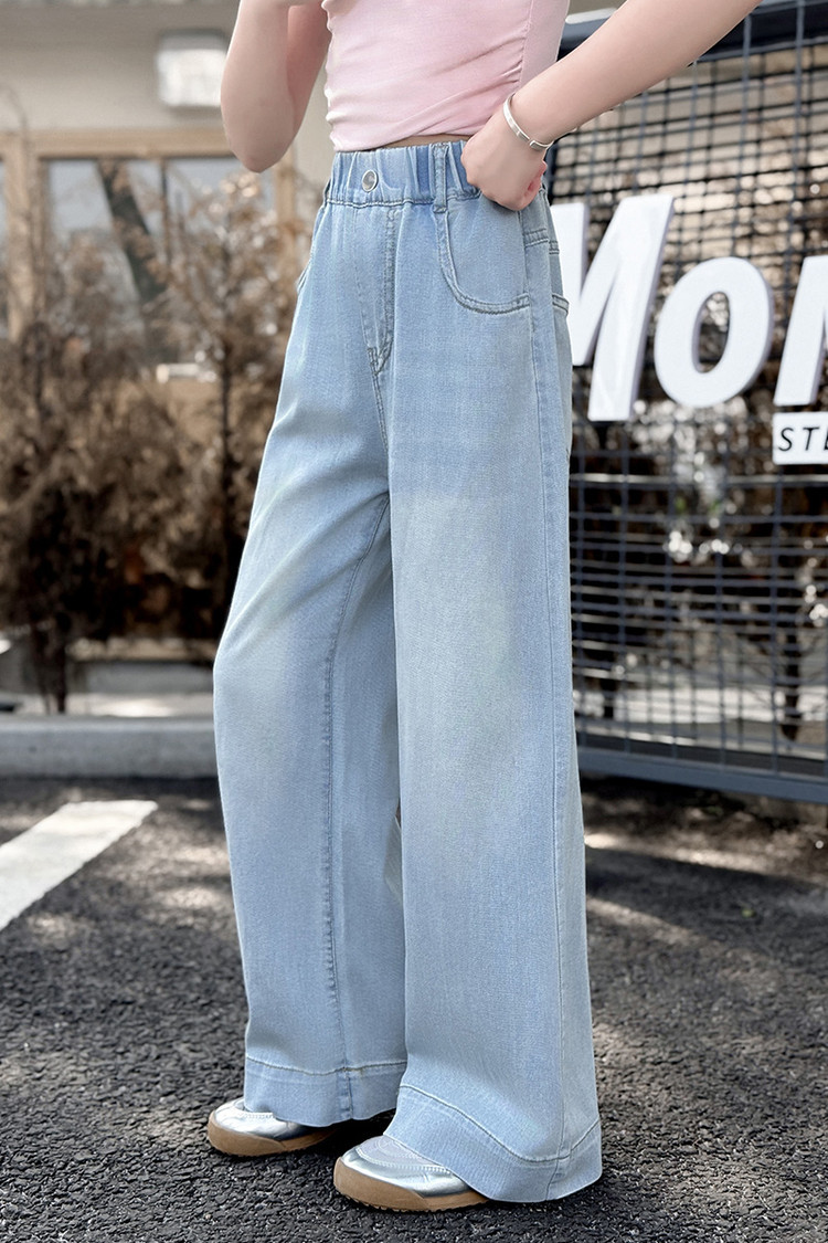 여자 데님 넓은 다리 바지 여름 얇은 2025 새로운 소녀 큰 아이 느슨한 유행 뒷 포켓 컬러 스트립 스트레이트 바지 유행스토어 가기