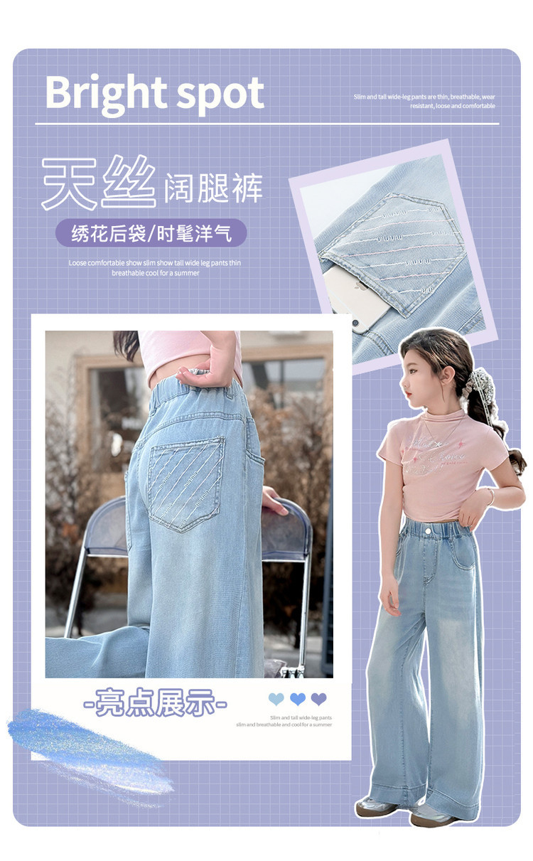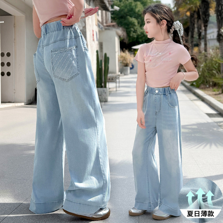 여자 데님 넓은 다리 바지 여름 얇은 2025 새로운 소녀 큰 아이 느슨한 유행 뒷 포켓 컬러 스트립 스트레이트 바지 유행
