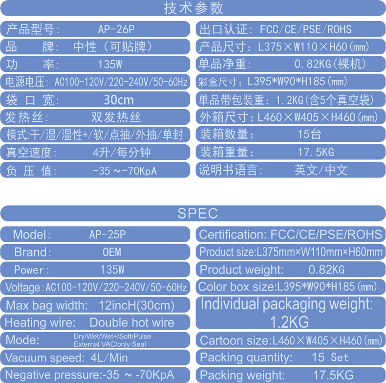 • AP-25P 중국 중립 국내 샘플 버전 단일 펌프 이중 열선 220V + 진공 백 5개 + 외부 펌핑 튜브(영어 색상 상자, 생산 주소 없음, 상표 없음)