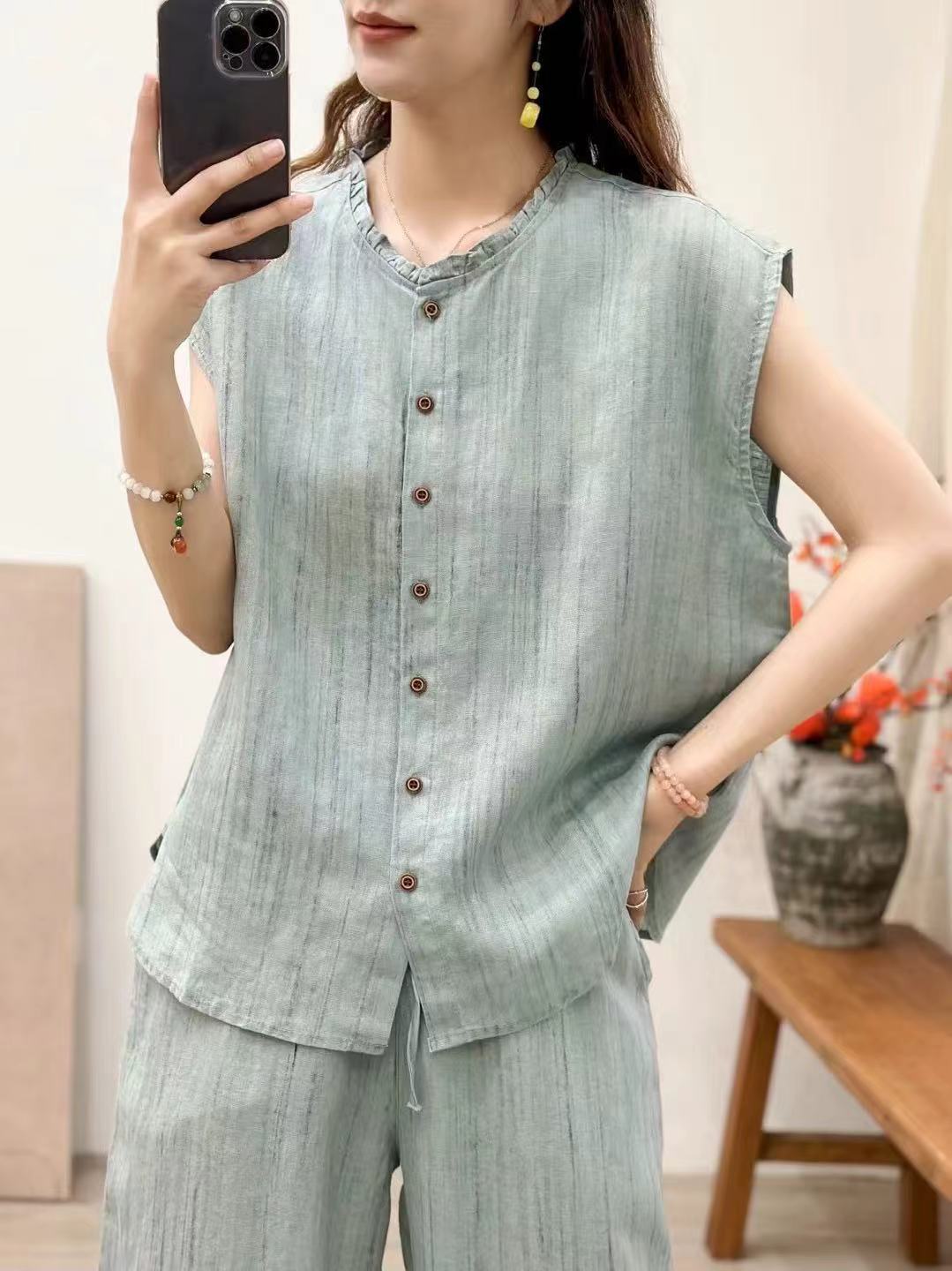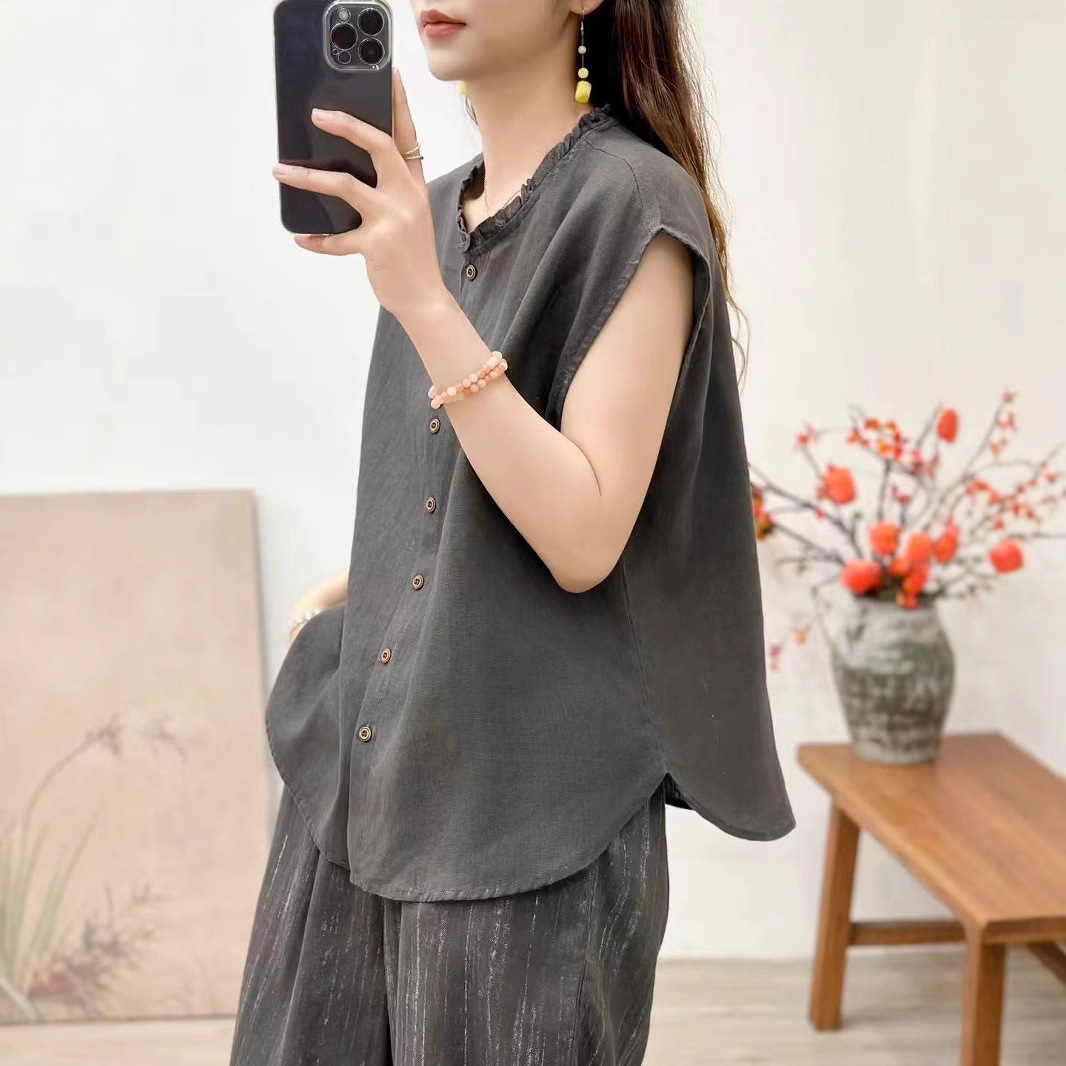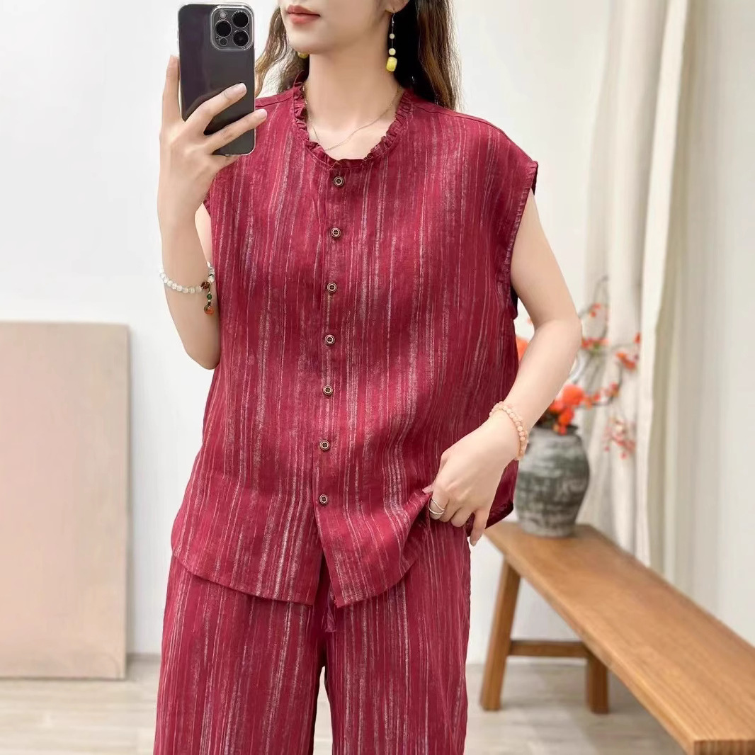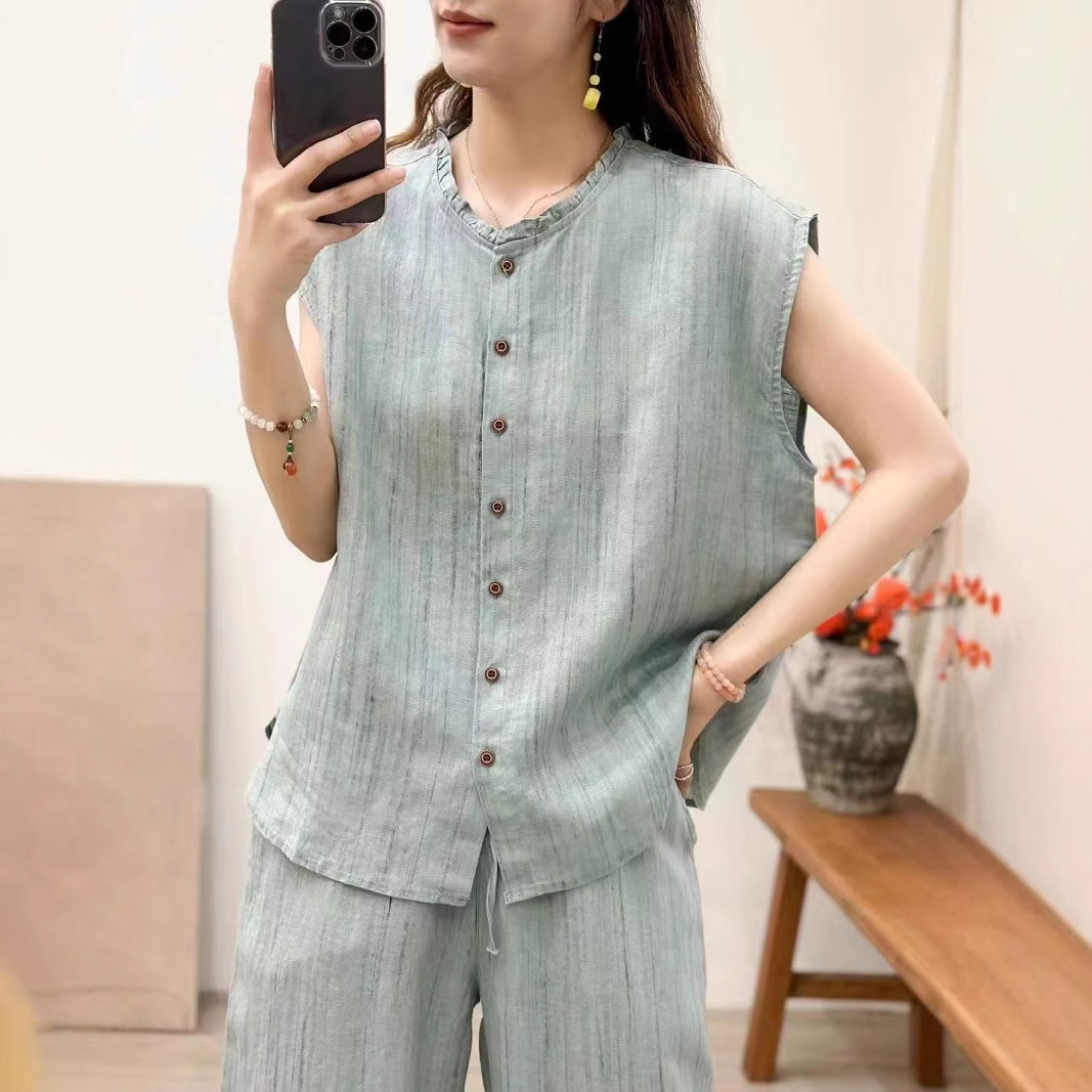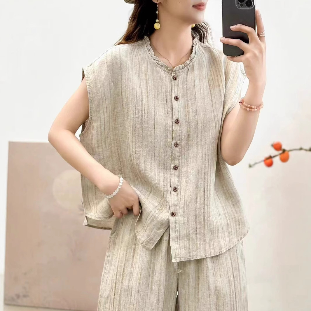 2025 봄 여름 신상 순수 아마 머리카락 칼라 민소매 조끼 루즈한 복고풍 문학 세로 스트립 여성 외부 조끼