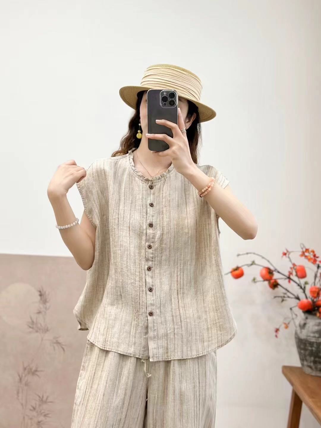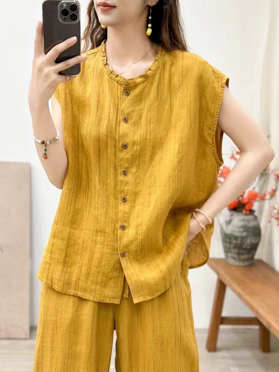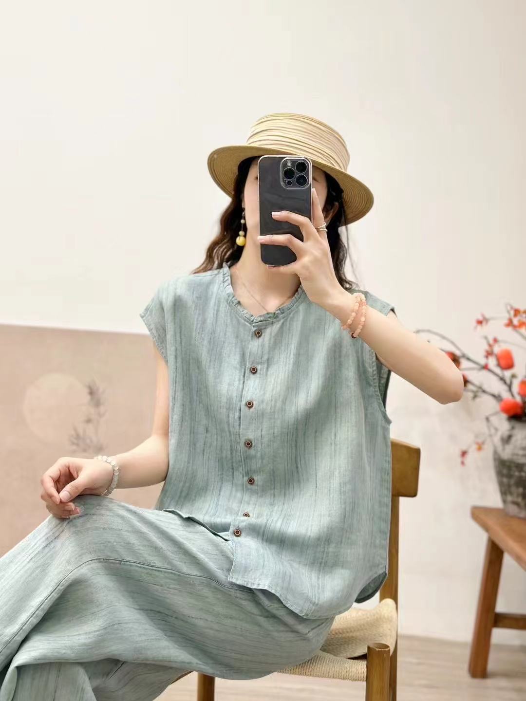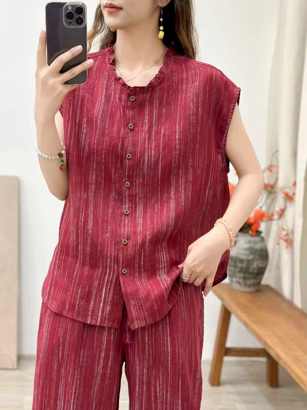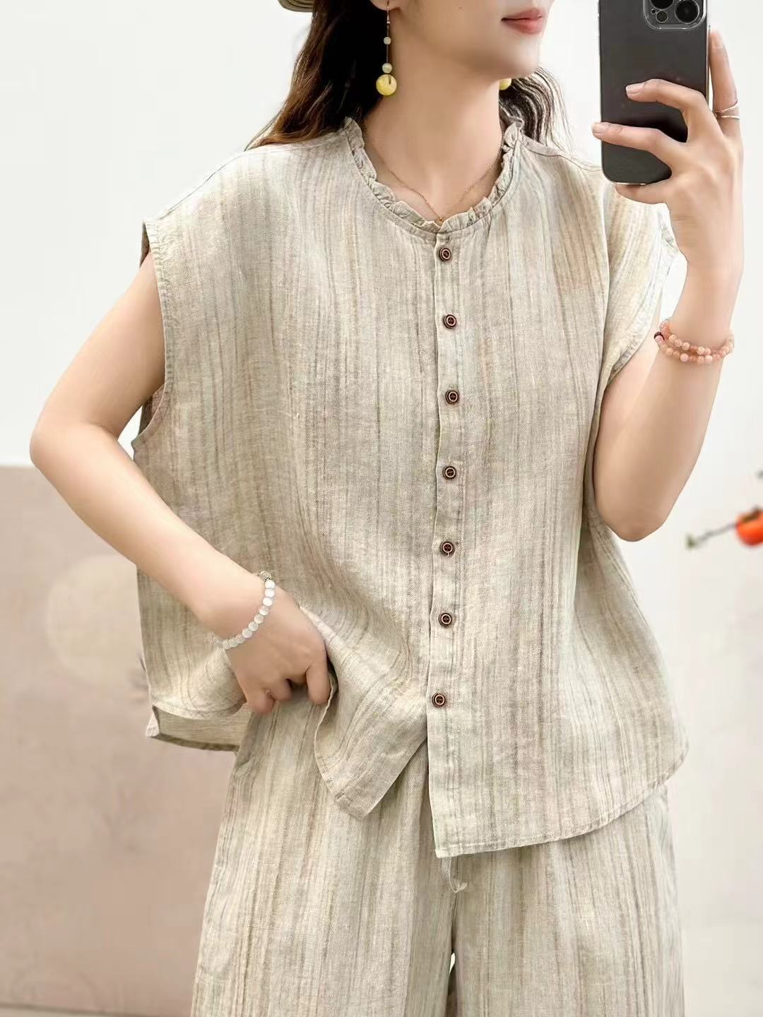 2025 봄 여름 신상 순수 아마 머리카락 칼라 민소매 조끼 루즈한 복고풍 문학 세로 스트립 여성 외부 조끼