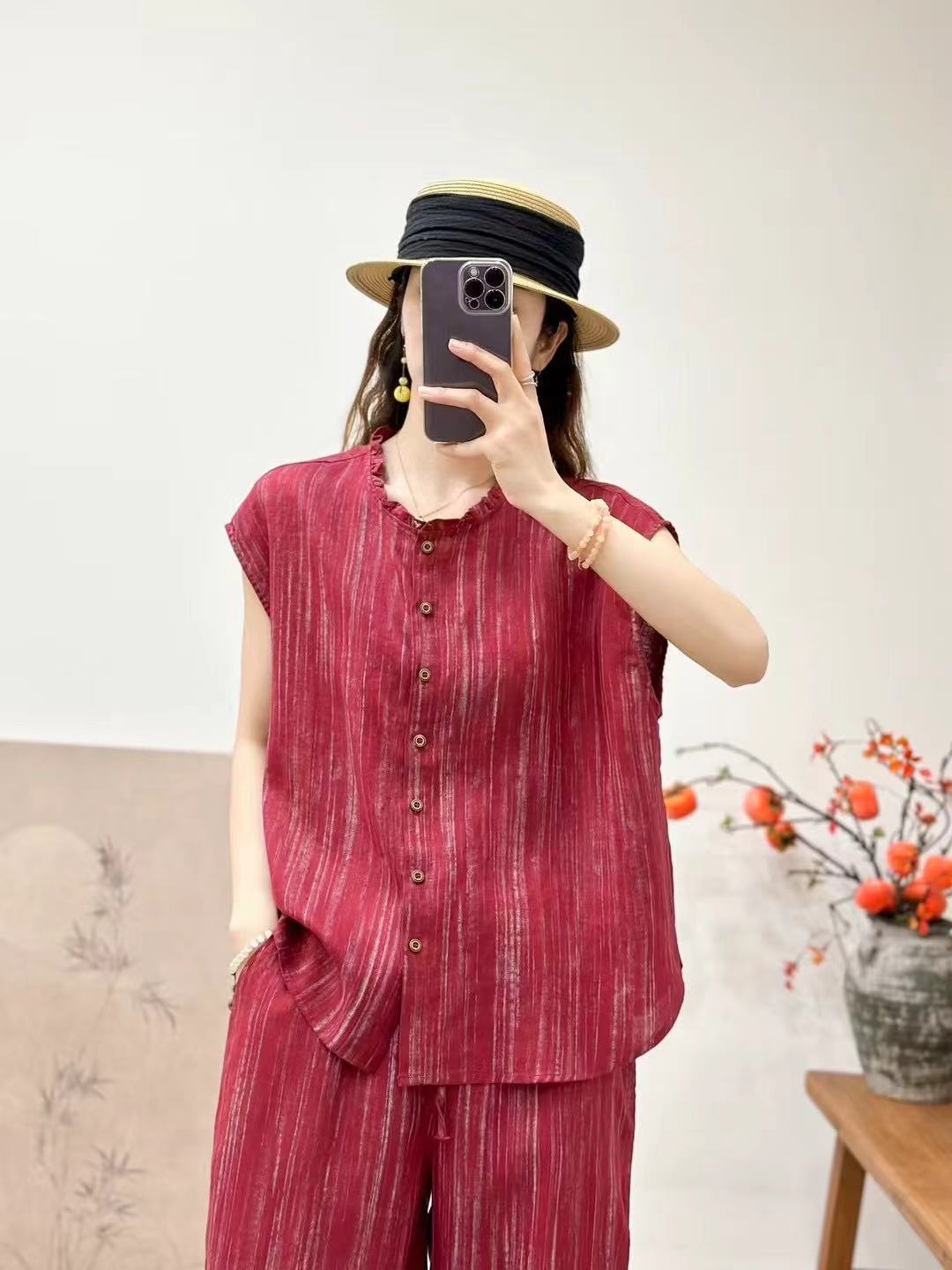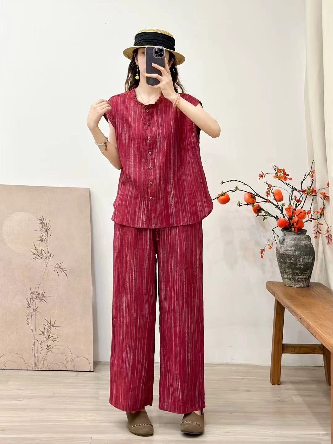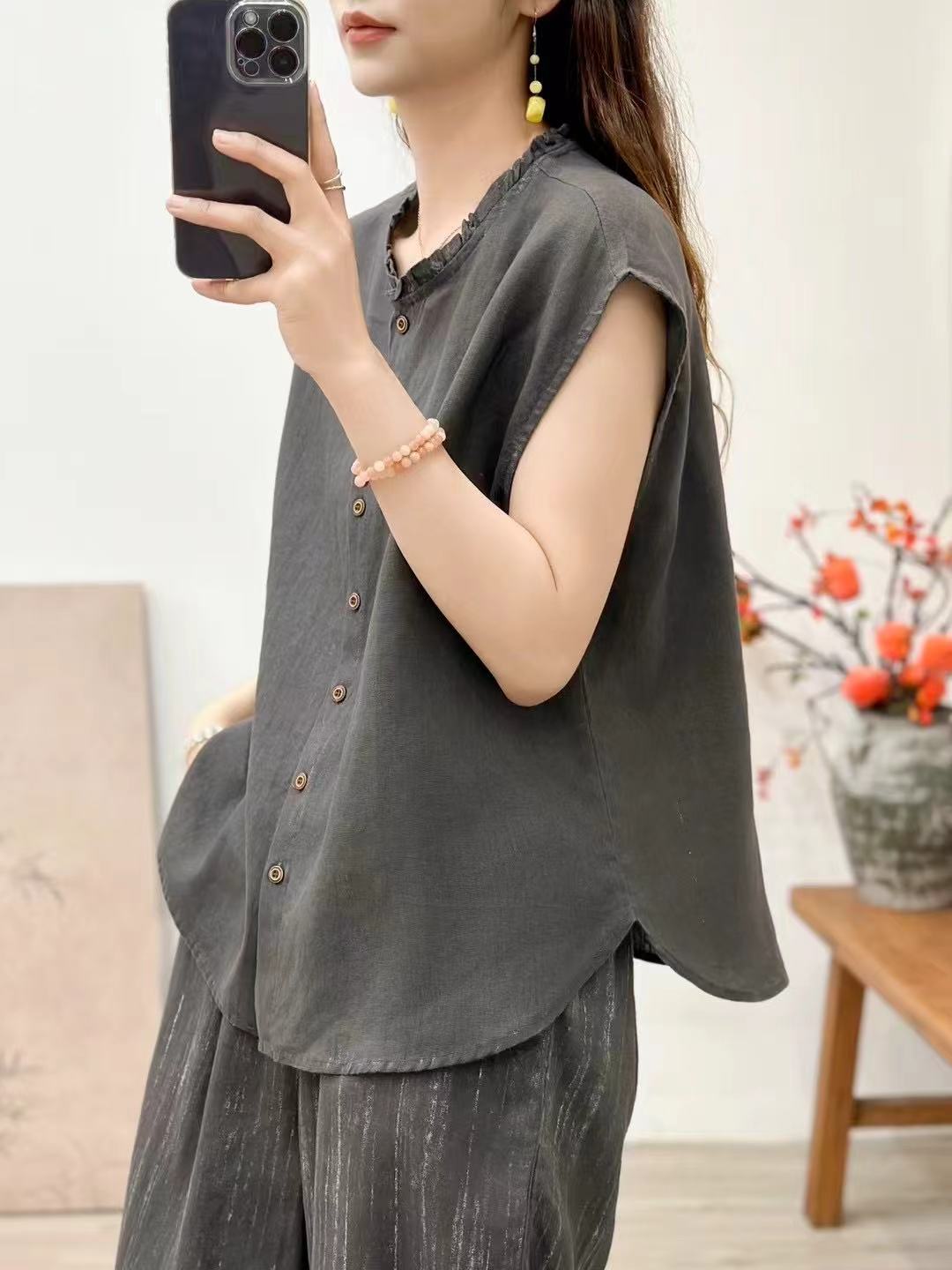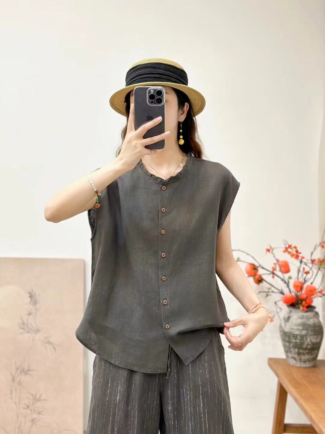 2025 봄 여름 신상 순수 아마 머리카락 칼라 민소매 조끼 루즈한 복고풍 문학 세로 스트립 여성 외부 조끼