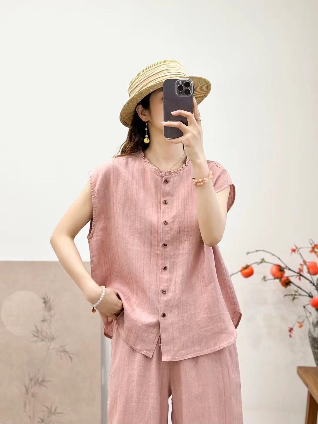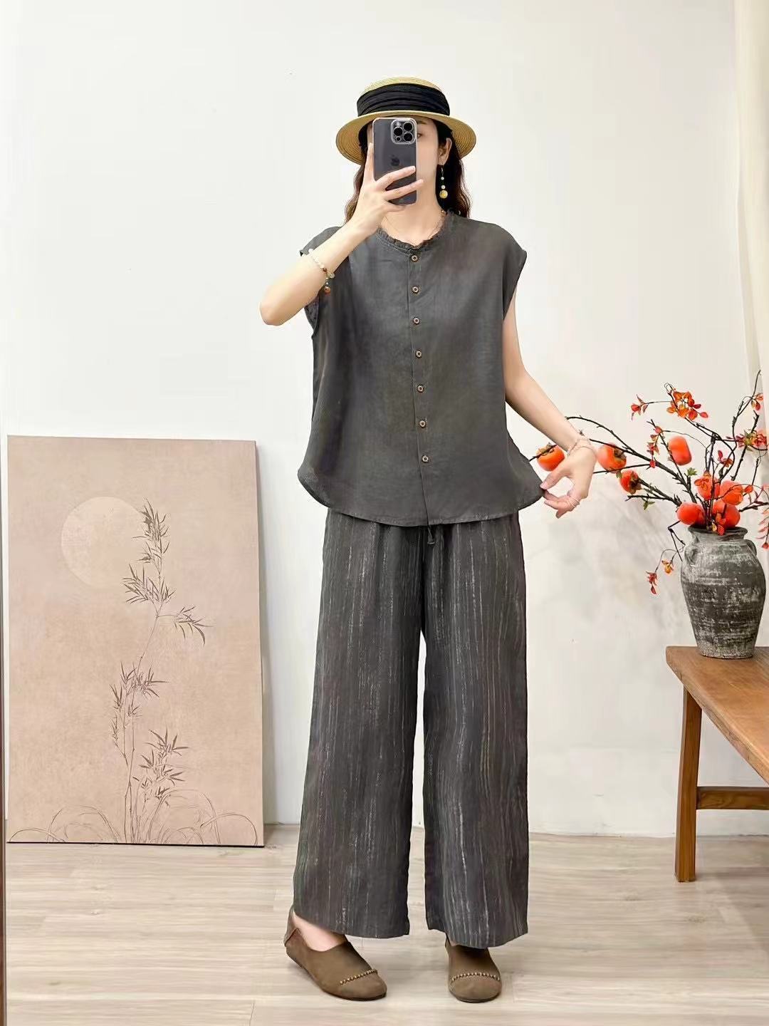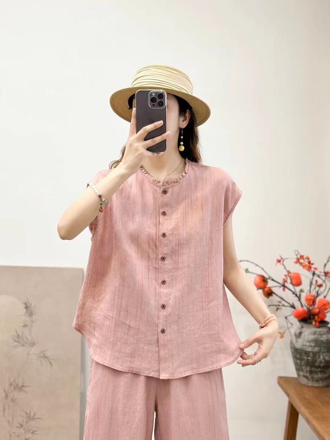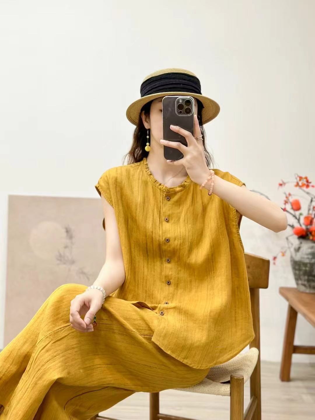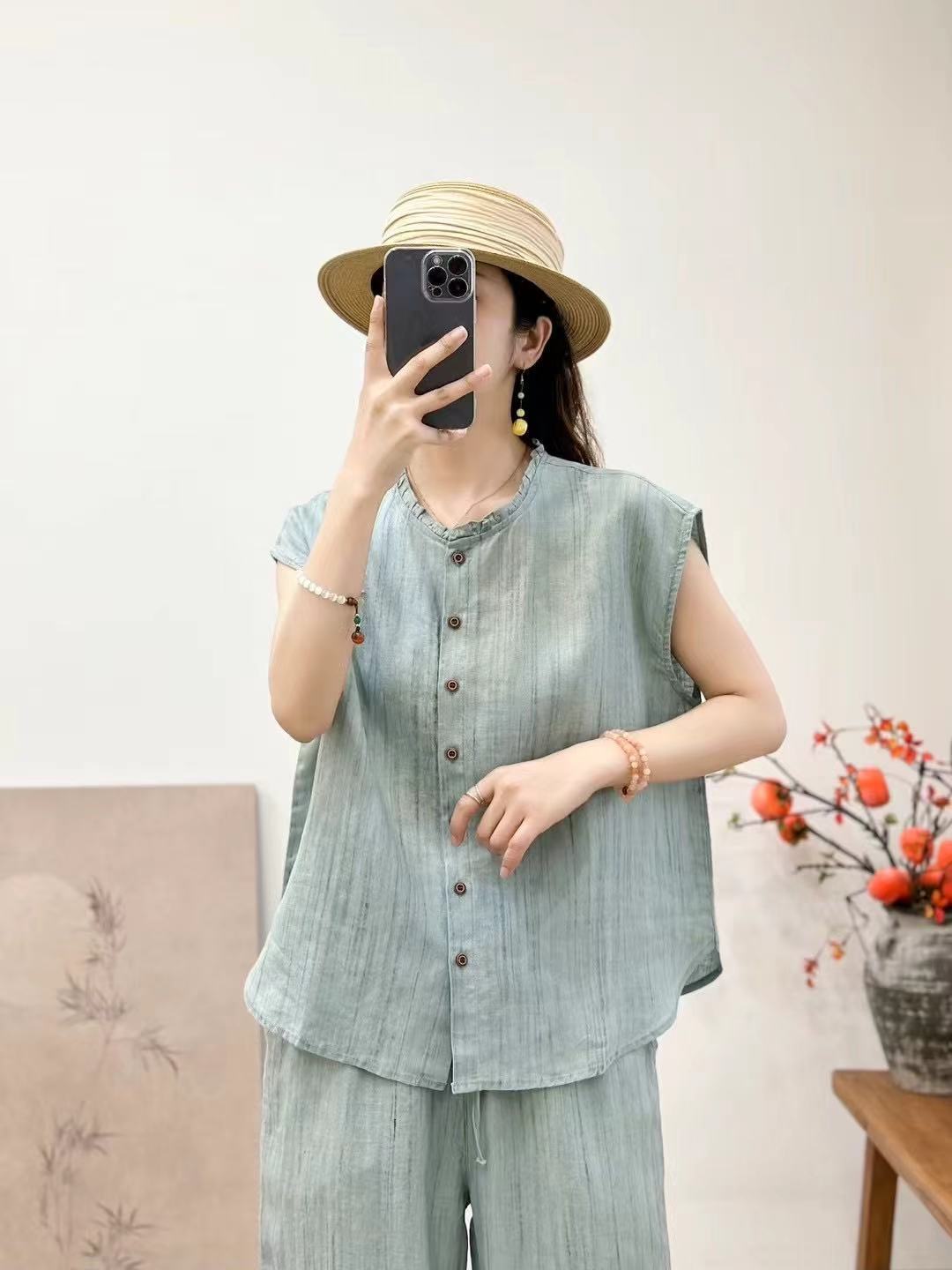 2025 봄 여름 신상 순수 아마 머리카락 칼라 민소매 조끼 루즈한 복고풍 문학 세로 스트립 여성 외부 조끼