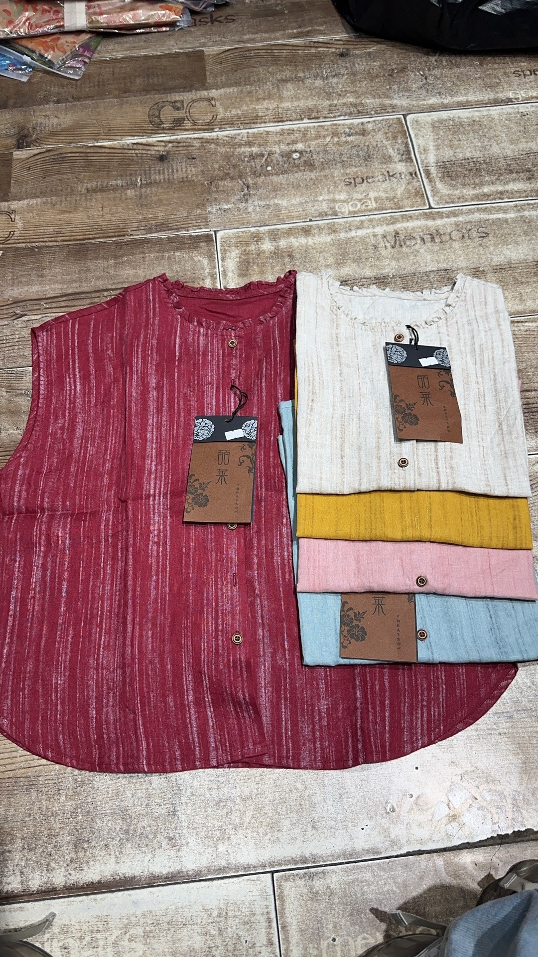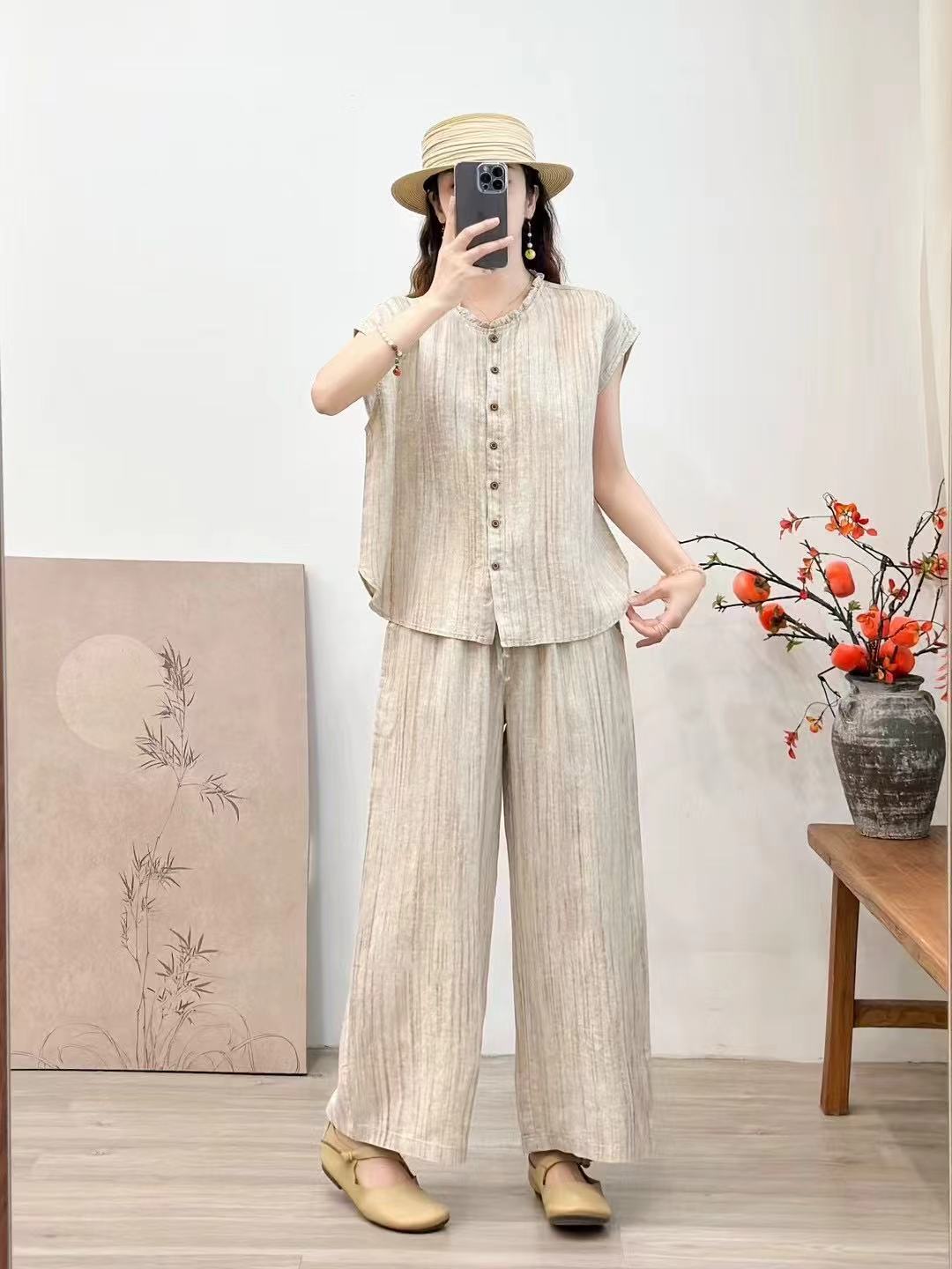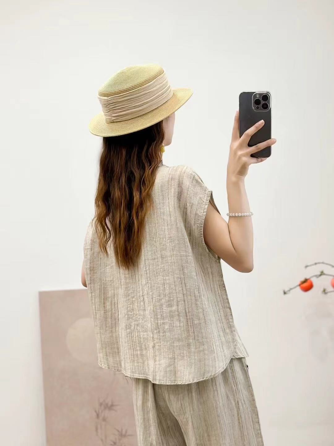 2025 봄 여름 신상 순수 아마 머리카락 칼라 민소매 조끼 루즈한 복고풍 문학 세로 스트립 여성 외부 조끼스토어 가기
