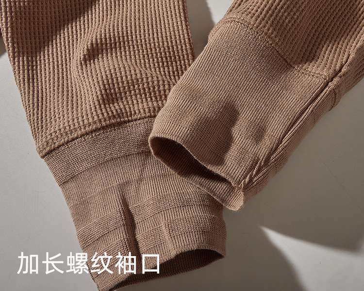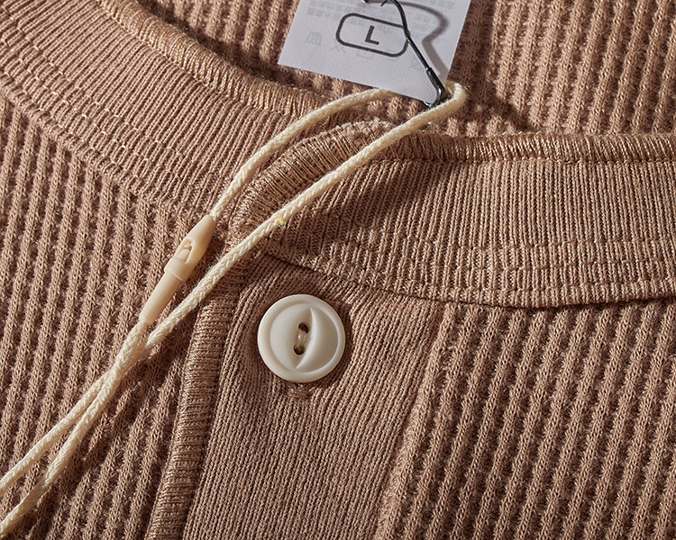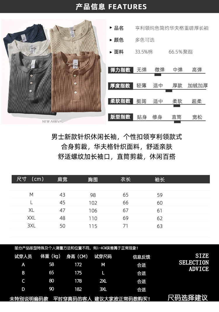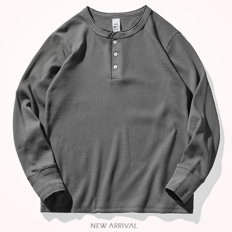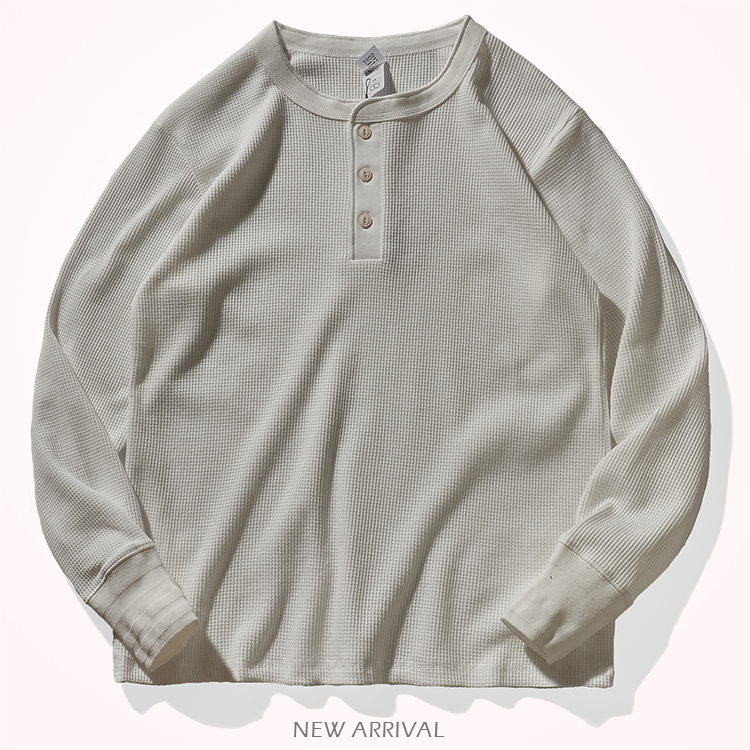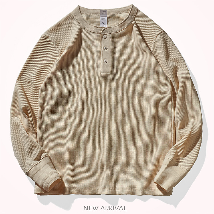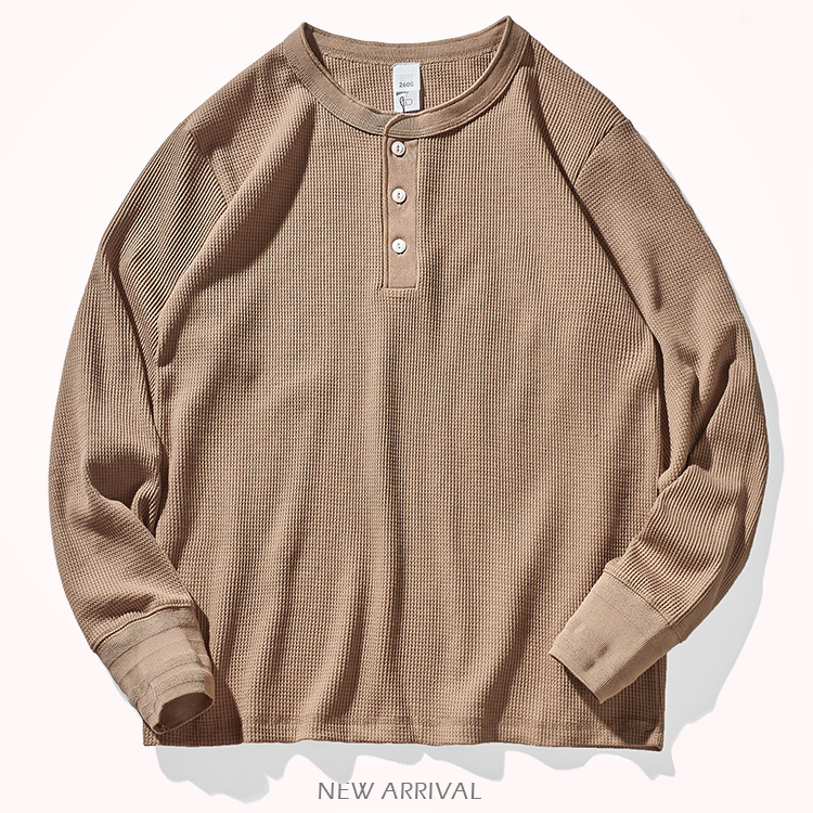260g 헤비급 와플 헨리 칼라 남성용 솔리드 컬러 루즈 니트 풀오버 셔츠 캐주얼 긴팔 티셔츠스토어 가기