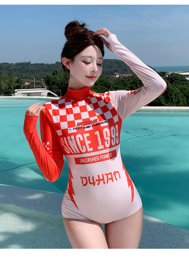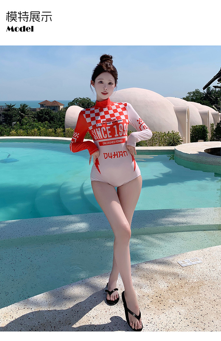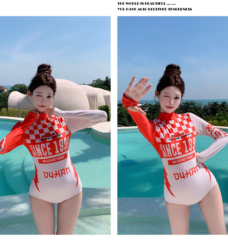 2025 신형 수영복 한국식 비키니 보수적인 배 커버 슬리밍 원피스 레드 긴팔 서핑 잠수복스토어 가기