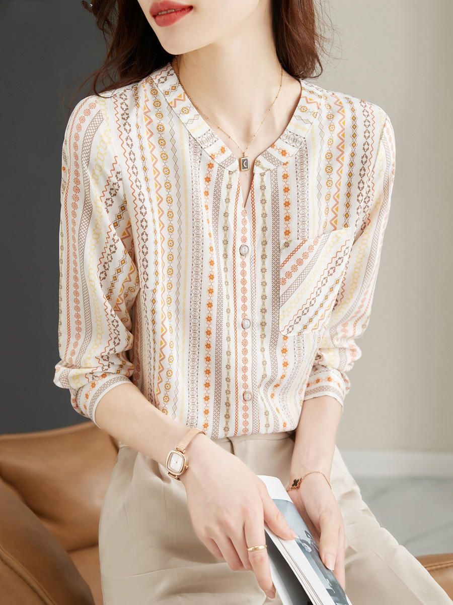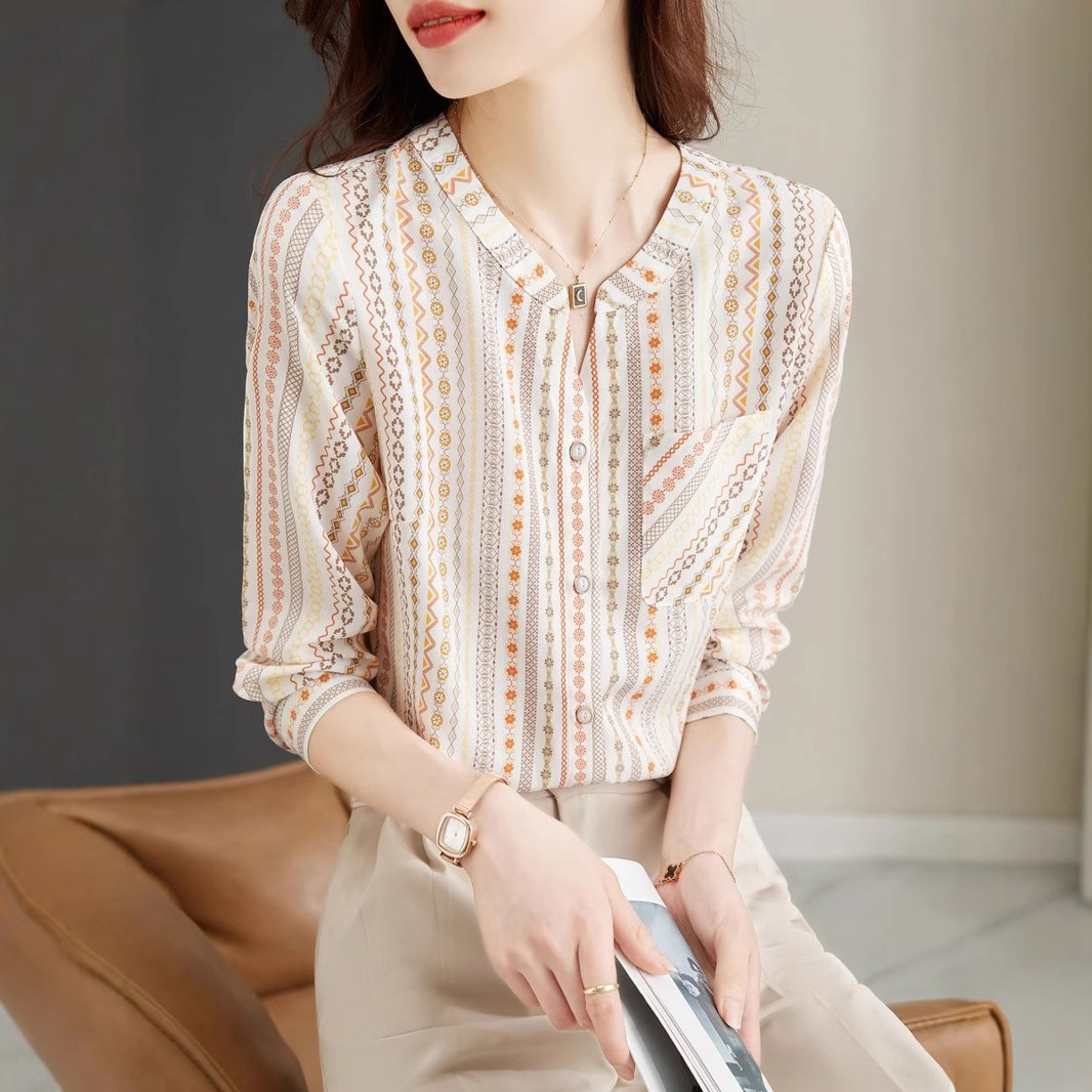 스트라이프 셔츠 2025 봄과 가을 새로운 V-넥 긴 소매 우아한 패션 올 매치 슬림 여성 셔츠 패션 올 매치스토어 가기