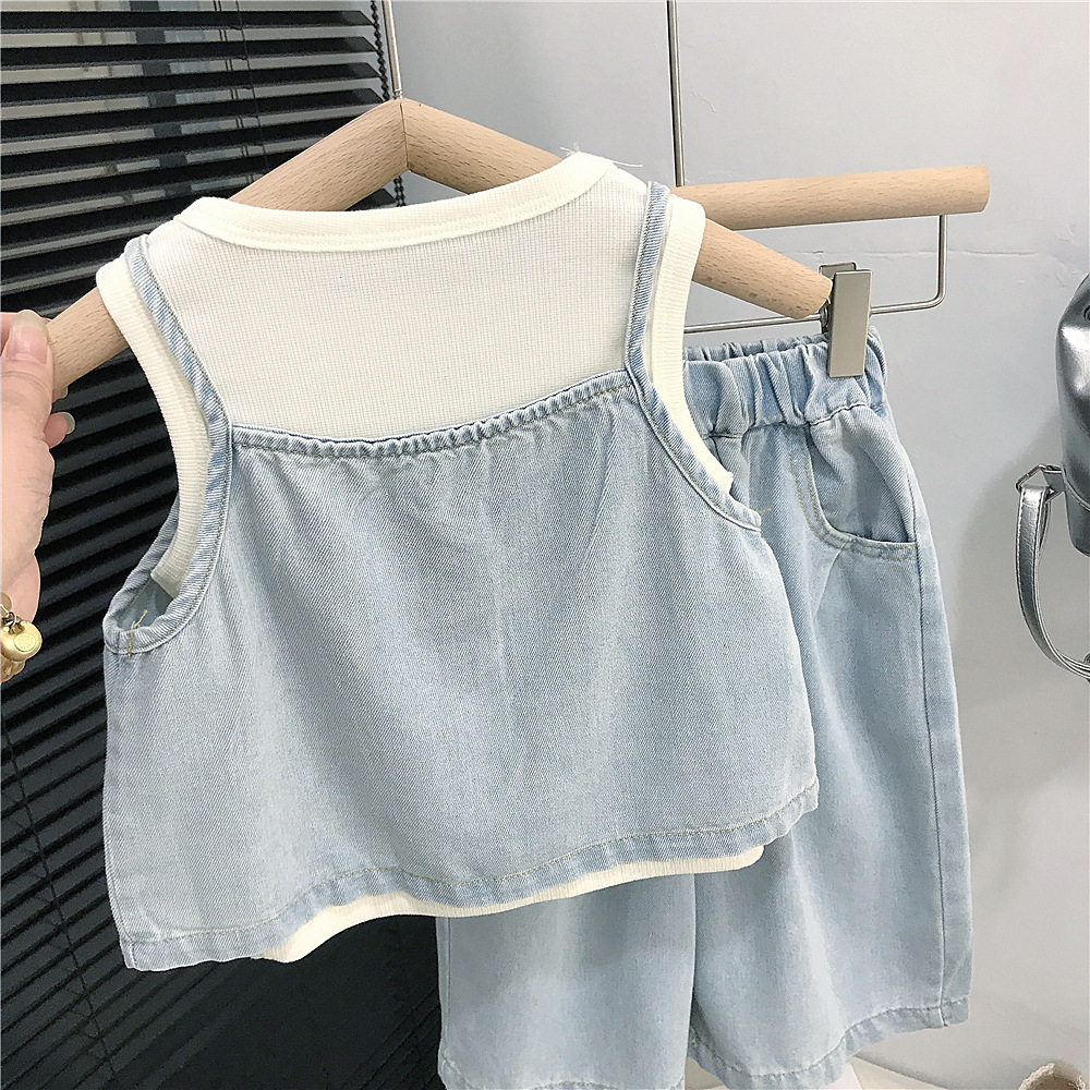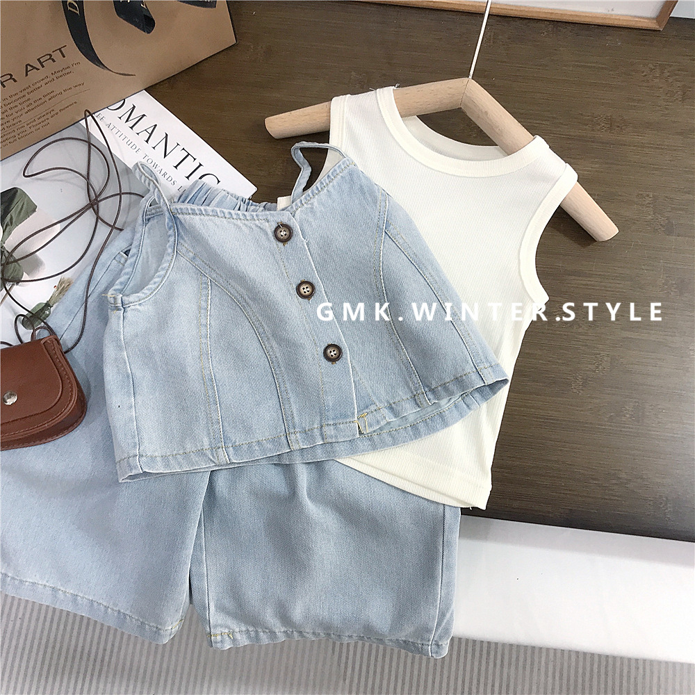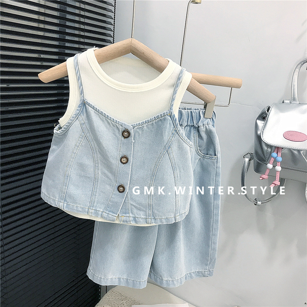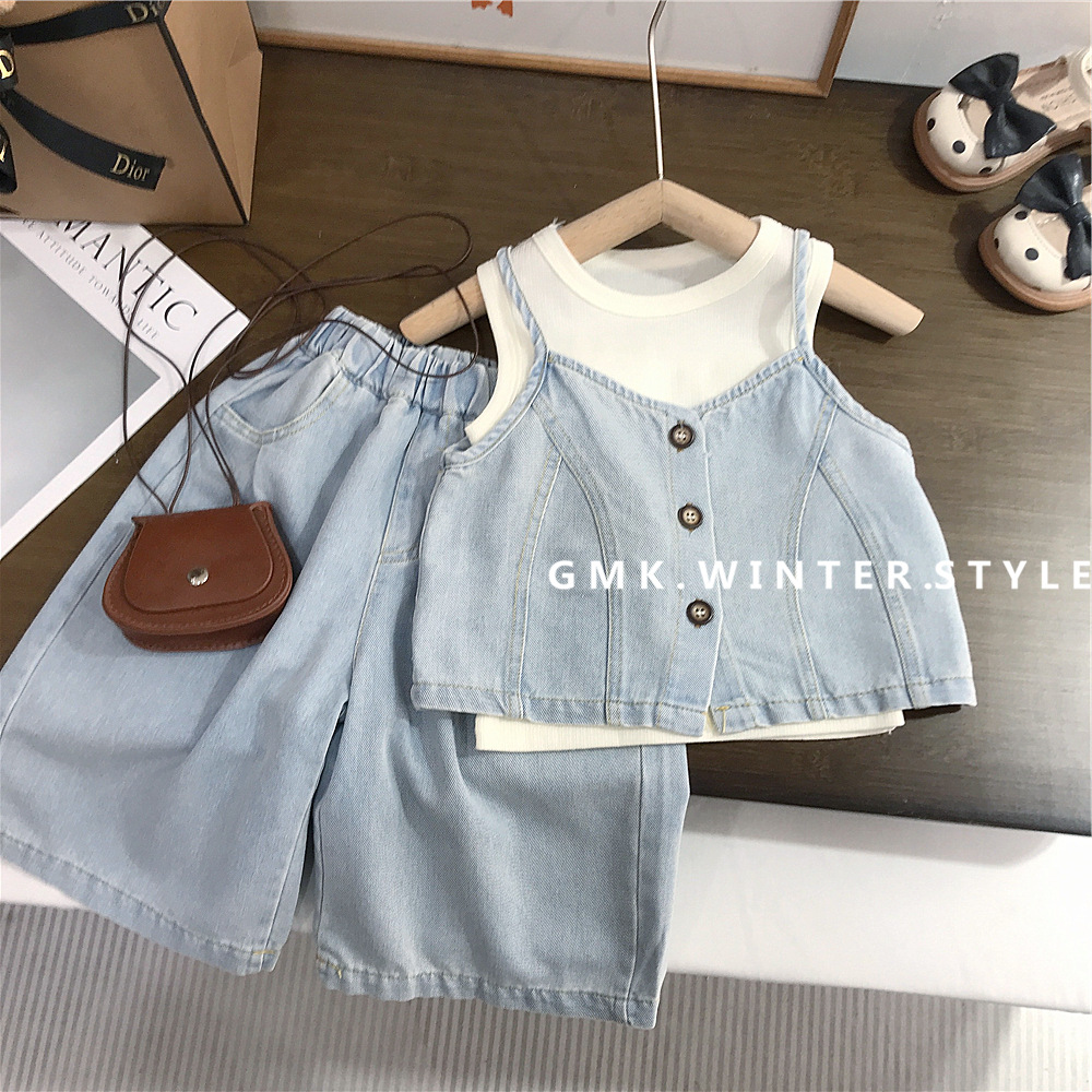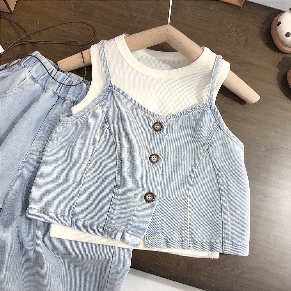 소녀 세트 여름 새로운 스타일 아기 캐미솔 자른 바지 어린이 데님 3 피스 여름 대외 무역스토어 가기