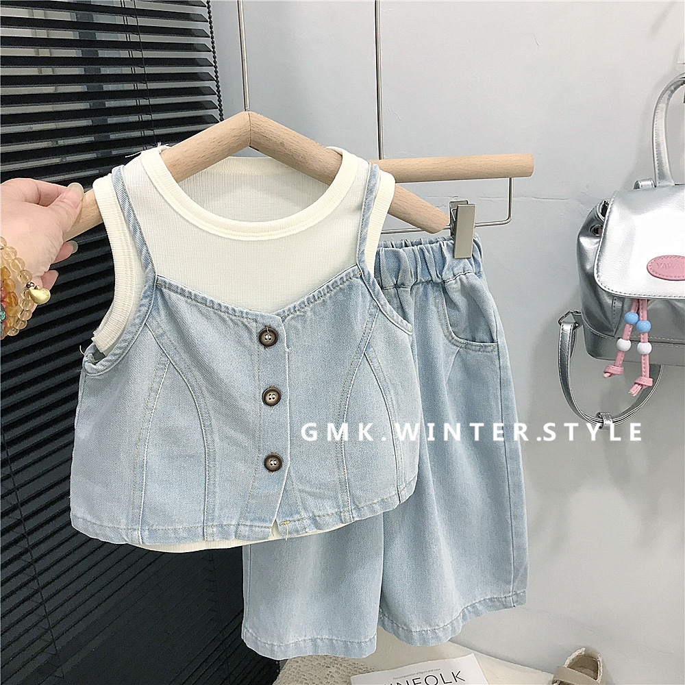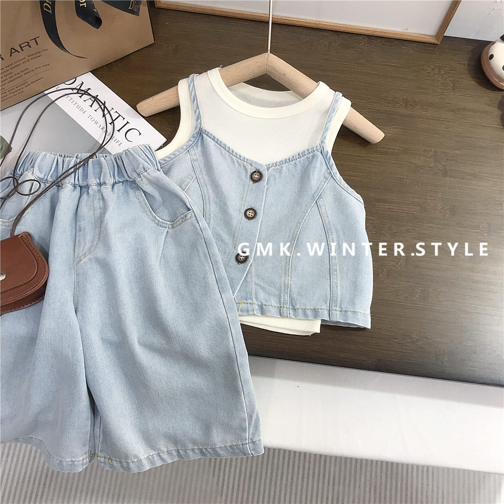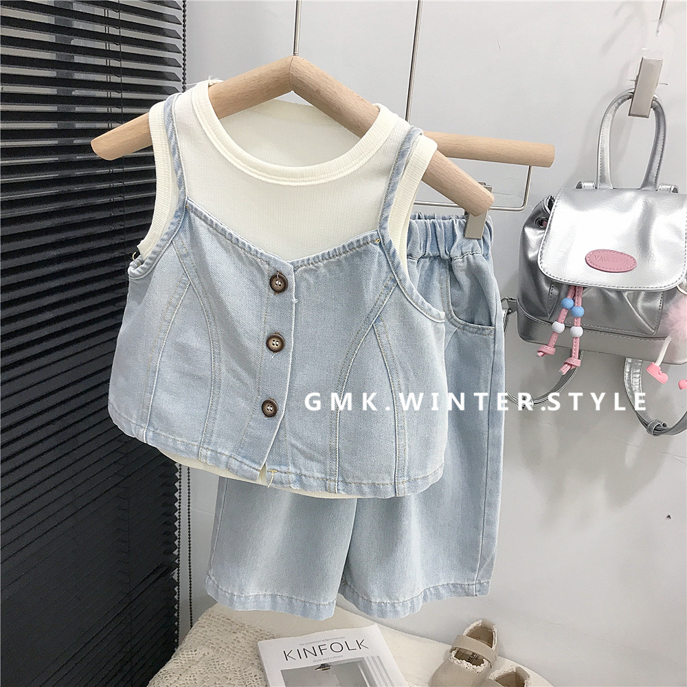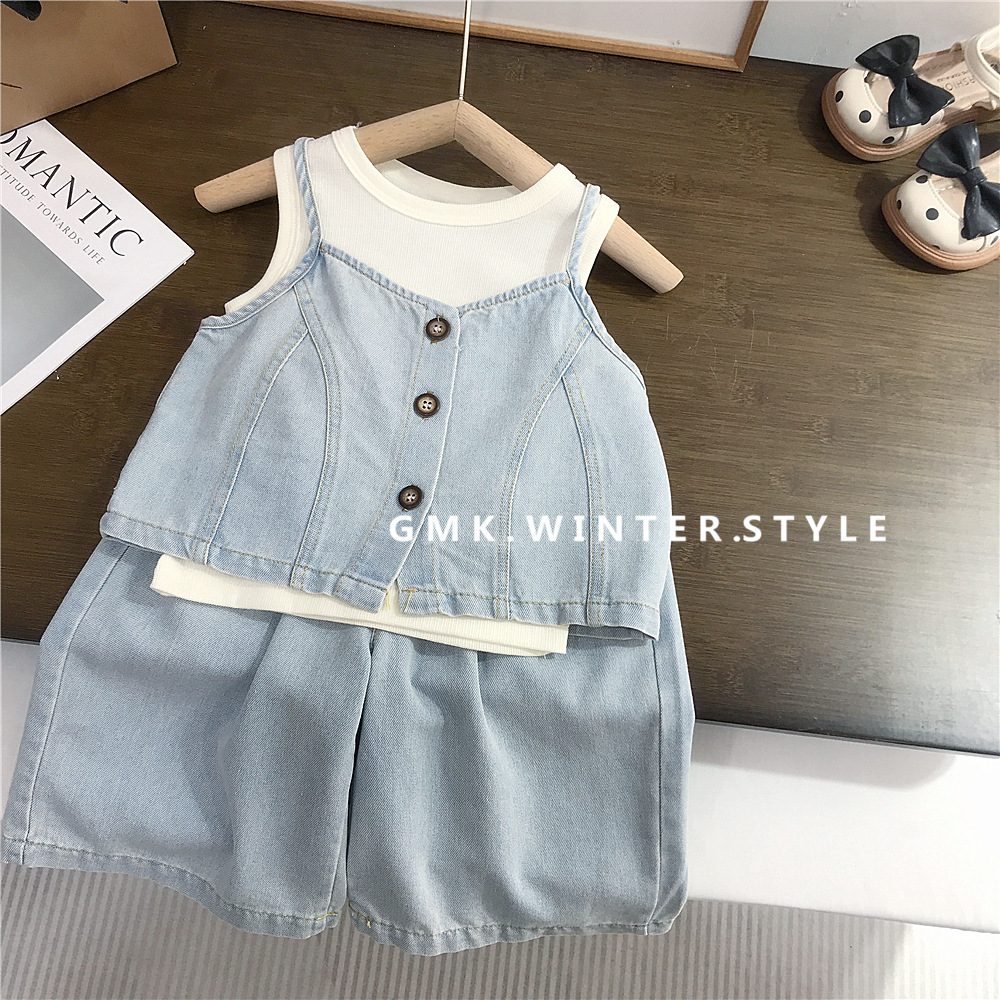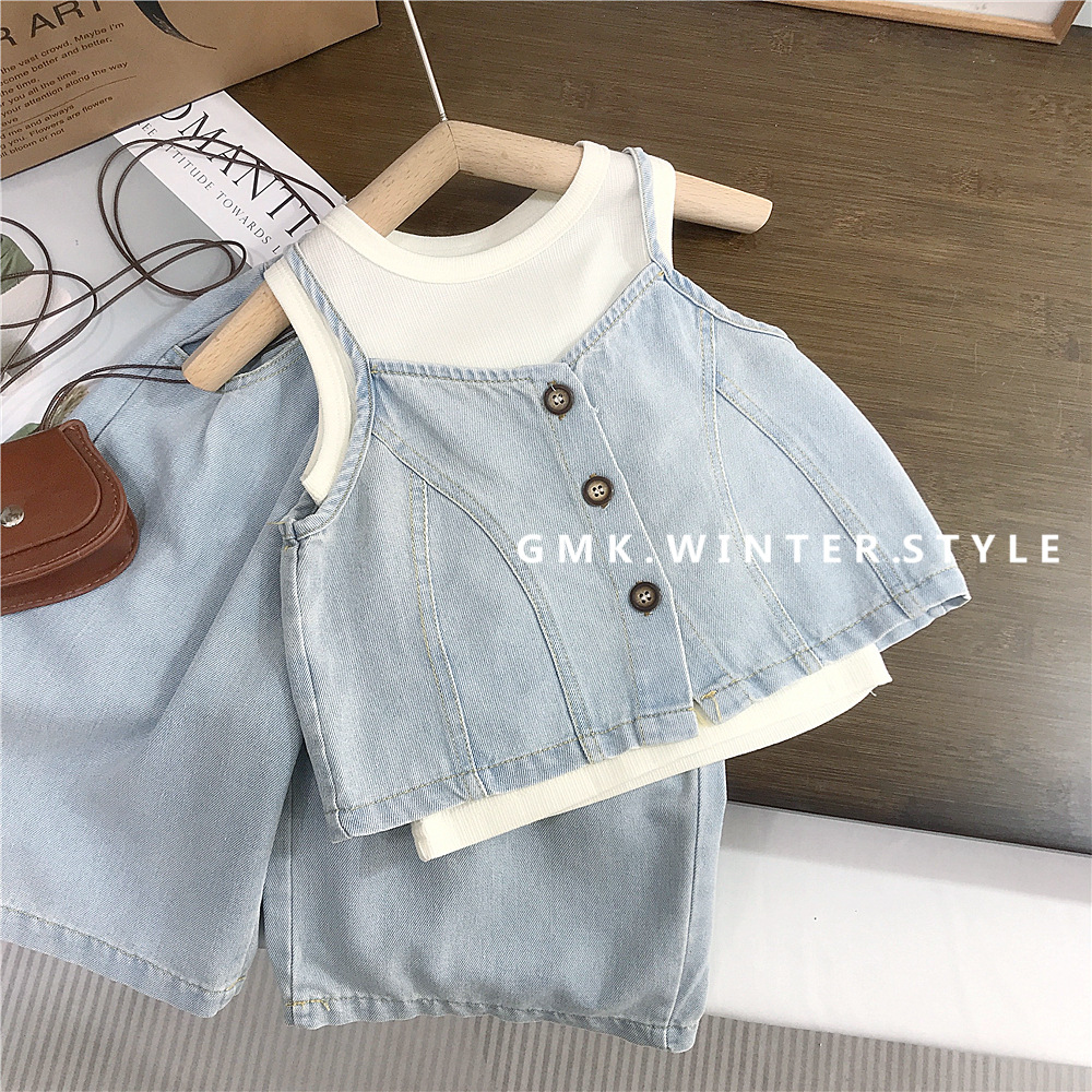 소녀 세트 여름 새로운 스타일 아기 캐미솔 자른 바지 어린이 데님 3 피스 여름 대외 무역스토어 가기