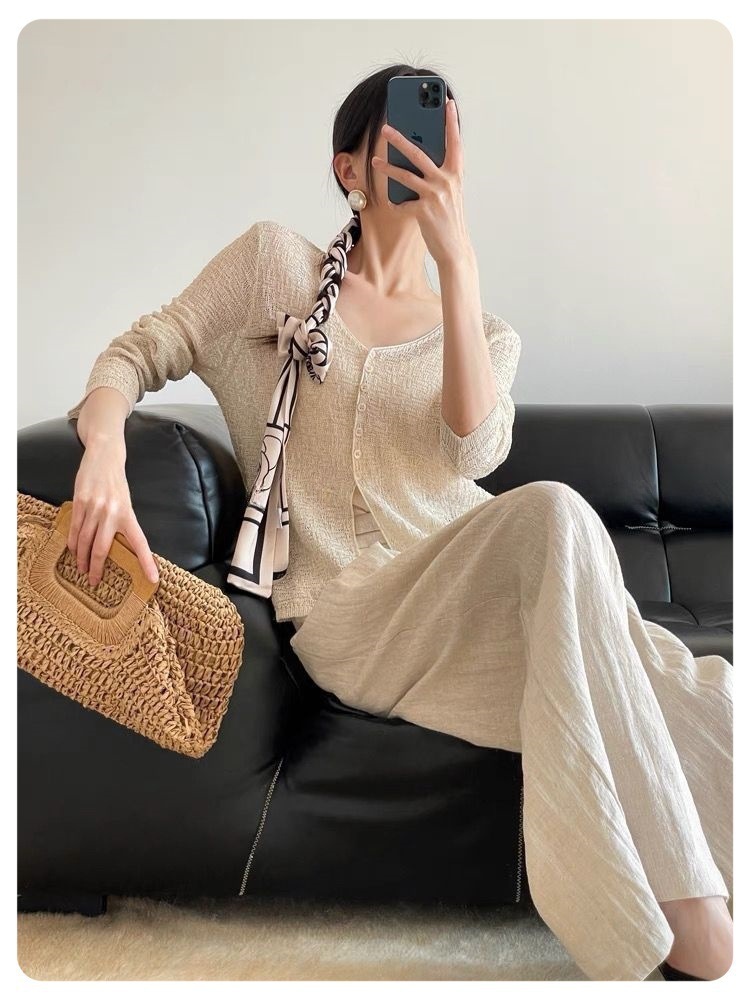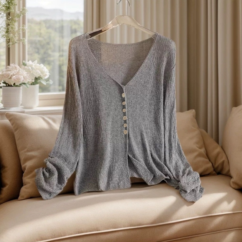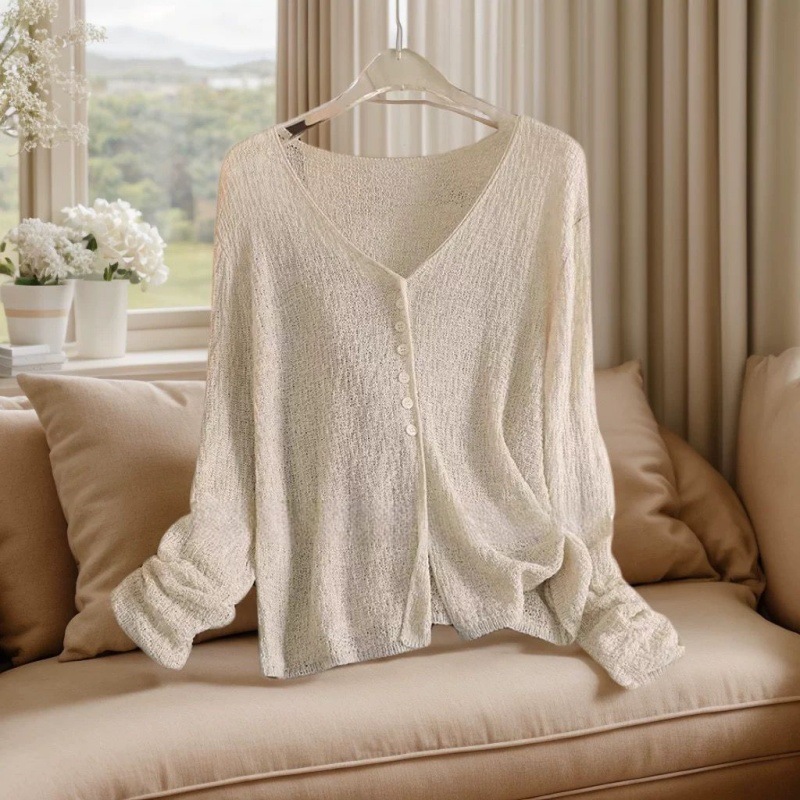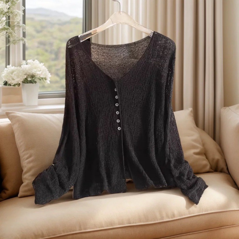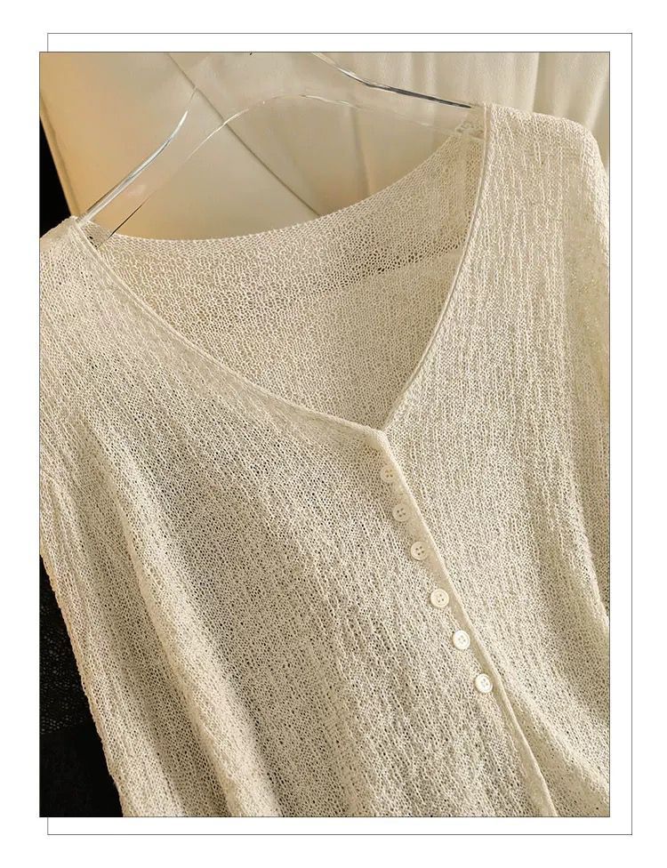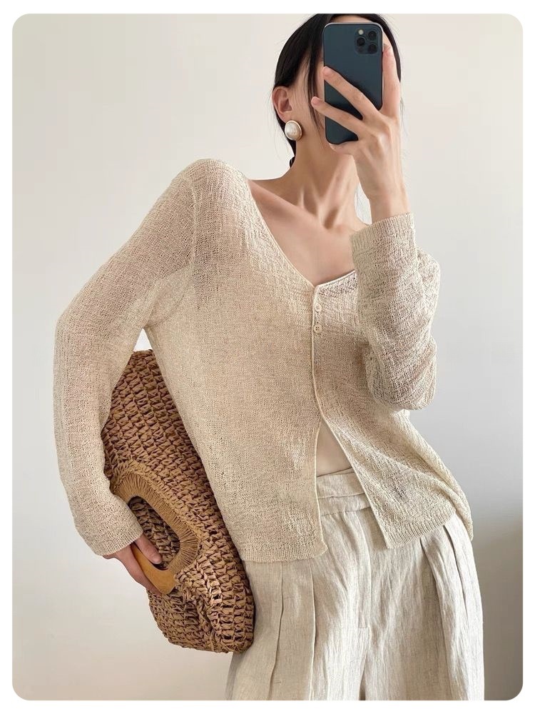 여름 새로운 캐주얼 V 넥 리넨 싱글 브레스트 할로우 투명 마이크로 투명 얇은 선 스크린 니트 스웨터 작은 카디건 재킷