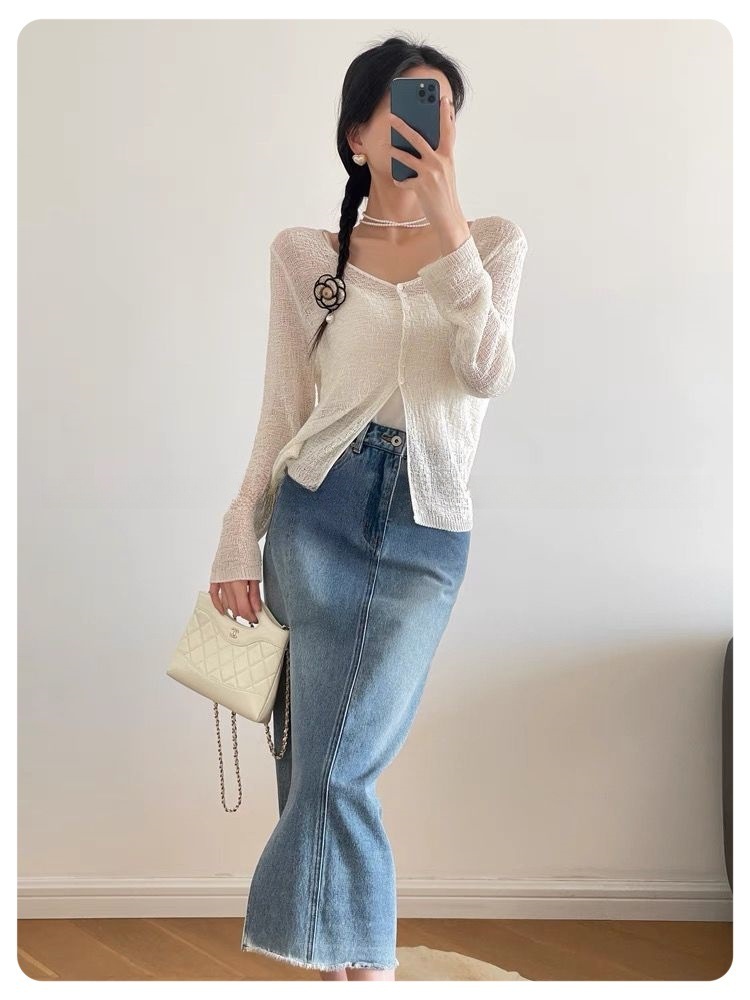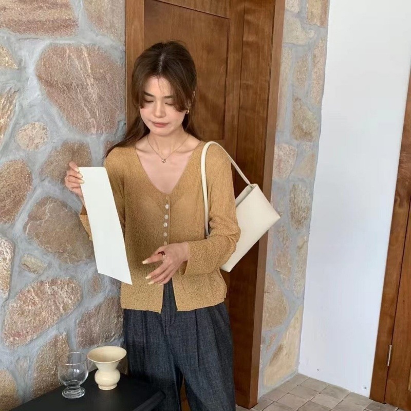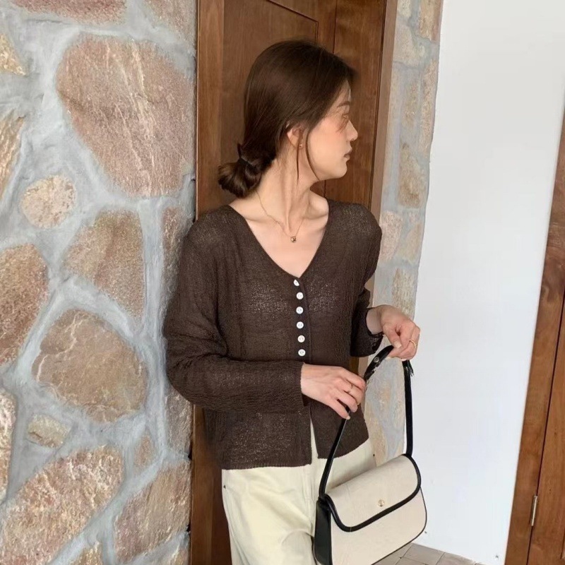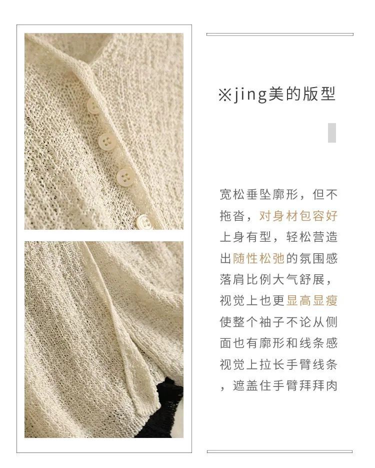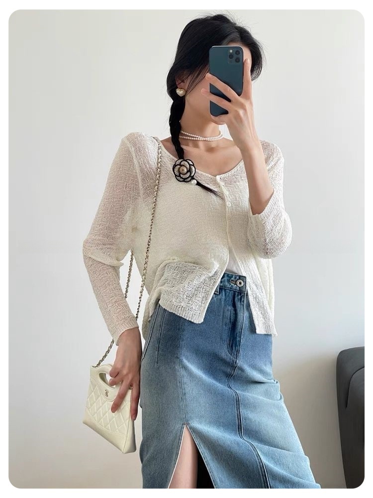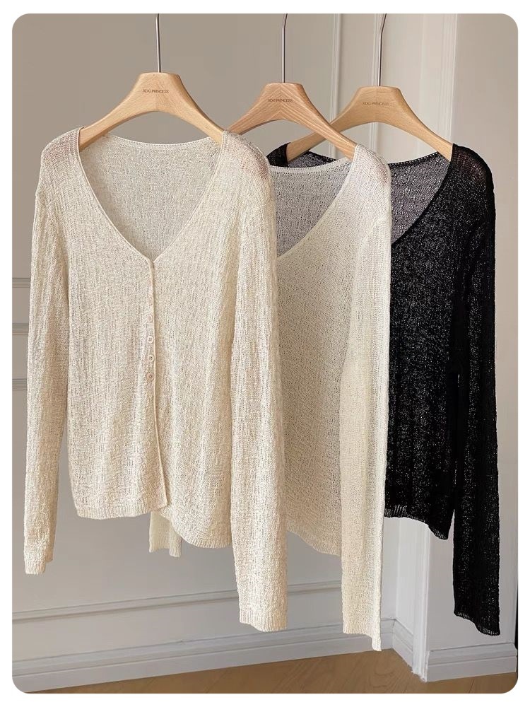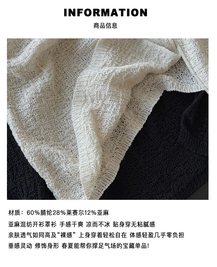 여름 새로운 캐주얼 V 넥 리넨 싱글 브레스트 할로우 투명 마이크로 투명 얇은 선 스크린 니트 스웨터 작은 카디건 재킷스토어 가기