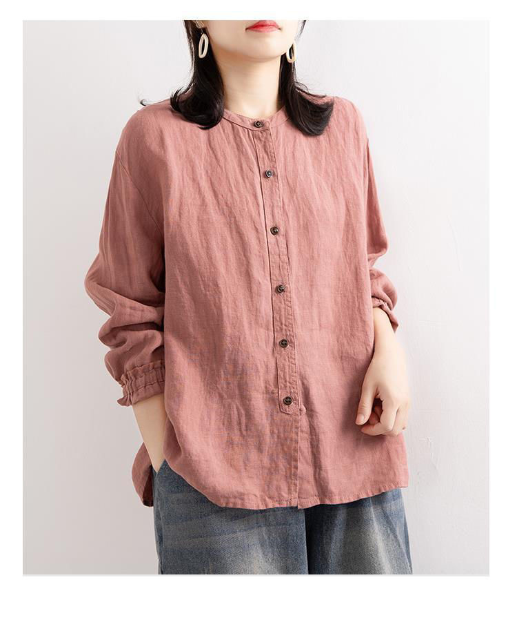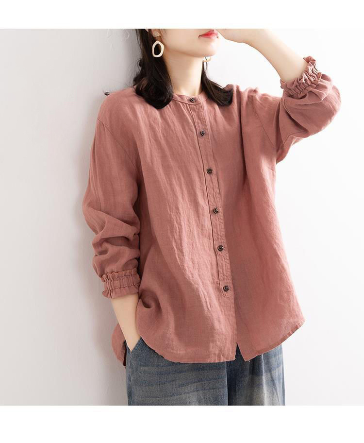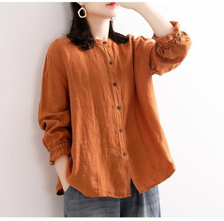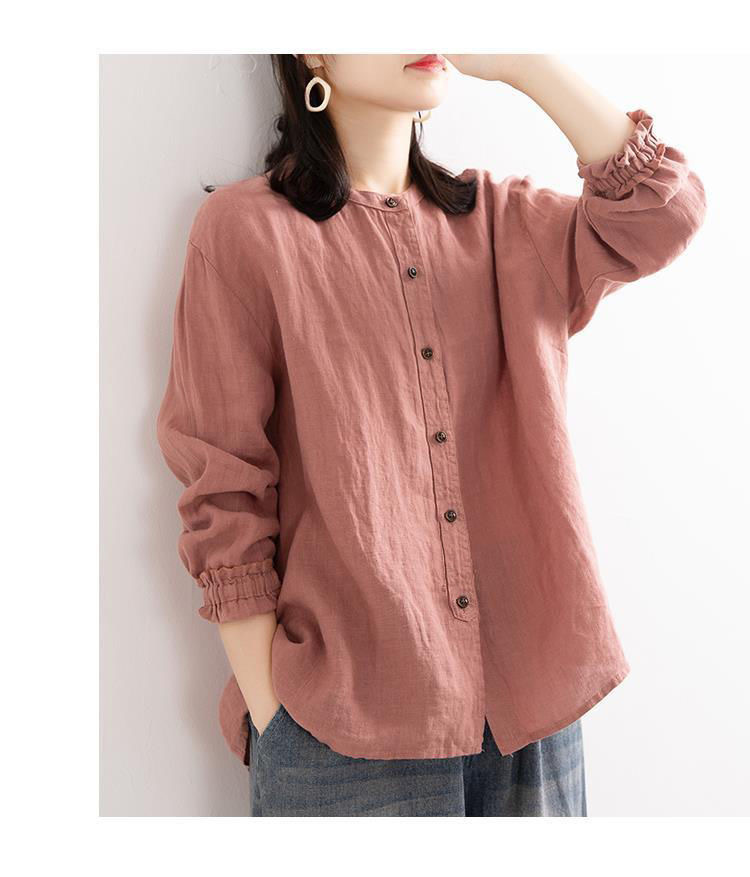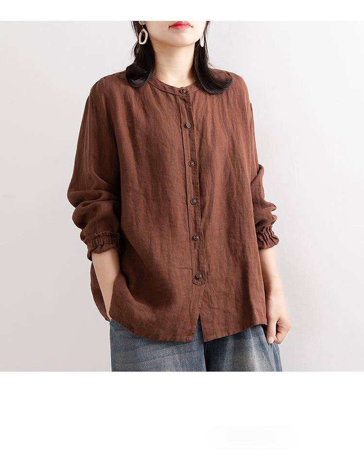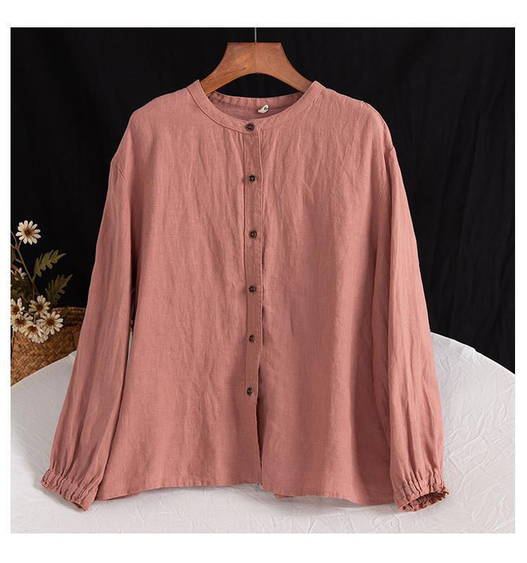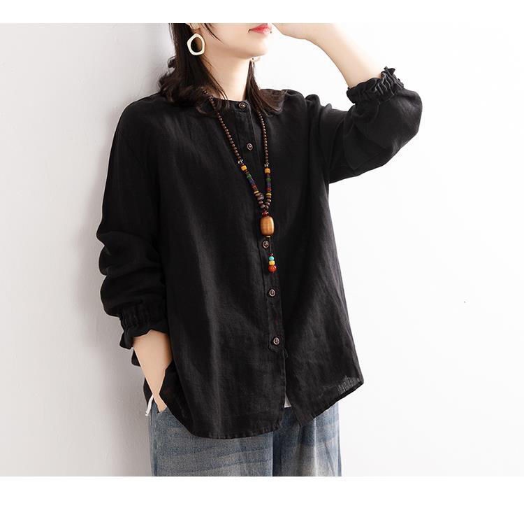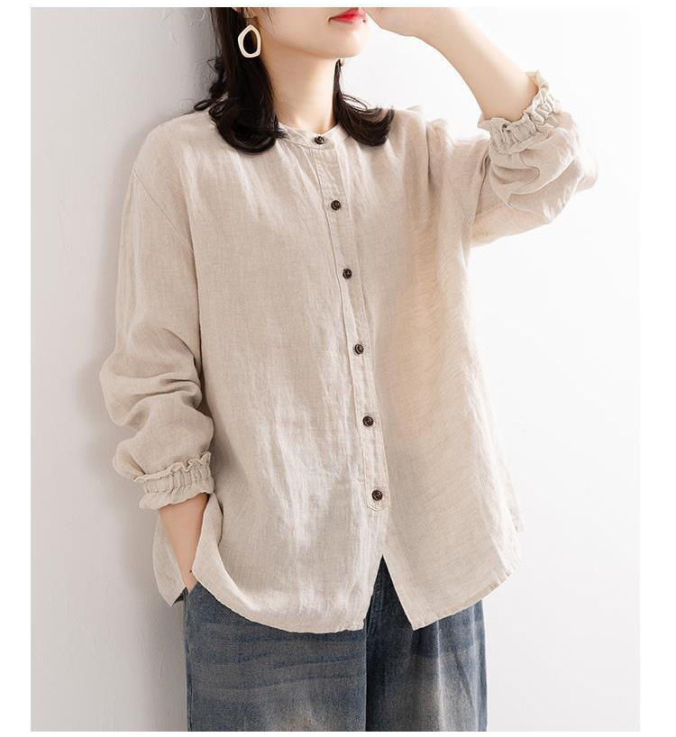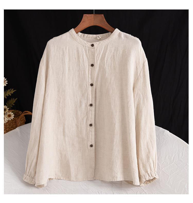 예술적 레트로 봄과 가을 코튼 리넨 셔츠 여성용 루즈 라운드 넥 셔츠 재킷 캐주얼 자켓 넥 슬리브 탑 여성스토어 가기