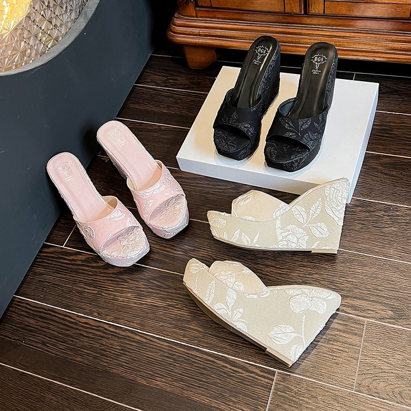 봄과 가을 2024 새로운 국가 스타일 자수 신발 민족 스타일 샌들 두꺼운 단독 플랫폼 하단 쐐기 뒤꿈치 오픈 발가락 느낌