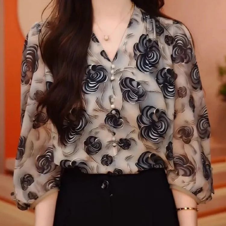 여성을위한 여름 얇은 프렌치 v 넥 프린트 쉬폰 셔츠 2025 새로운 느슨한 7부 소매 셔츠 엄마 탑스토어 가기