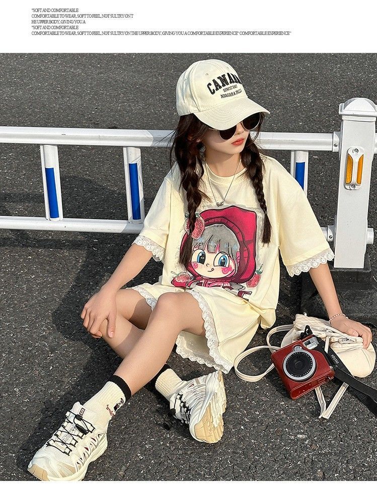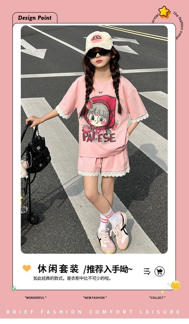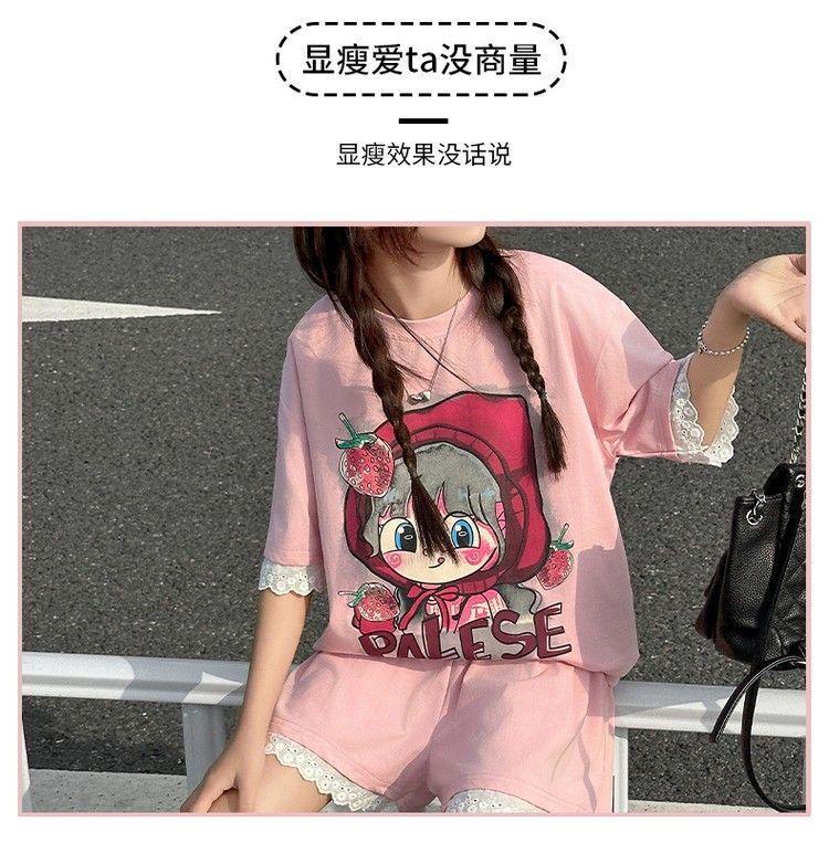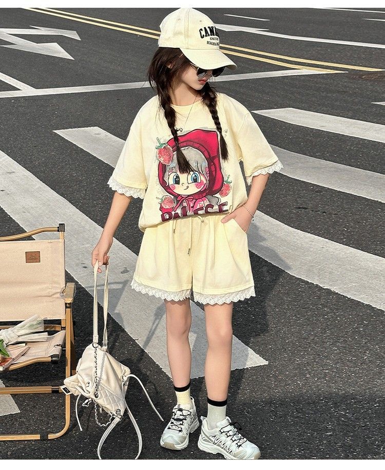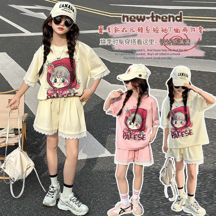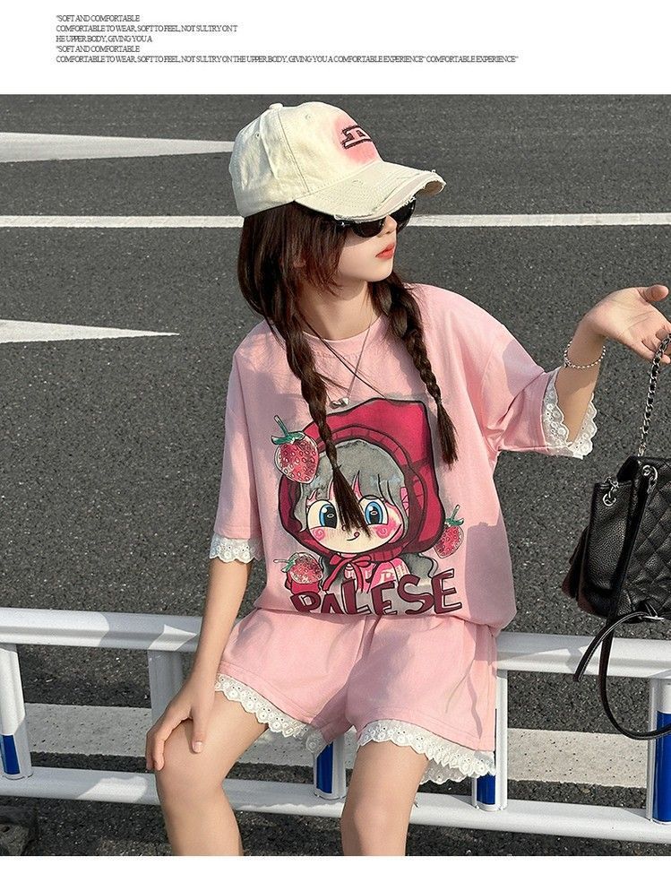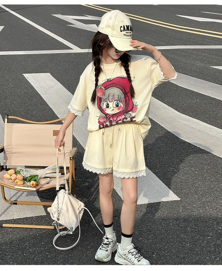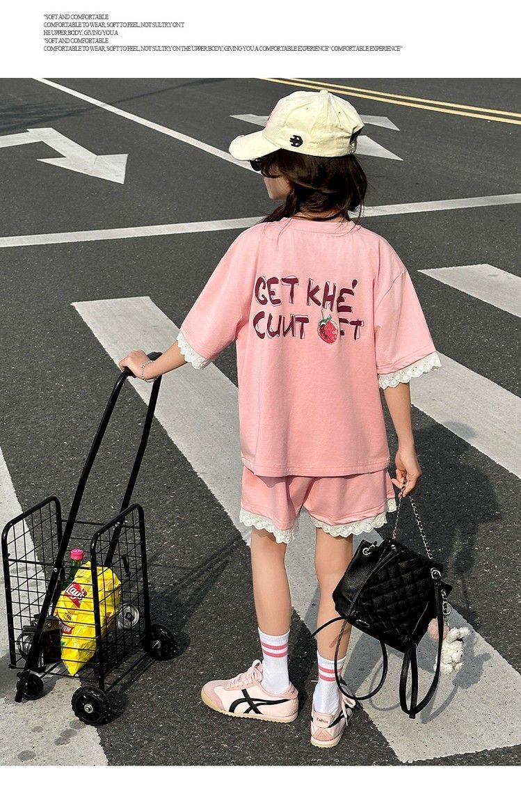 여자 여름 세트 2025 새로운 여자 한국 스타일 웨스턴 스타일 레이스 짧은 소매 반바지 투피스 세트스토어 가기