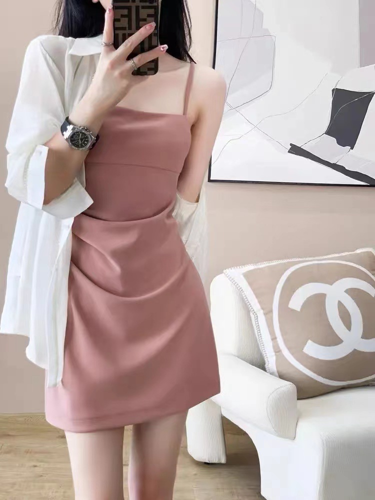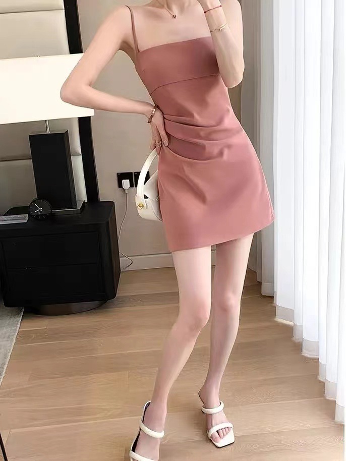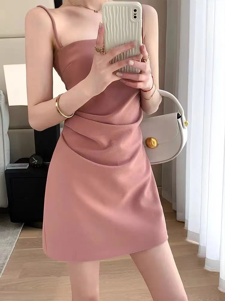 작은 신작 2025 서스펜더 플리츠 드레스, 허리 슬리밍, 고급스럽고 우아한, 순수한 욕망 스타일의 짧은 스커트