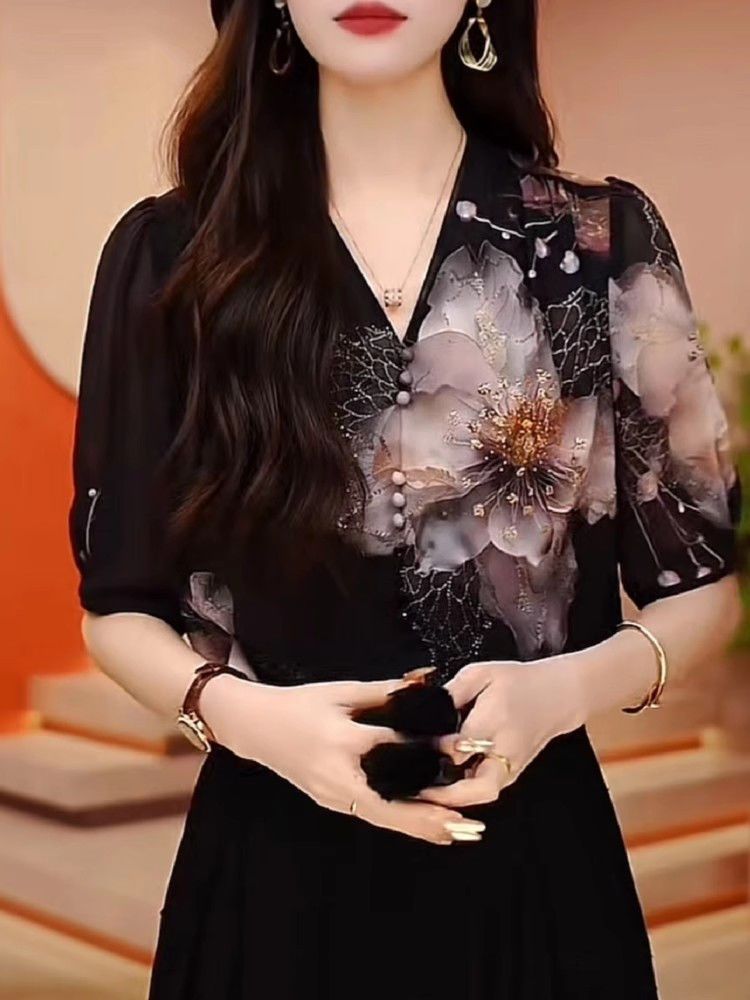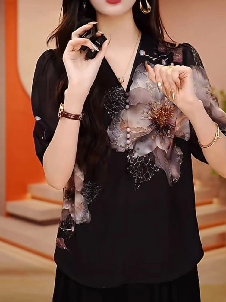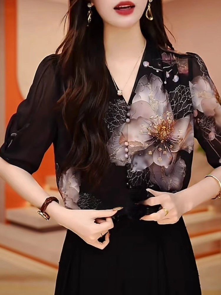 여성을위한 느슨한 대형 슬림 프린트 쉬폰 셔츠 여름 2025 새로운 얇은 프랑스 스타일 다목적 아름다운 외국 스타일 탑