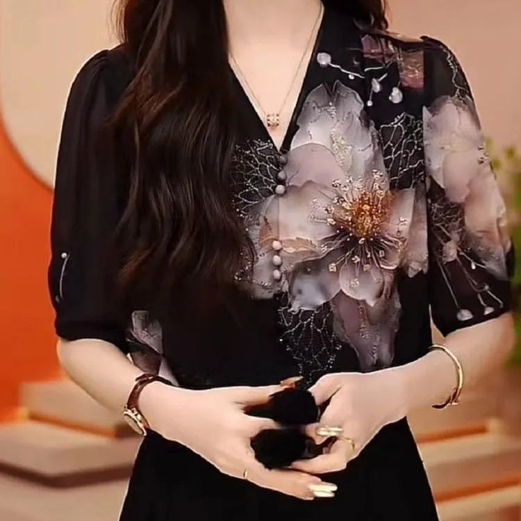 여성을위한 느슨한 대형 슬림 프린트 쉬폰 셔츠 여름 2025 새로운 얇은 프랑스 스타일 다목적 아름다운 외국 스타일 탑스토어 가기