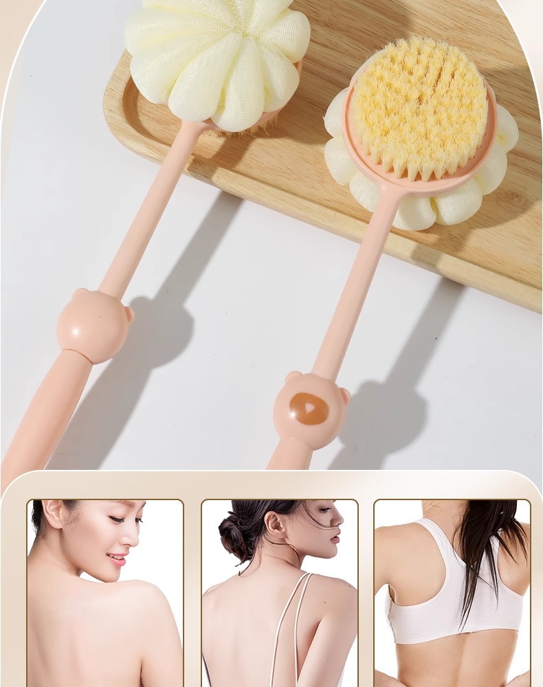 2-in-1 목욕 브러시, 긴 손잡이, 부드러운 강모 목욕 브러시, 목욕 타월, 목욕 공, 등 목욕 브러시