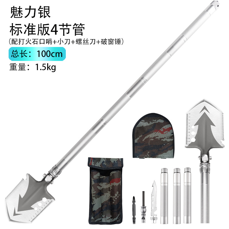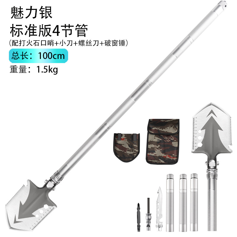 产品清单:铲头*1,链接杆*1,加长杆*2,铲头迷彩包*1,手柄迷彩包*1,战术刀*1,口哨打火石*1,攻击锥*1,十字/一批螺丝刀*1,英文彩盒*1