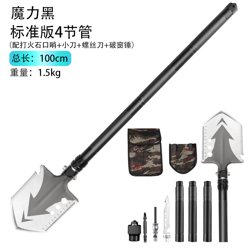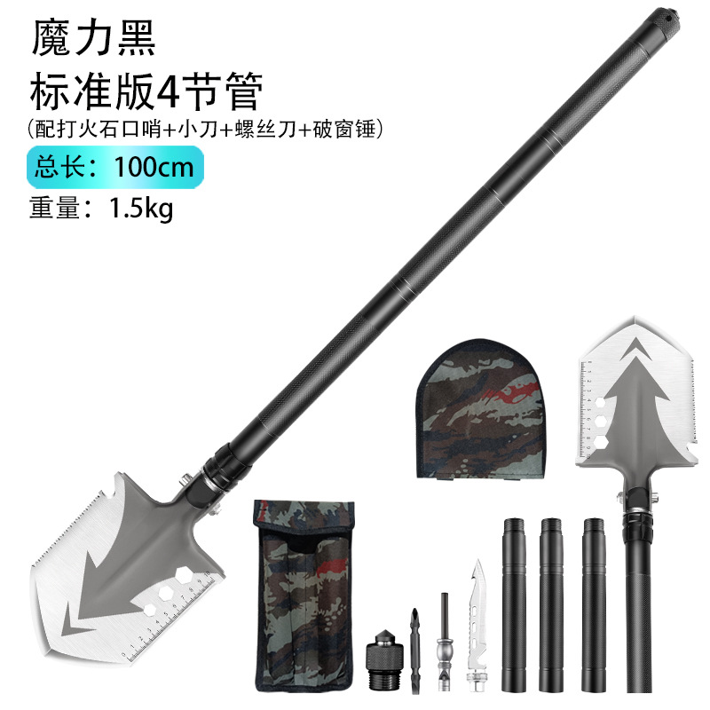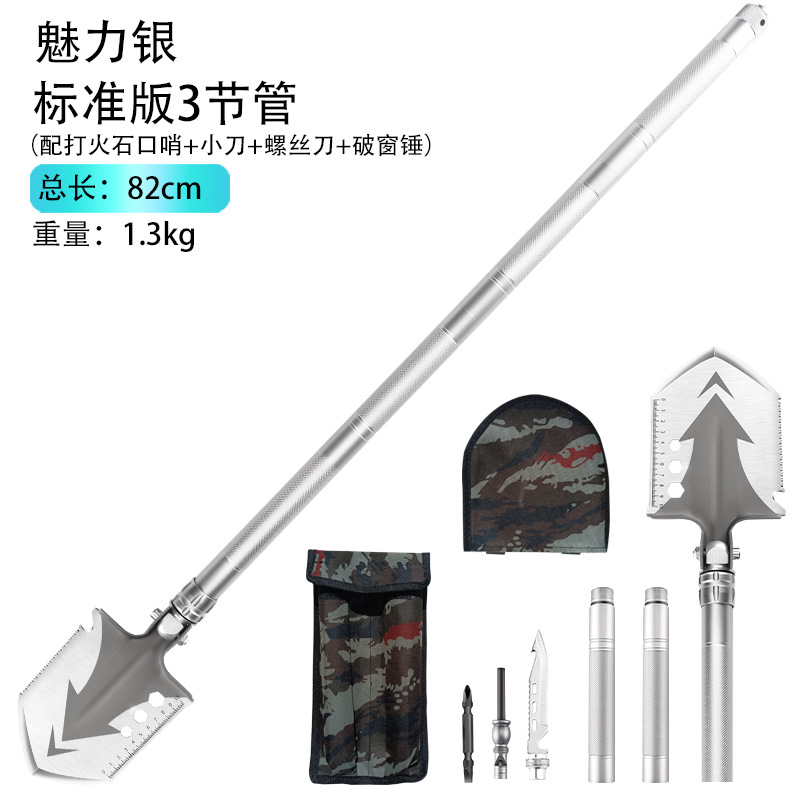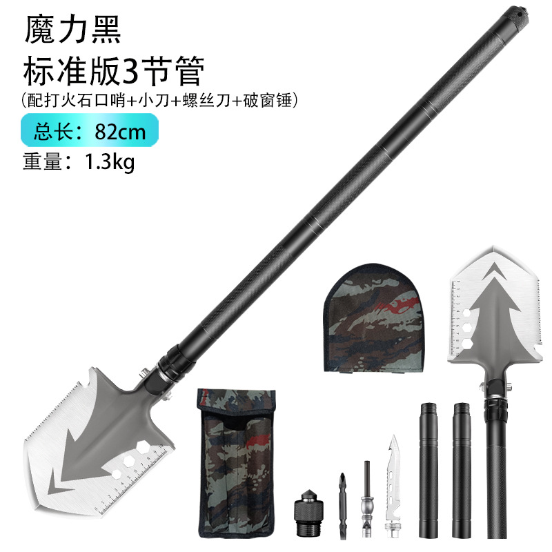 功能介绍:铲 刨 劈 锯 拍 护 破 撬 切 锄 凿 打火 勾 口哨 防身棍 刺 开瓶器 扳手 割绳