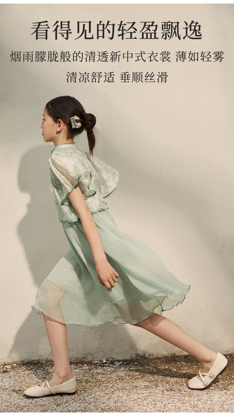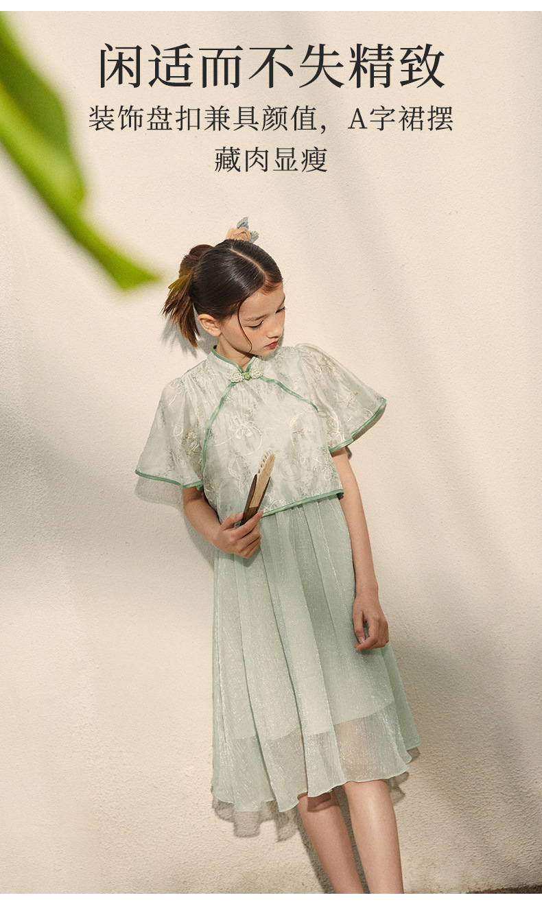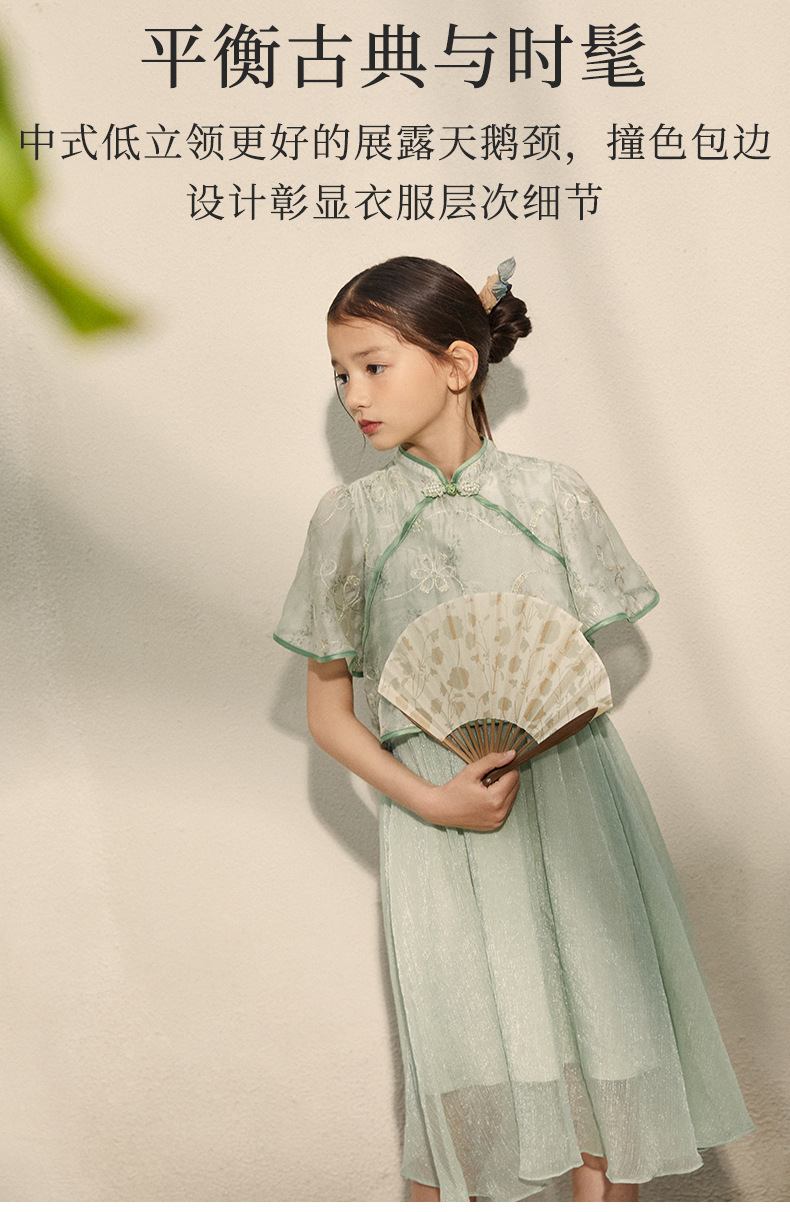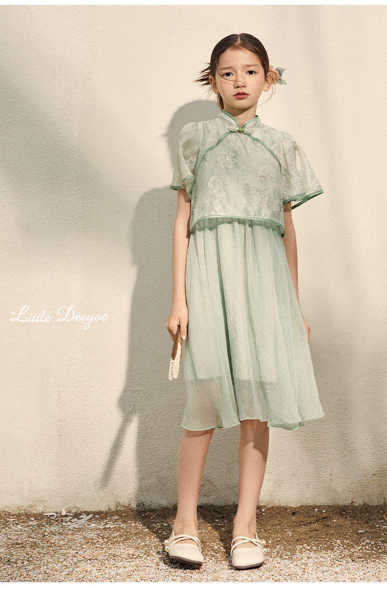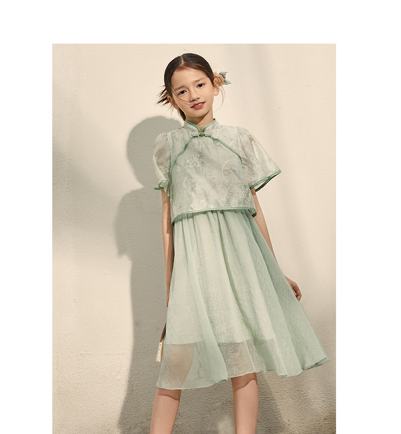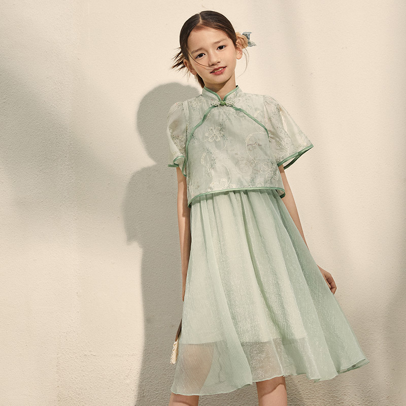 2025년 여름 신작 여아용 한복 드레스, 큰 어린이를 위한 새로운 중국 스타일의 중국 스타일 어린이 반팔 가짜 투피스 스커트