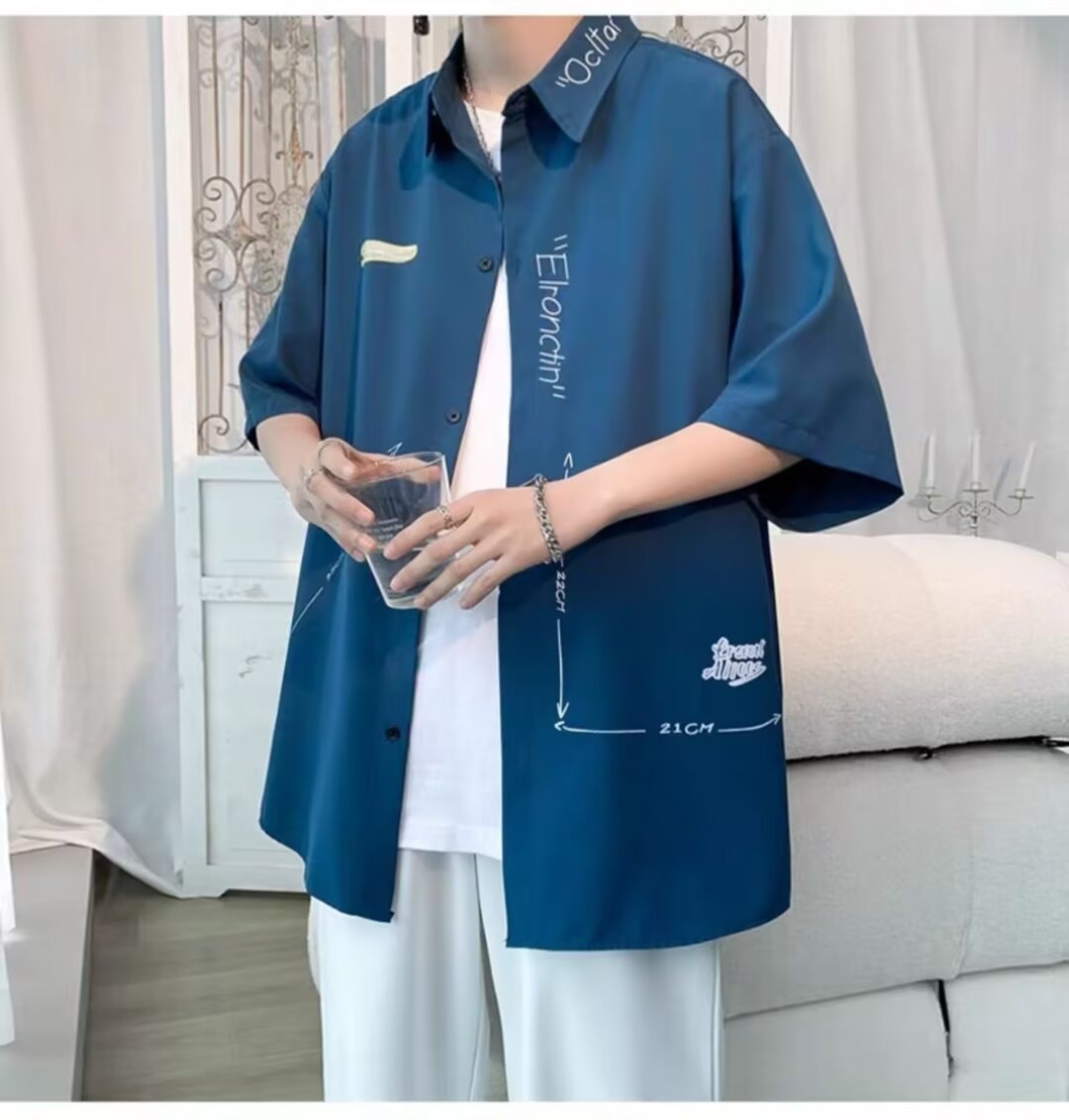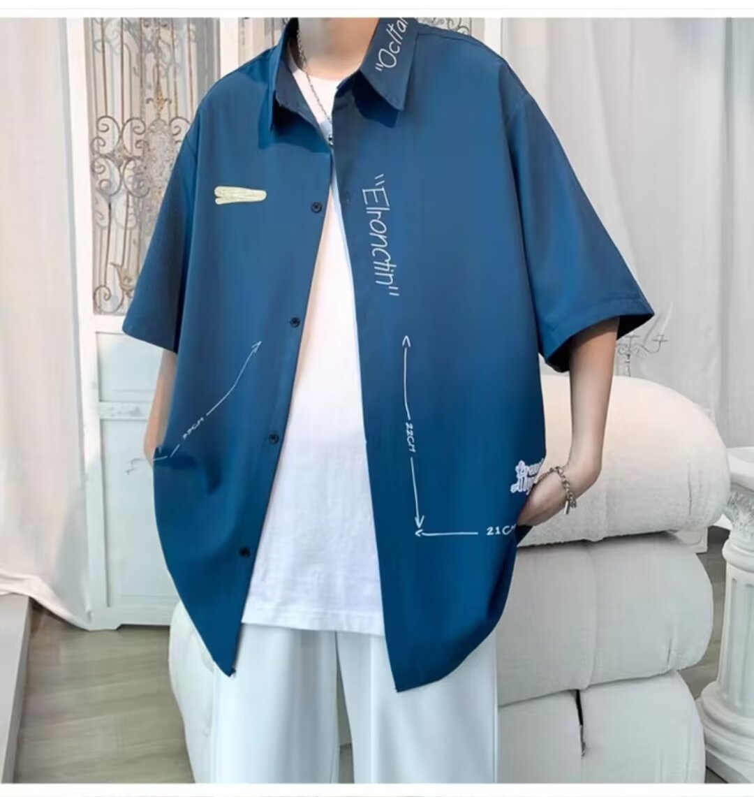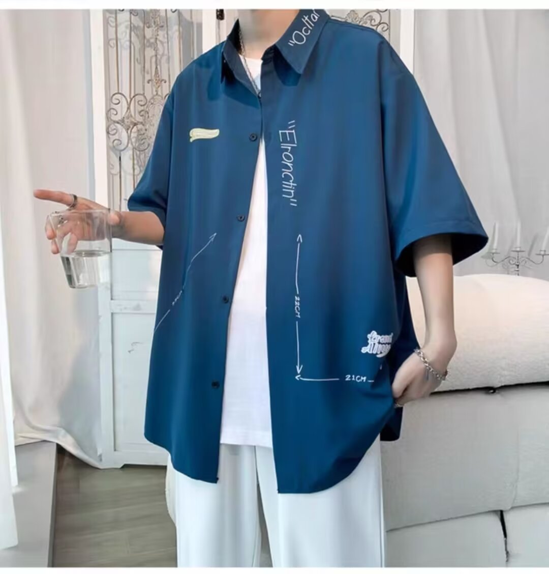 2024 아이스 실크 셔츠 남자 여름 홍콩 스타일 학생 느슨한 틈새 디자인 감각 재미있는 새로운 남성 탑
