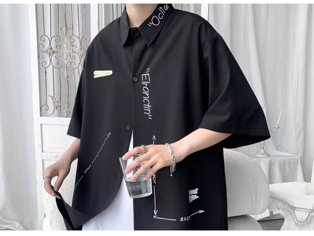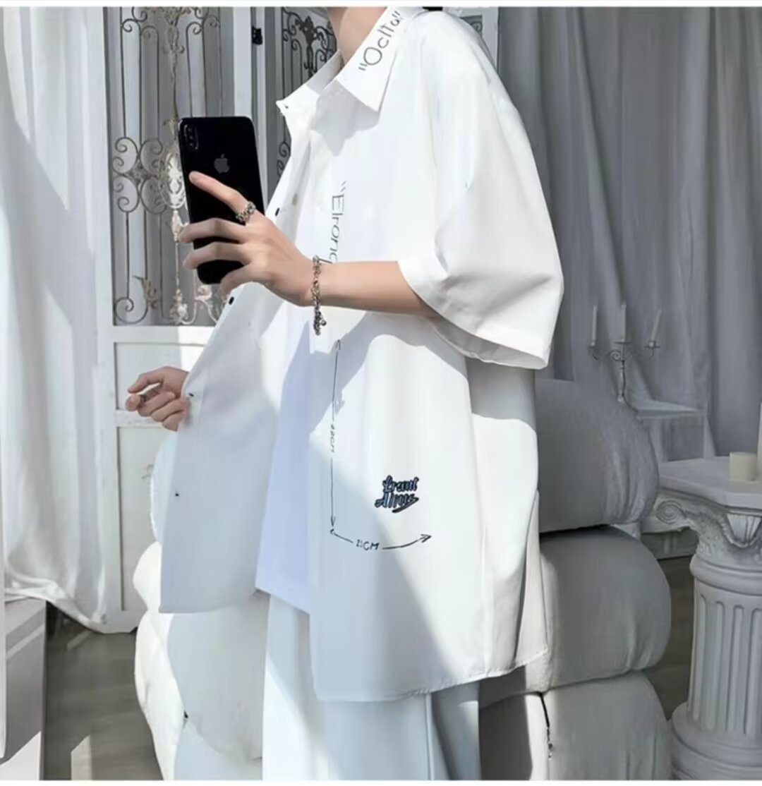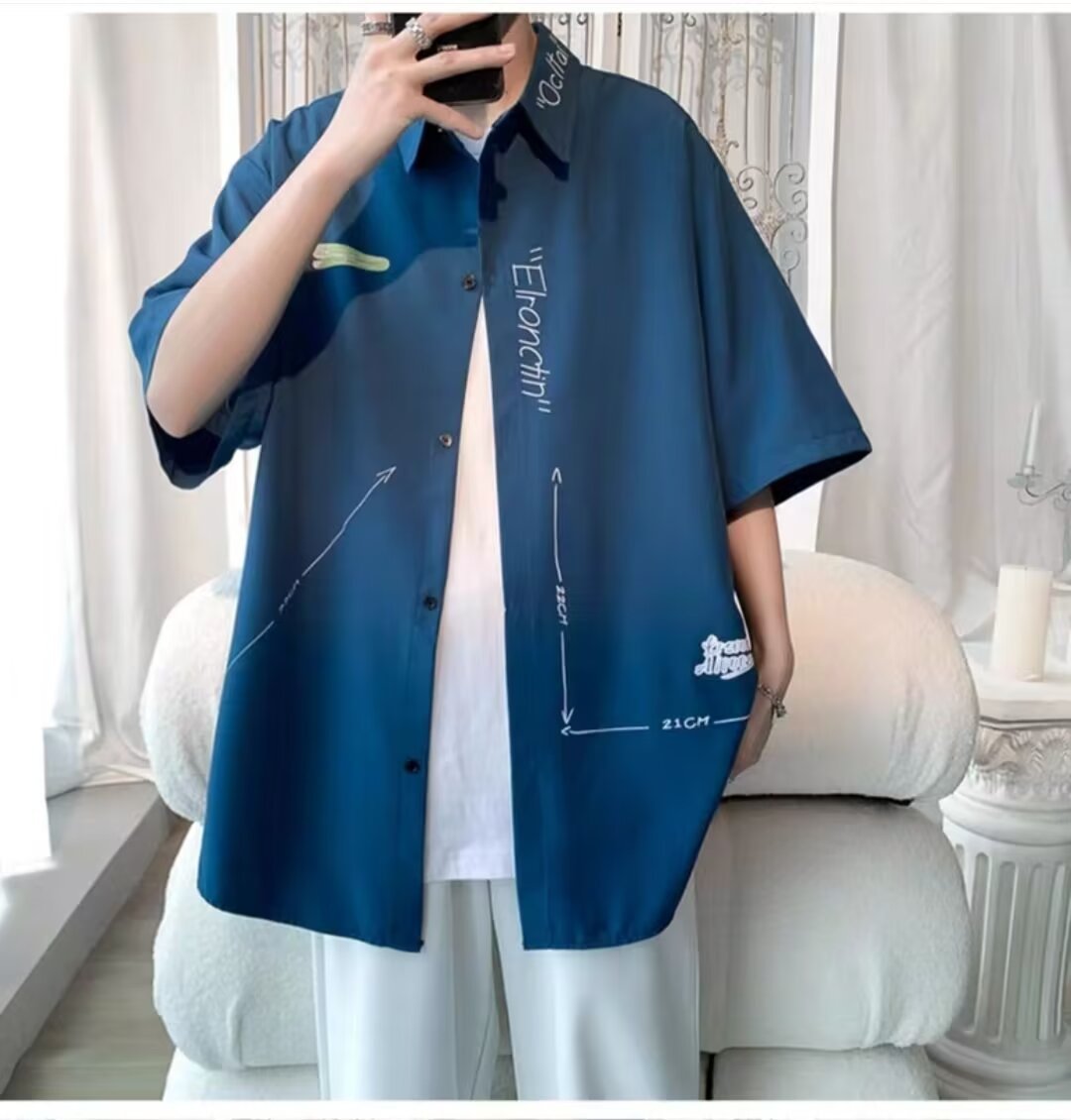 2024 아이스 실크 셔츠 남자 여름 홍콩 스타일 학생 느슨한 틈새 디자인 감각 재미있는 새로운 남성 탑