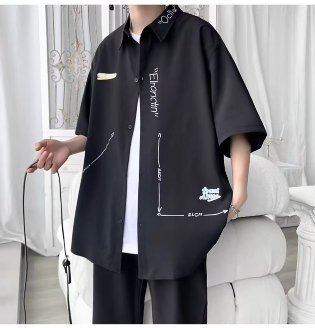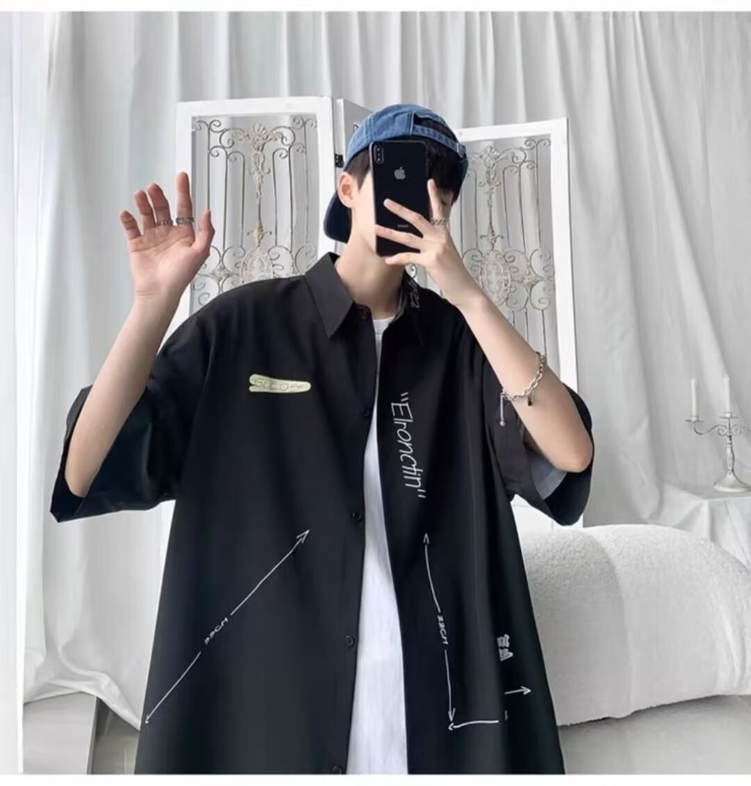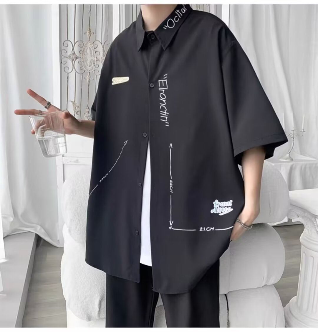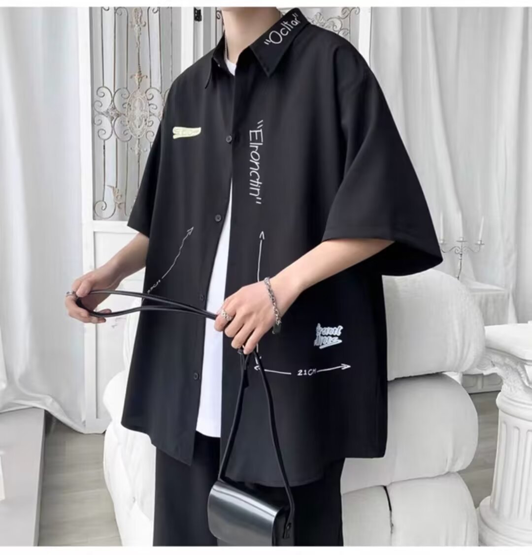 2024 아이스 실크 셔츠 남자 여름 홍콩 스타일 학생 느슨한 틈새 디자인 감각 재미있는 새로운 남성 탑스토어 가기