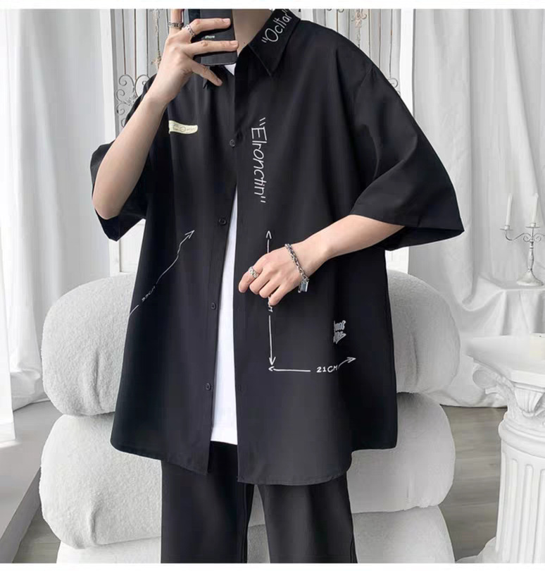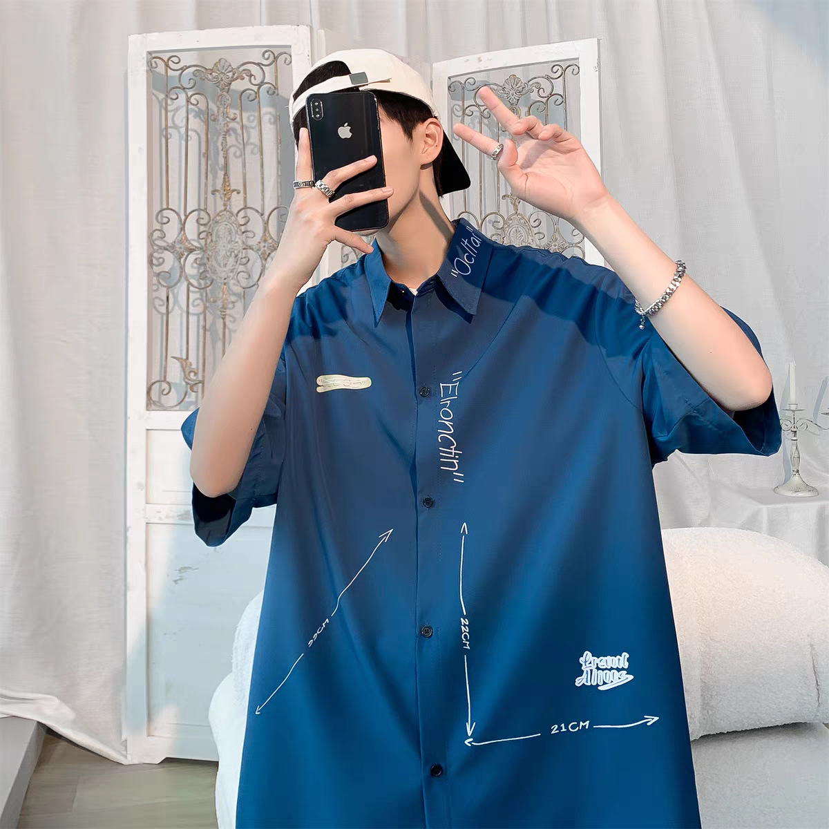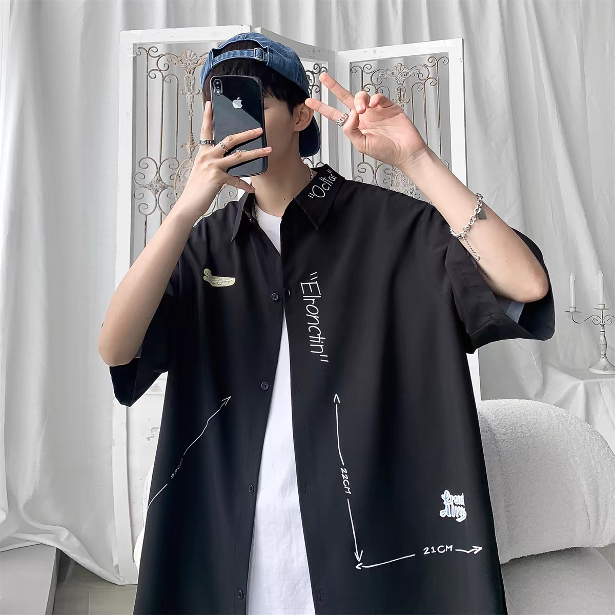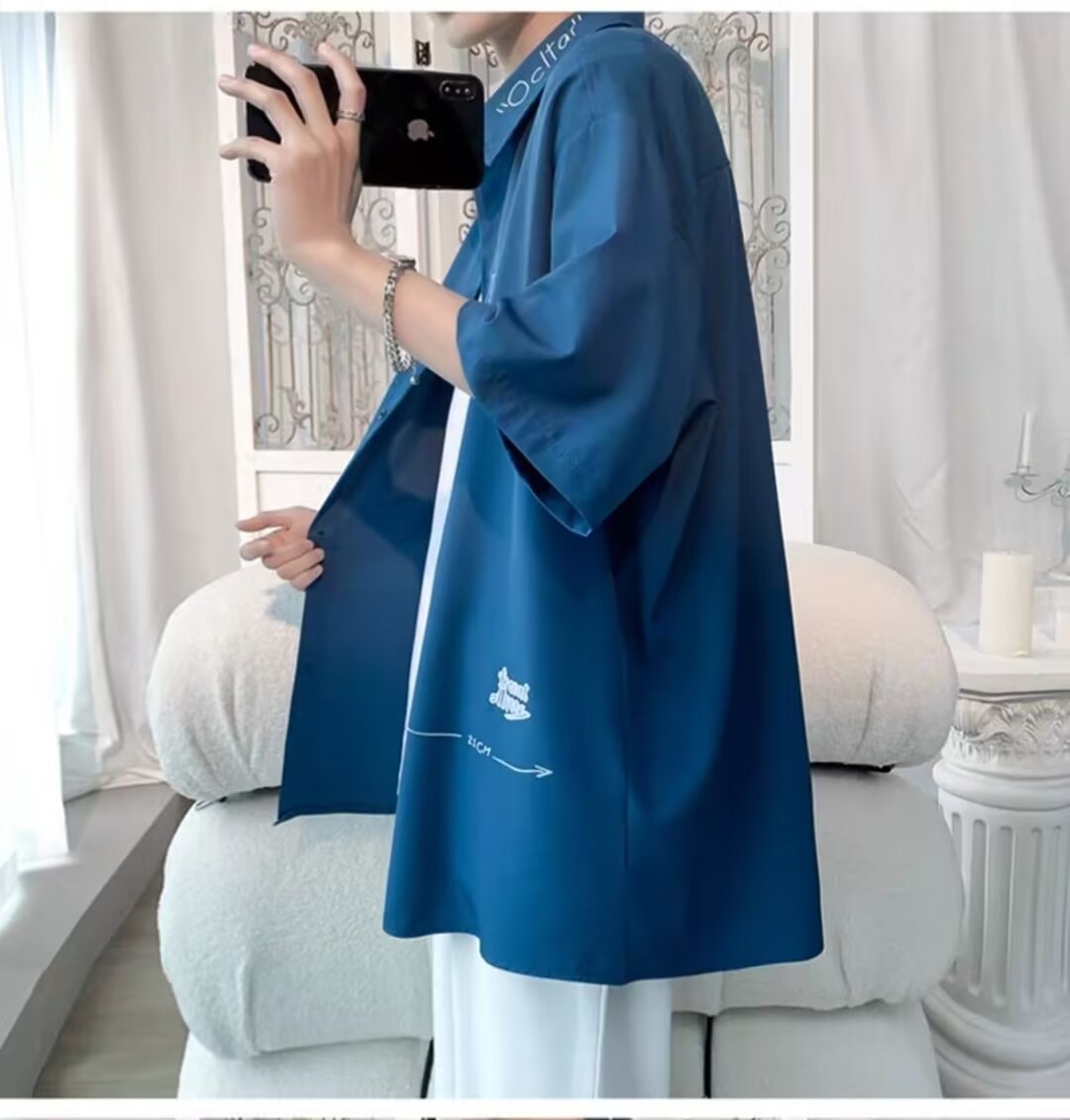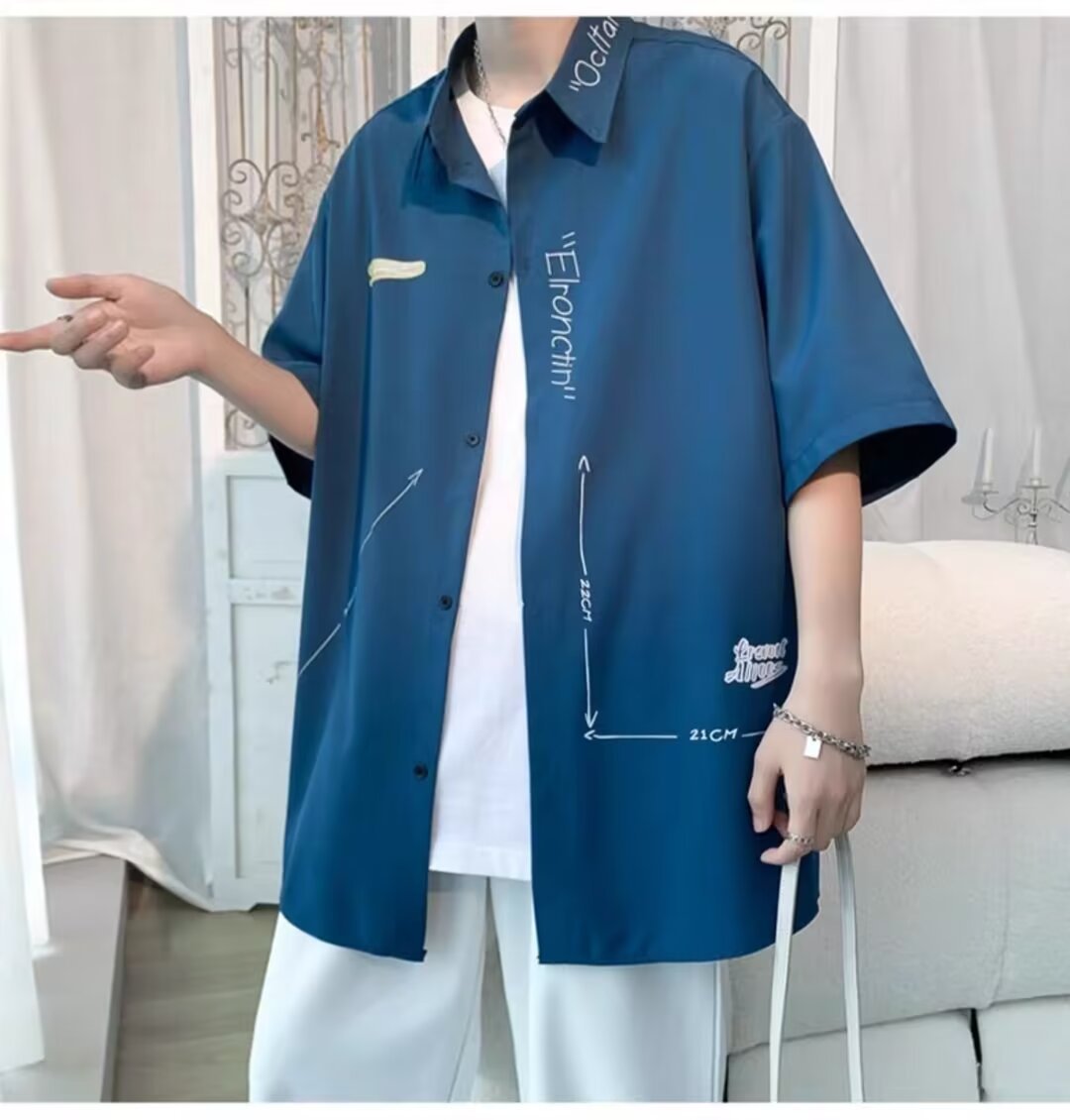 2024 아이스 실크 셔츠 남자 여름 홍콩 스타일 학생 느슨한 틈새 디자인 감각 재미있는 새로운 남성 탑스토어 가기