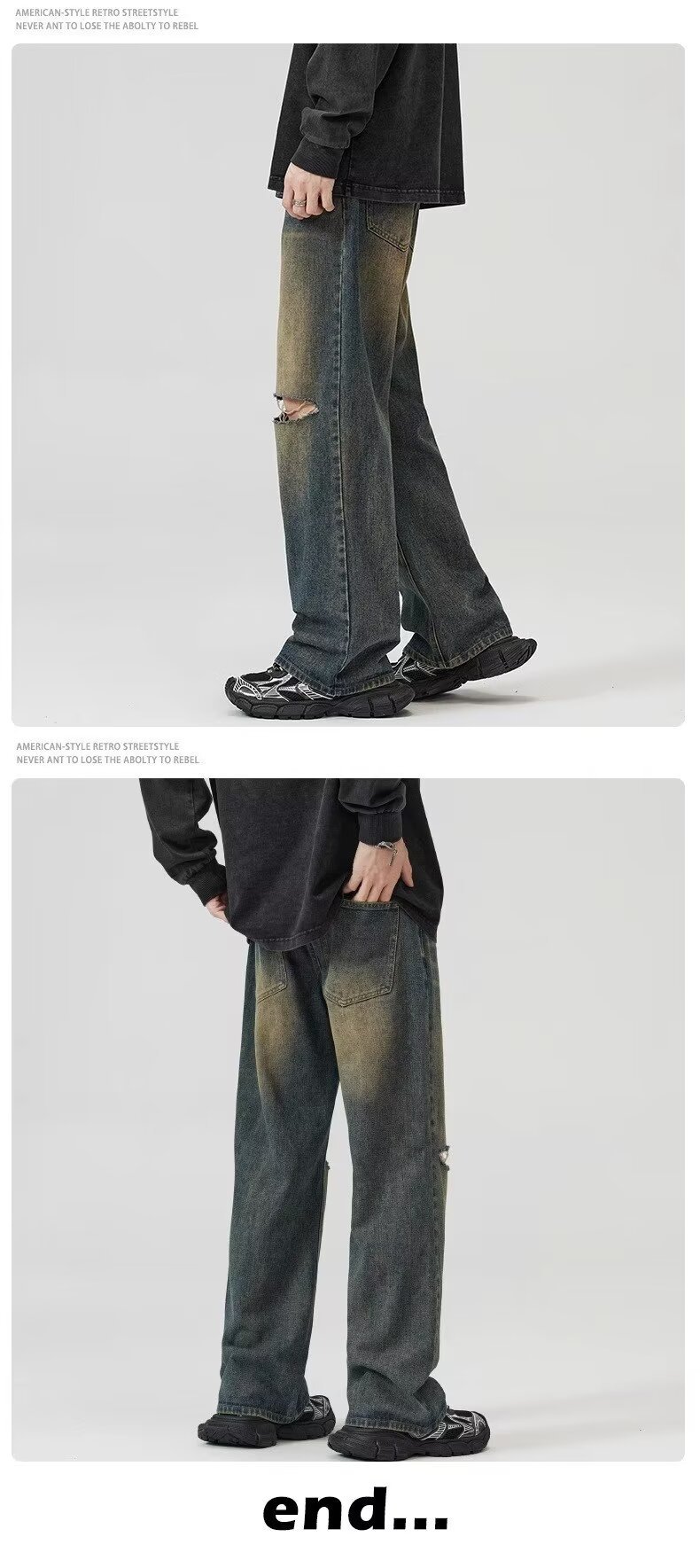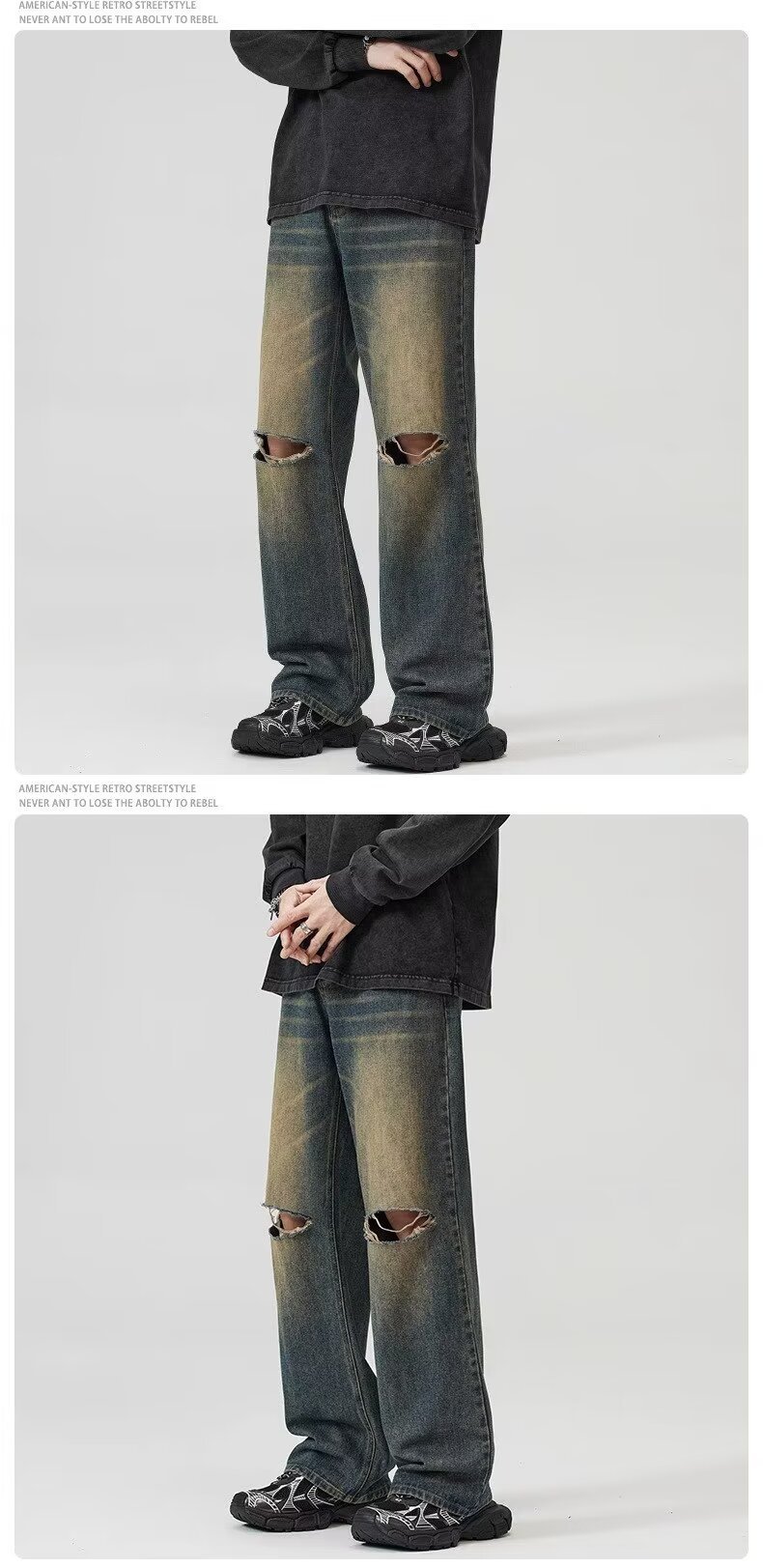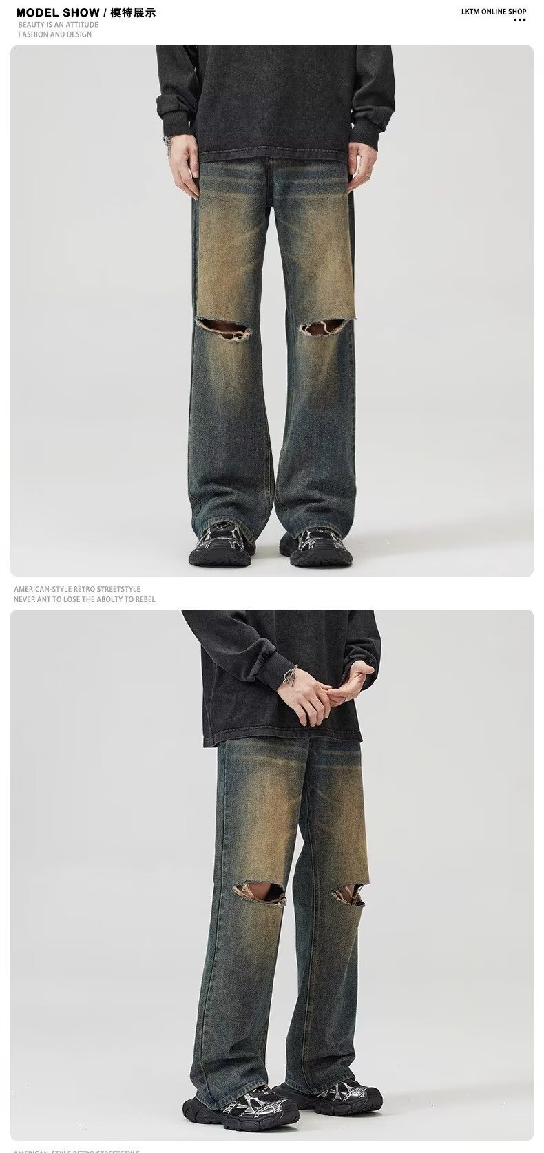 Ins 아메리칸 스타일 리핑 청바지 남성과 여성의 트렌디 와이드 레그 스트레이트 하이 스트리트 레트로 인 스타일 마이크로 스트레이트 베지 캐주얼 바지