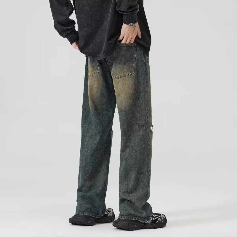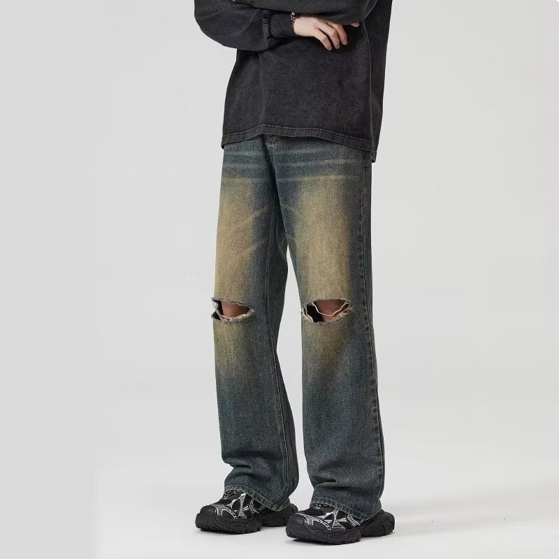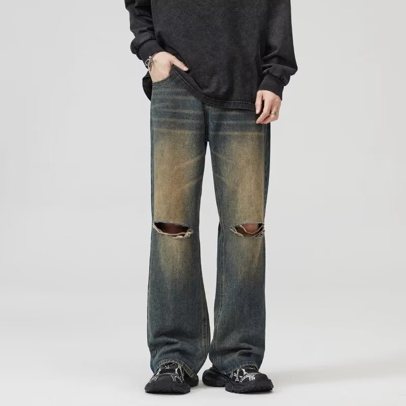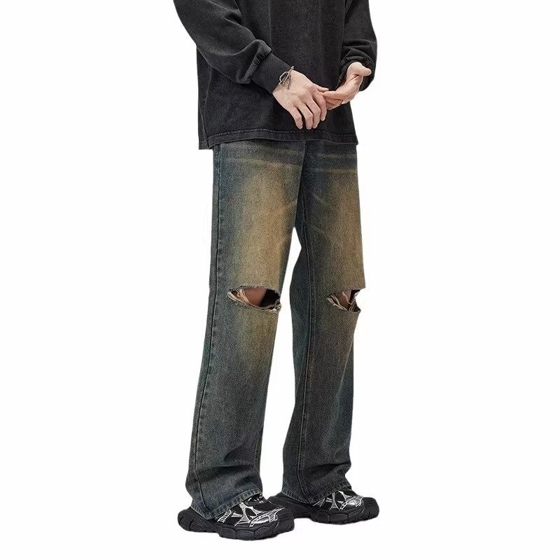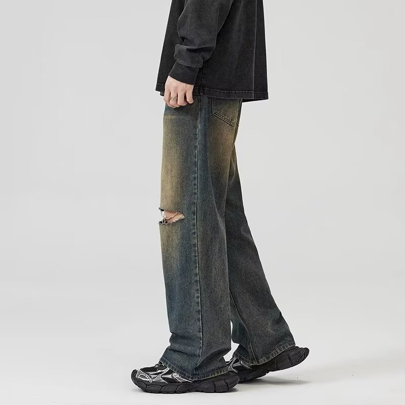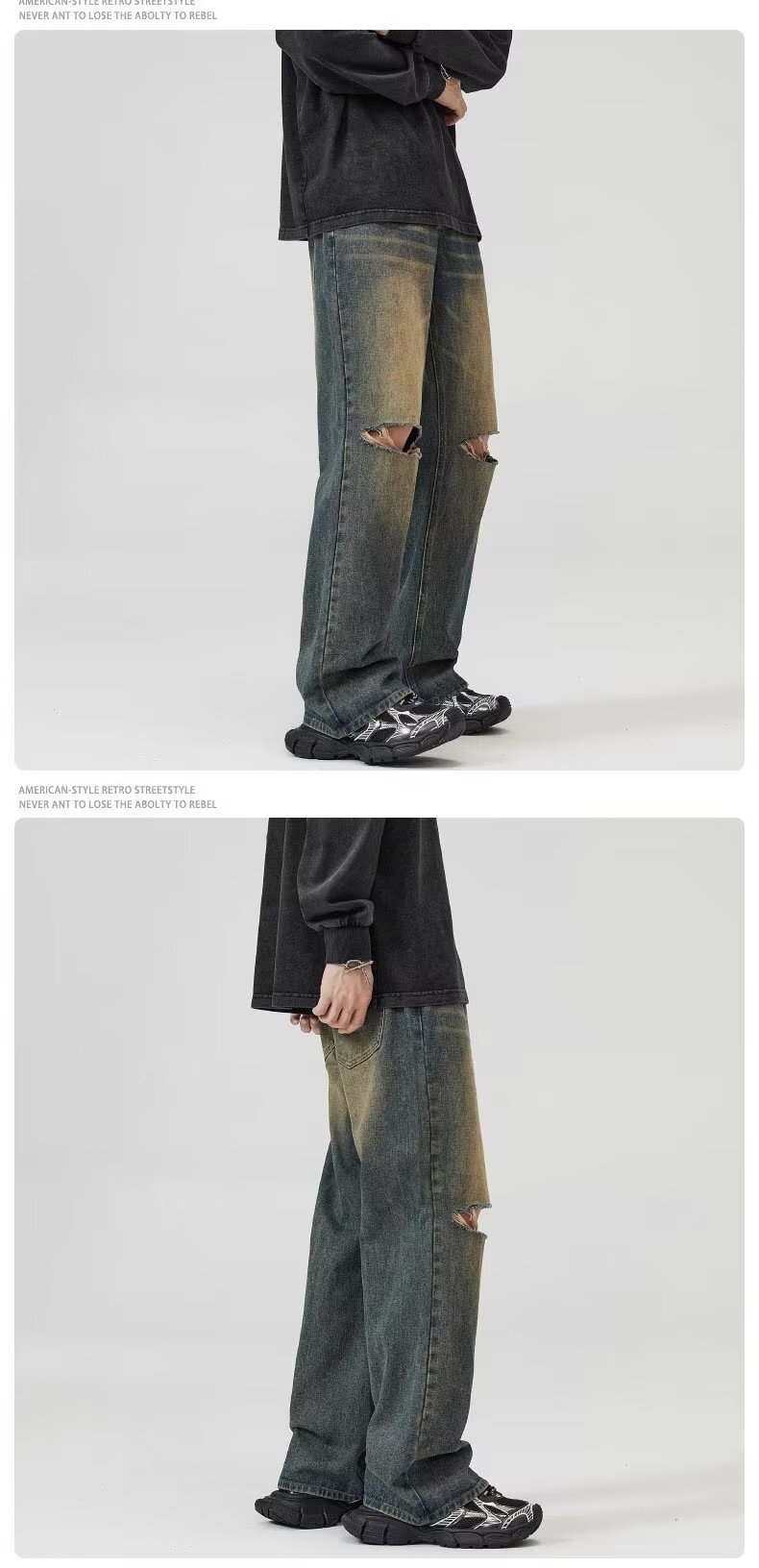 Ins 아메리칸 스타일 리핑 청바지 남성과 여성의 트렌디 와이드 레그 스트레이트 하이 스트리트 레트로 인 스타일 마이크로 스트레이트 베지 캐주얼 바지