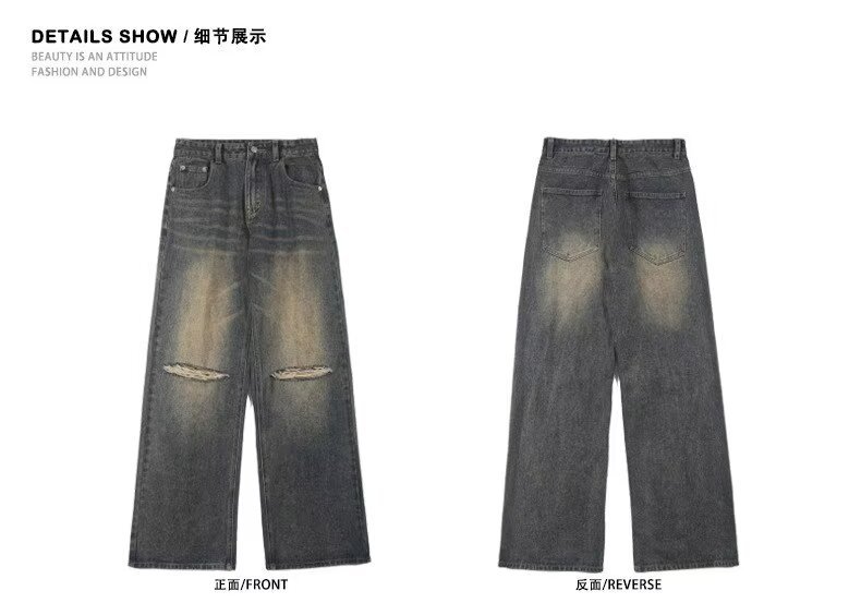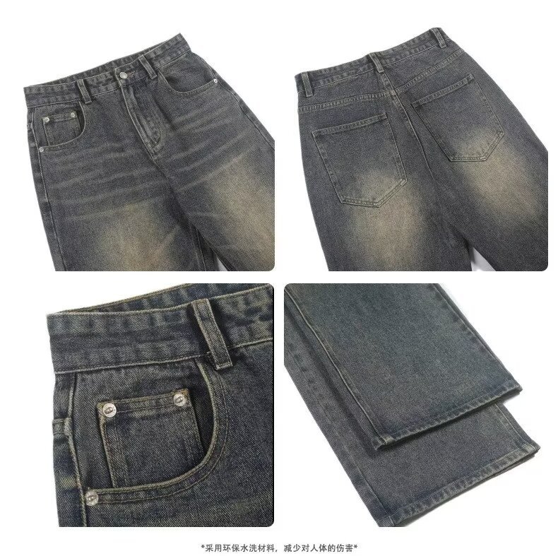 Ins 아메리칸 스타일 리핑 청바지 남성과 여성의 트렌디 와이드 레그 스트레이트 하이 스트리트 레트로 인 스타일 마이크로 스트레이트 베지 캐주얼 바지스토어 가기