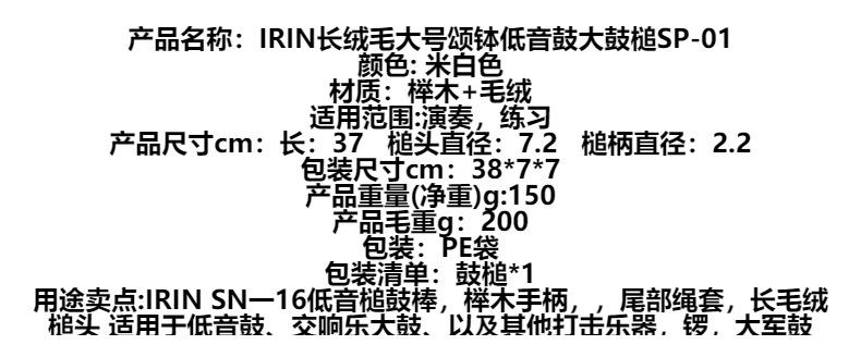 IRIN 큰베이스 드럼 스틱 긴 보풀 보울 해머 심포니 큰 드럼 스틱 타악기 드럼 해머 드럼 스틱 도매