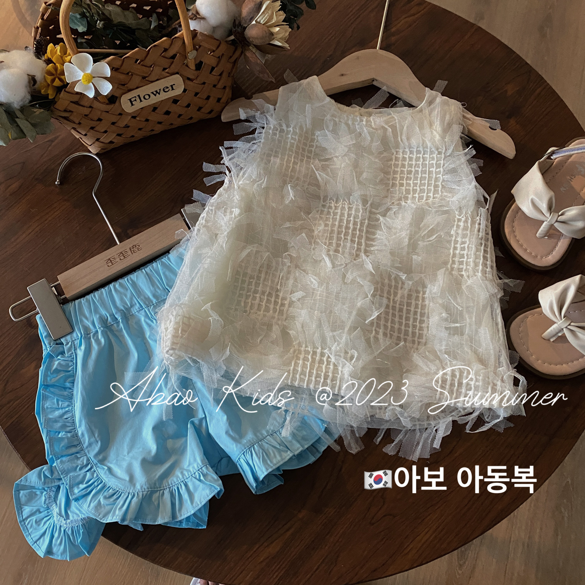 클리어런스, 환불불가, 교환불가 [합리적인 주문] 여름 여아 민소매 태슬탑 + 귀파이 블루반바지스토어 가기