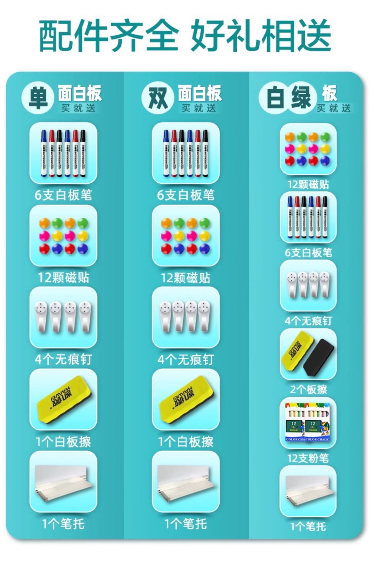 • [이중 용도] 두꺼운 은색 프레임 60*90 흰색 및 녹색 보드 + 무료 스티커 12개, 펜 6개, 분필 2개, 손톱 2개, 지우개 2개, 펜 걸레 1개