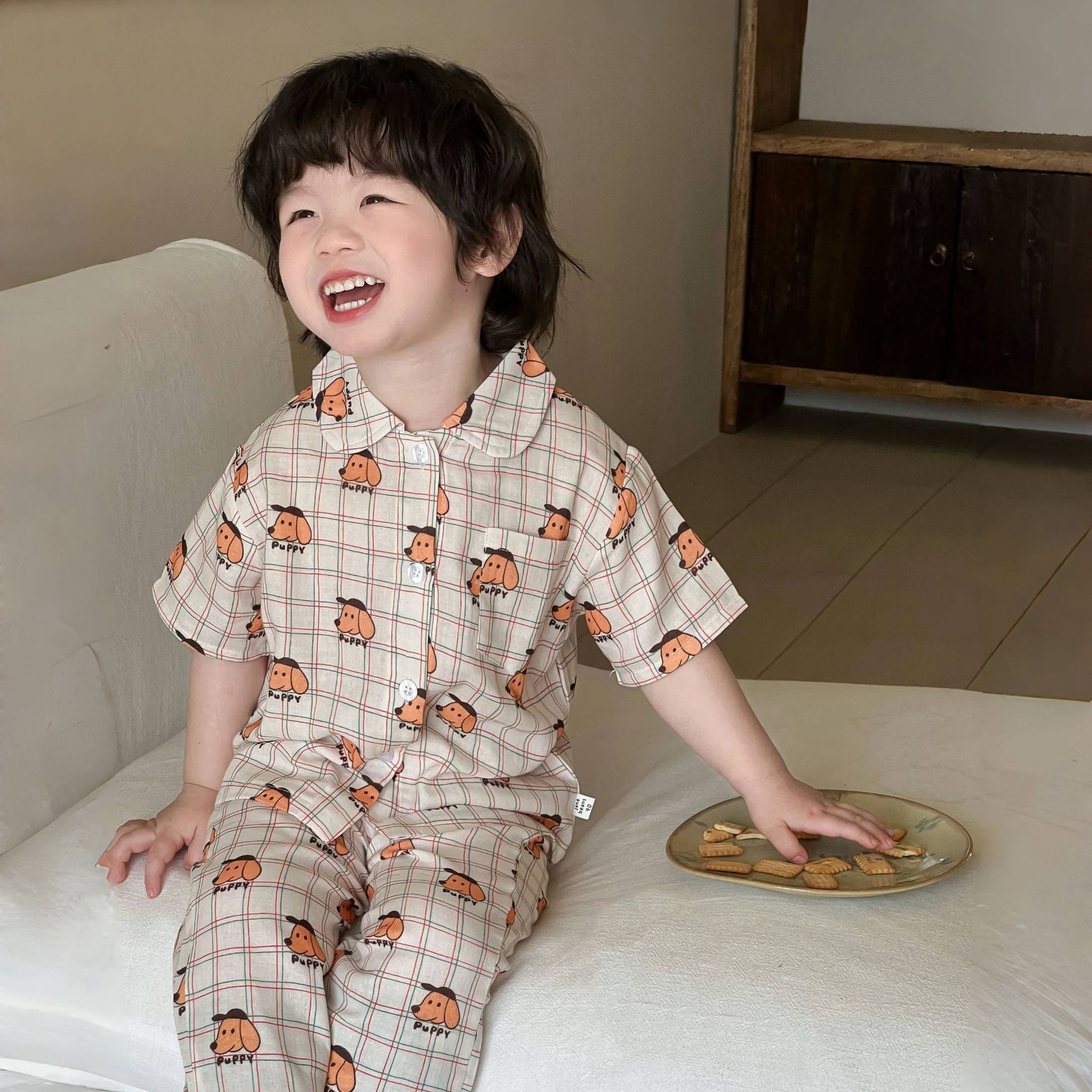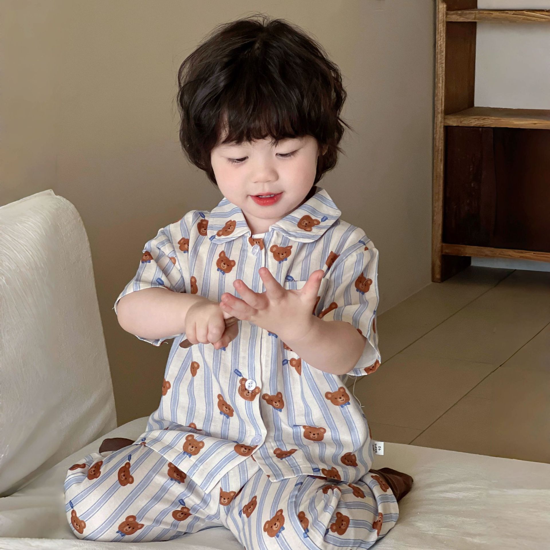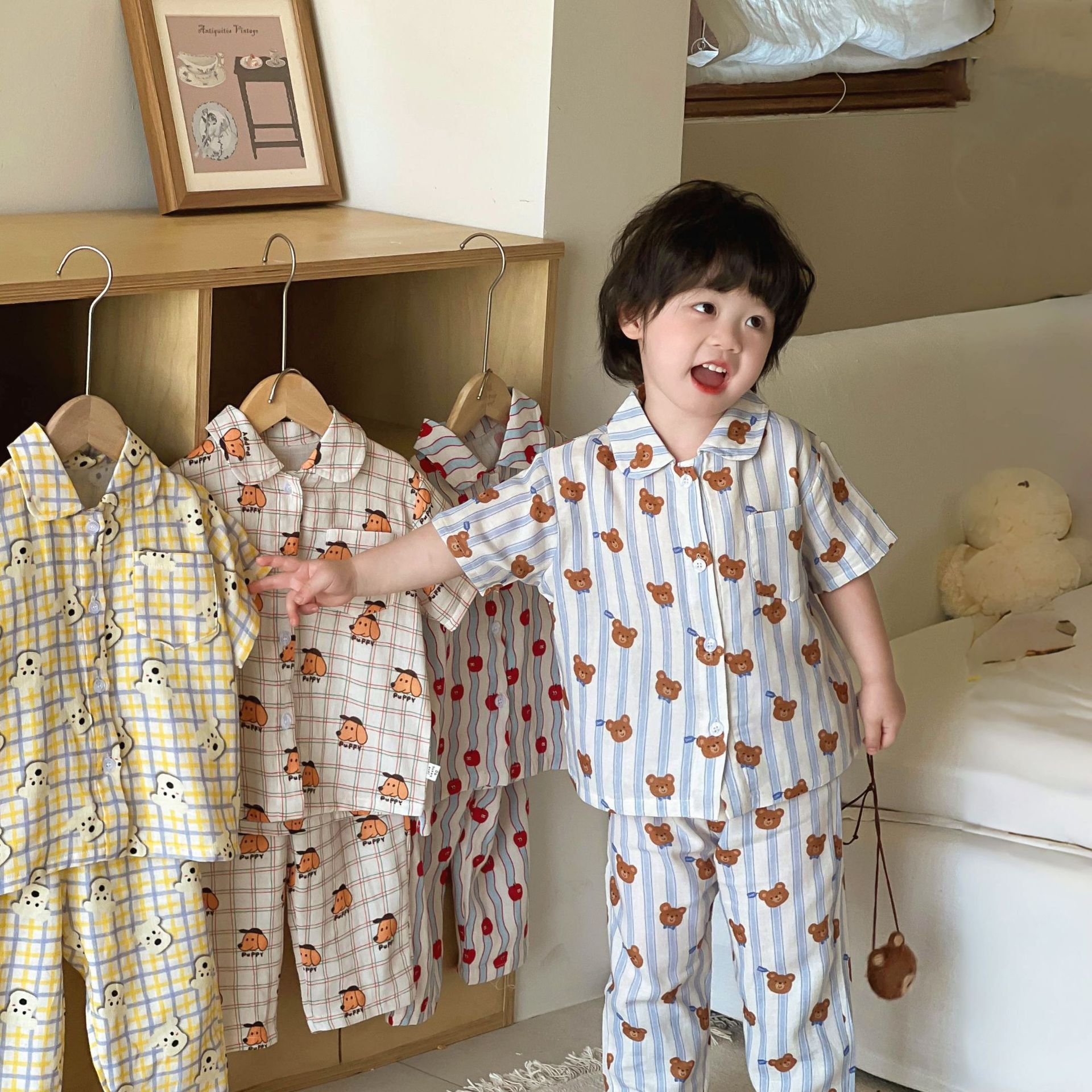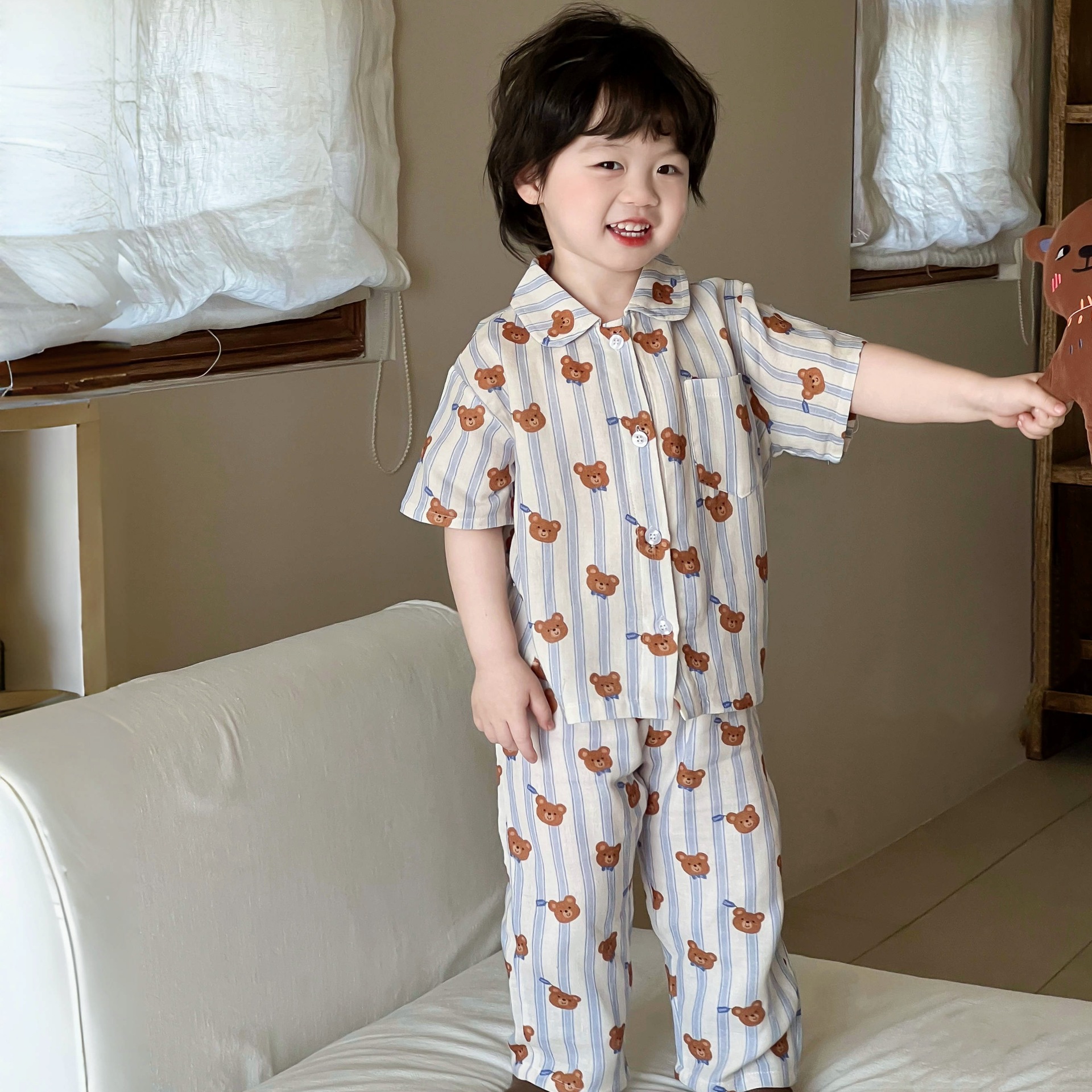 어린이 순면 잠옷 세트 2025 여름 어린이 순면 가정복 소년 소녀 용 어린이 면사 반팔 모기 방지 바지스토어 가기