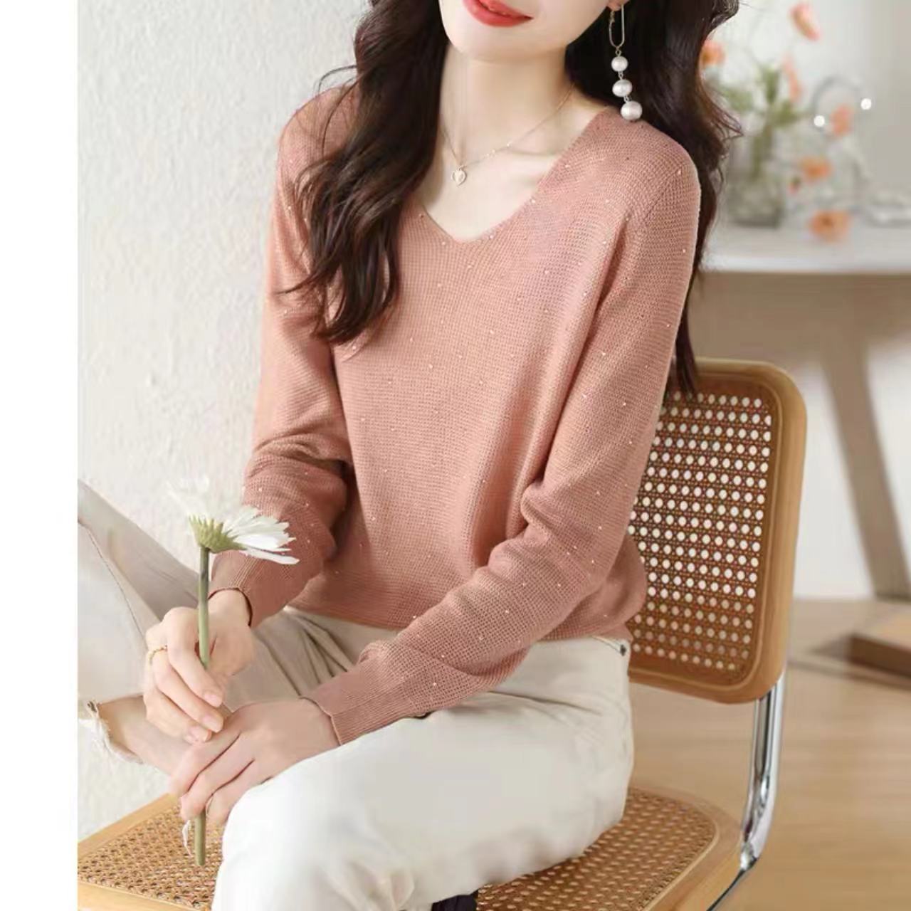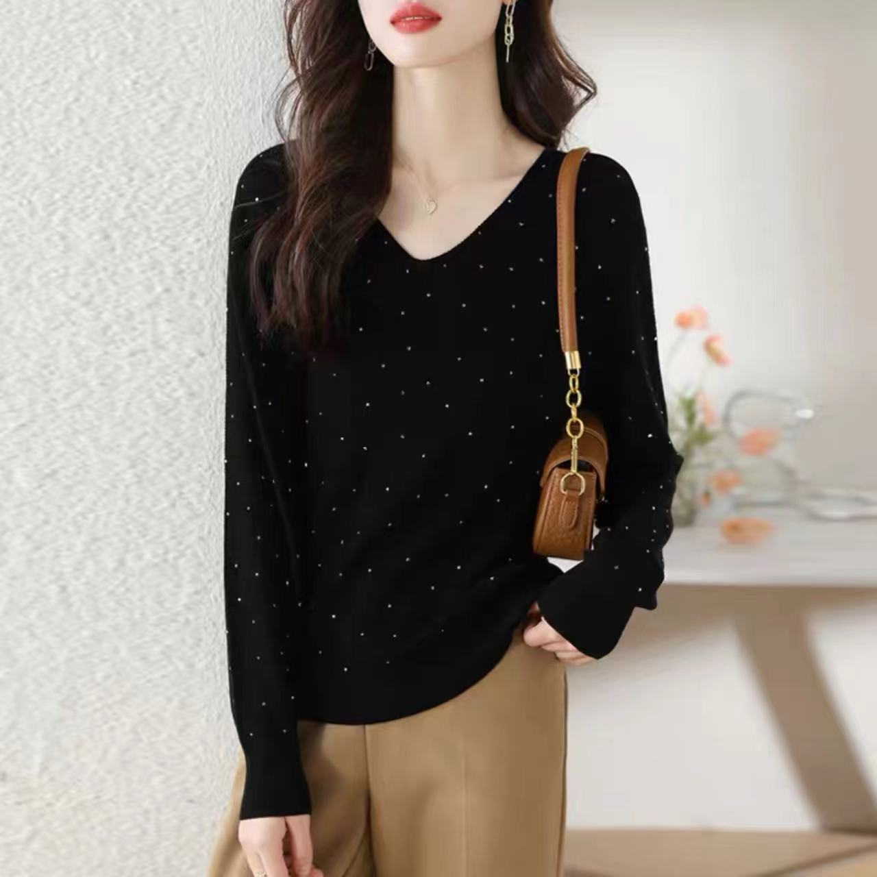 2023 가을과 겨울 뜨거운 드릴링 외국 스타일 니트 탑 새로운 패션 V-목 피부 친화적 인 부드러운 왁스 느슨한베이스 셔츠