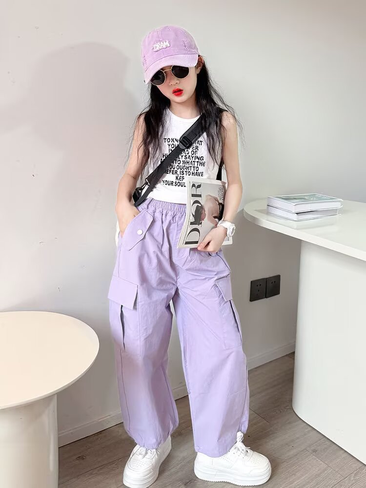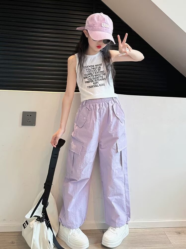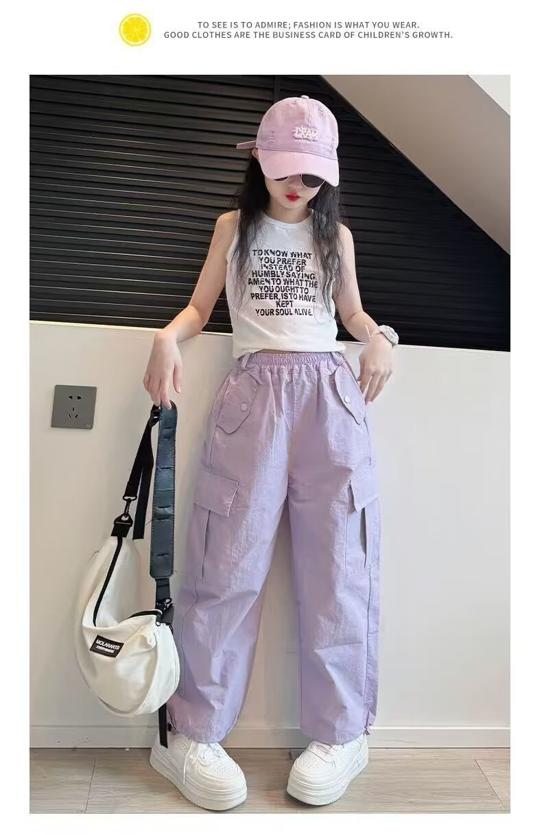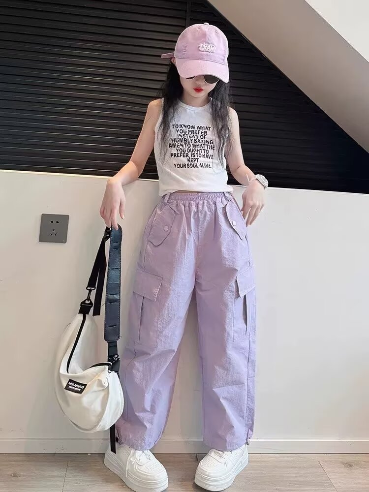 소녀 보라색 바지 여름 2025 새로운 어린이 거리 댄스 커버 바지 소녀 큰 어린이 스포츠 빠른 건조 바지 여름 착용
