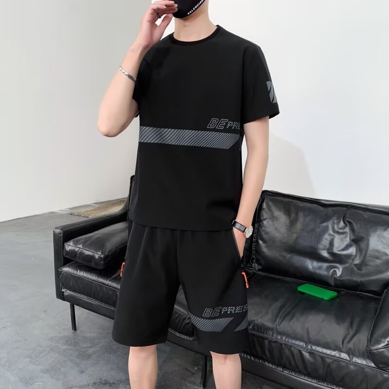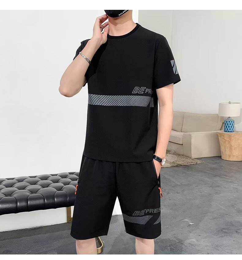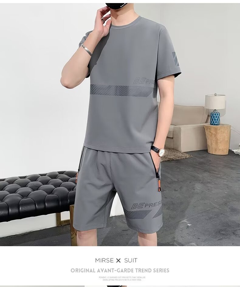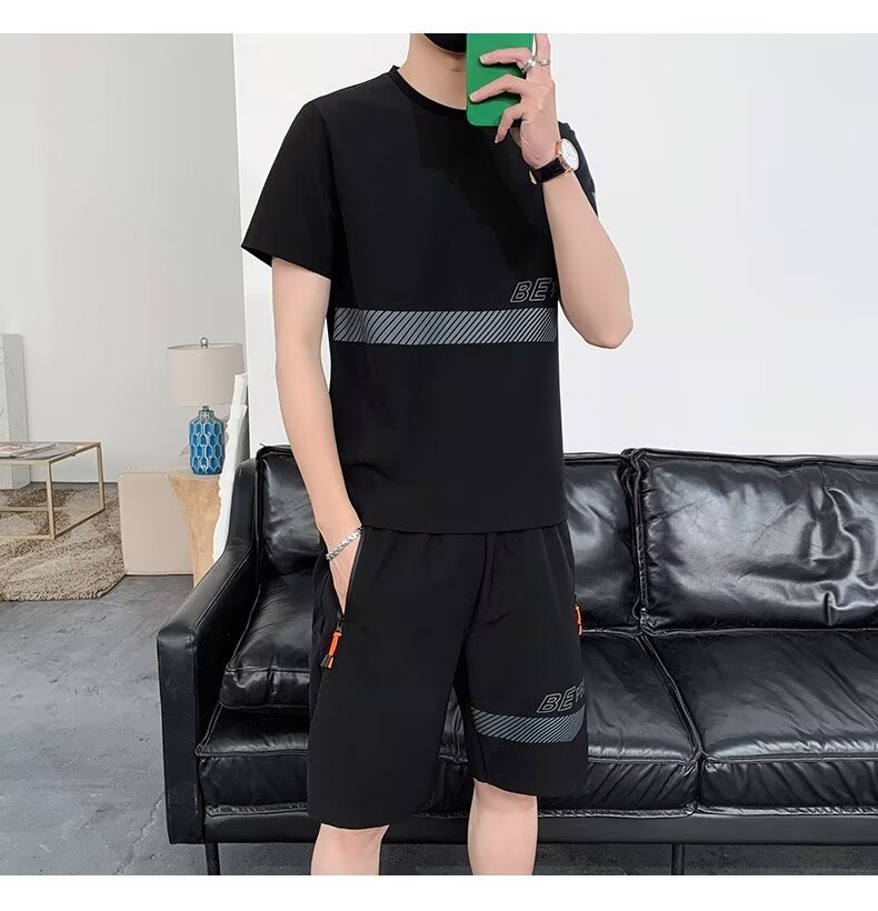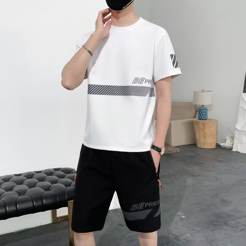 아이스 실크 반팔 티셔츠 세트 남성 여름 유행 캐주얼 스포츠 세트 반바지 투피스 세트
