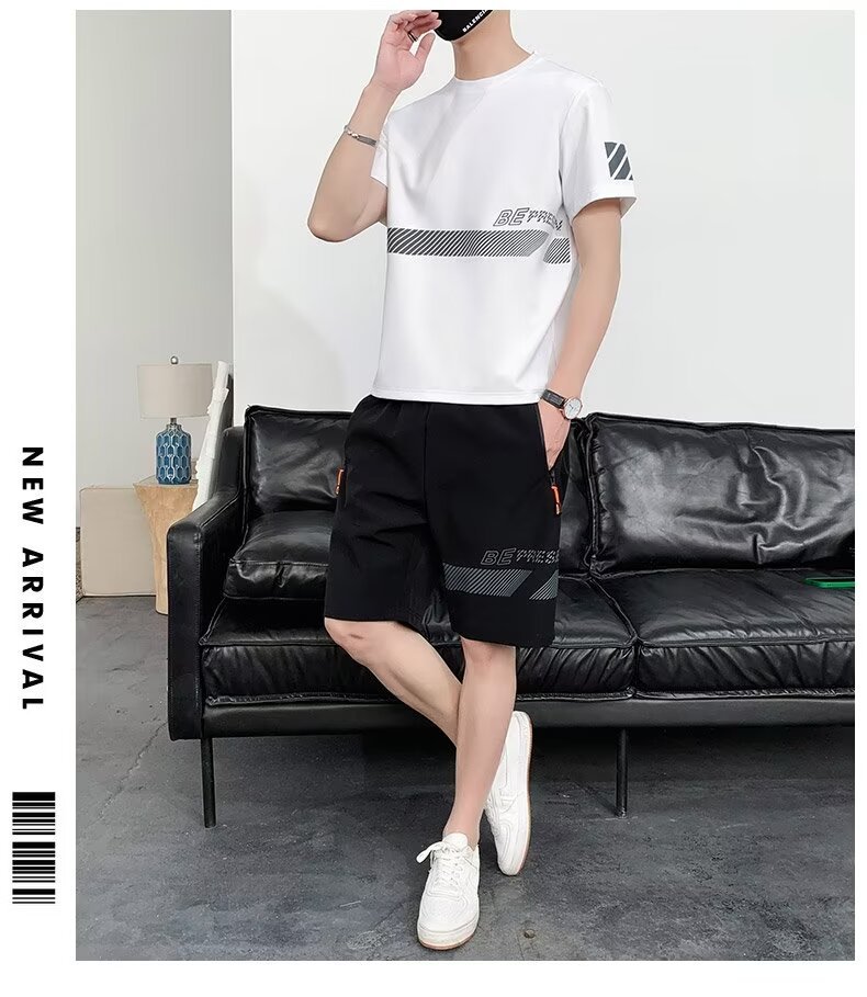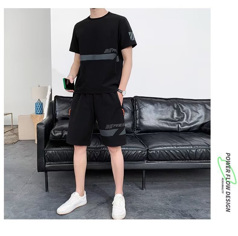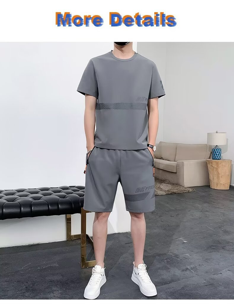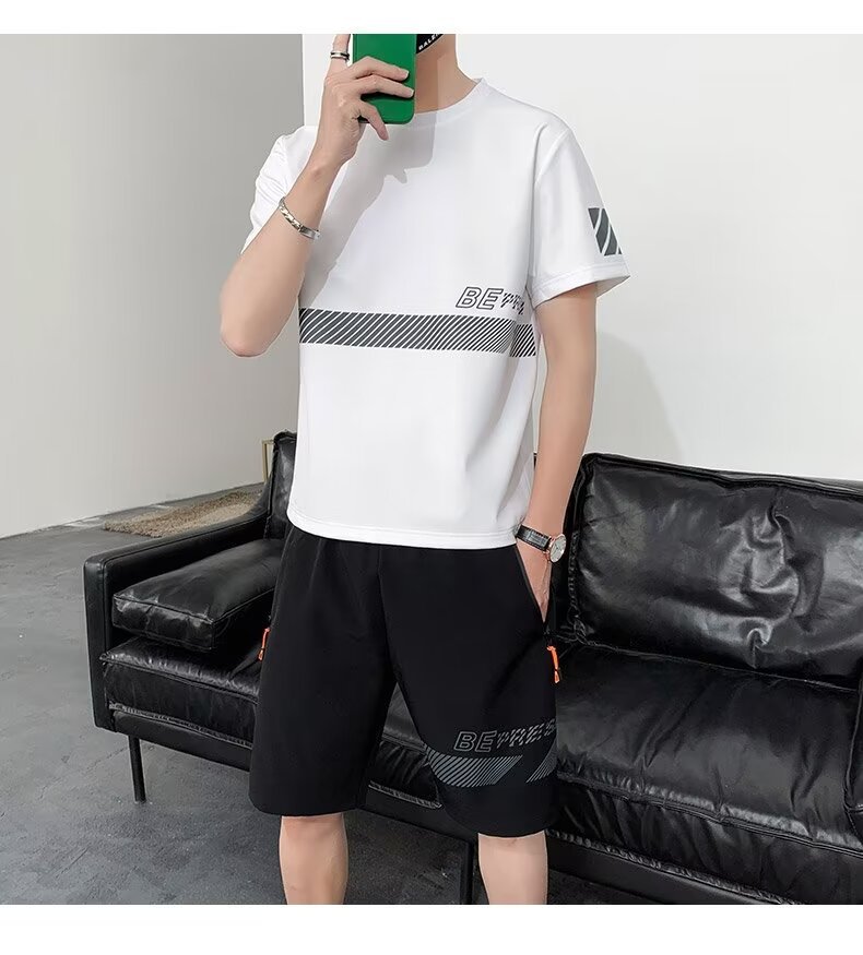 아이스 실크 반팔 티셔츠 세트 남성 여름 유행 캐주얼 스포츠 세트 반바지 투피스 세트