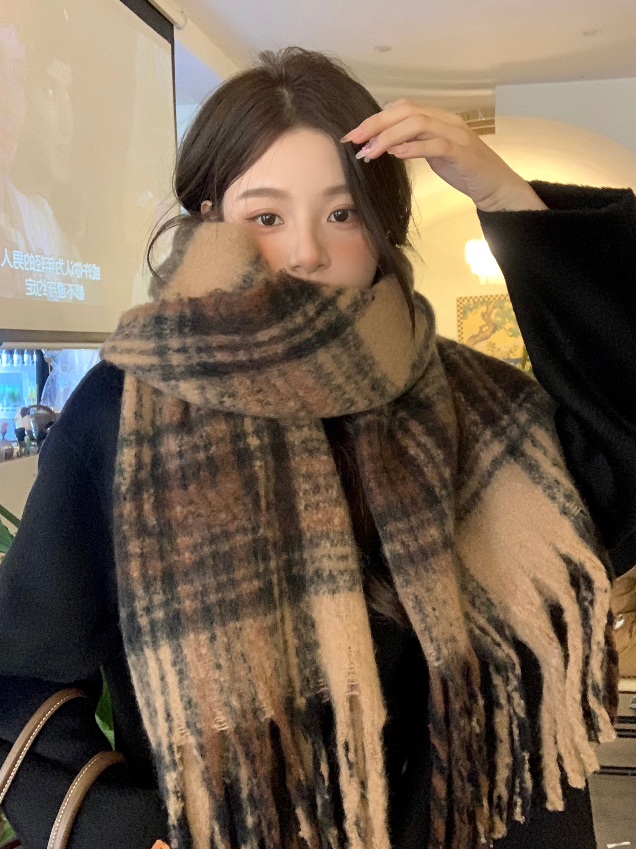 따뜻한 카페 Maillard ~ 고급 격자 무늬 스카프 여성의 가을과 겨울 복고풍 조커 두꺼운 따뜻한 목도리 스카프 패션