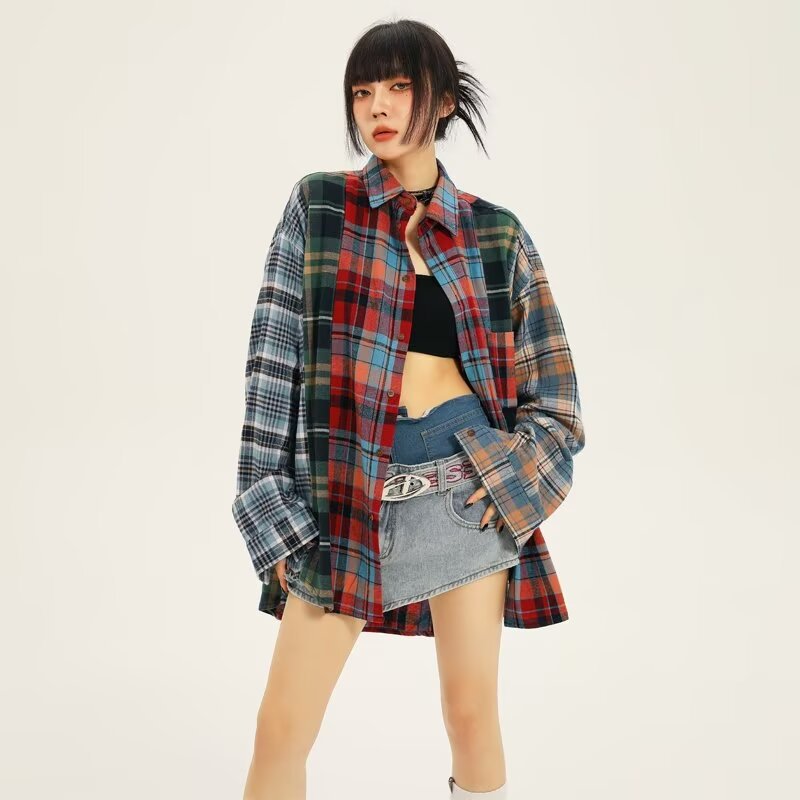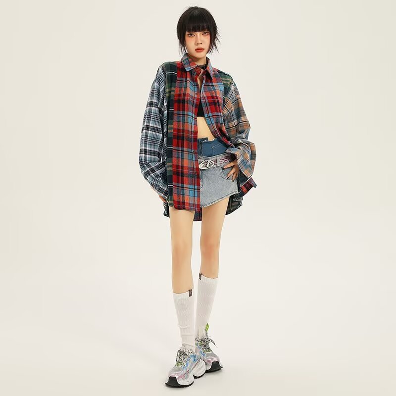2024 아메리칸 스타일 레트로 컬러 패치 워크 체크 셔츠 재킷 여성 스트리트 스타일 봄과 가을 느슨한 디자인 센스 셔츠