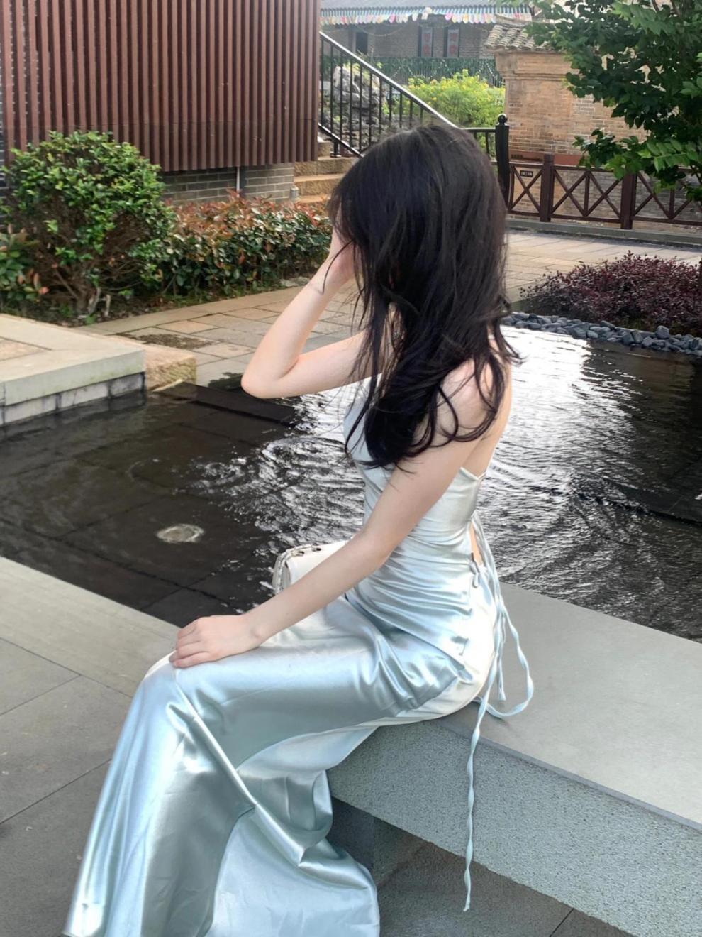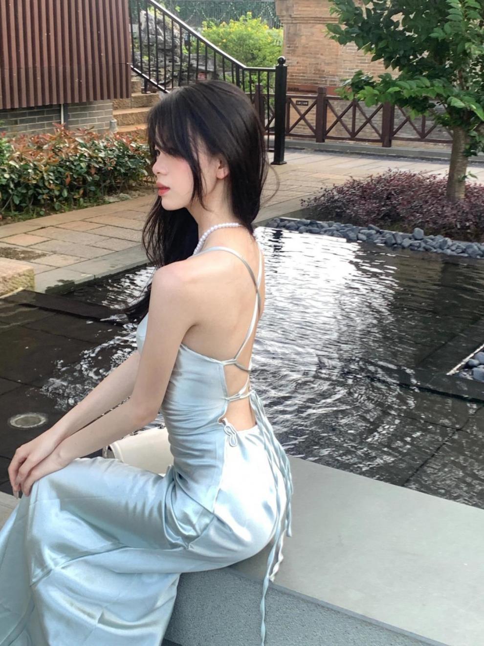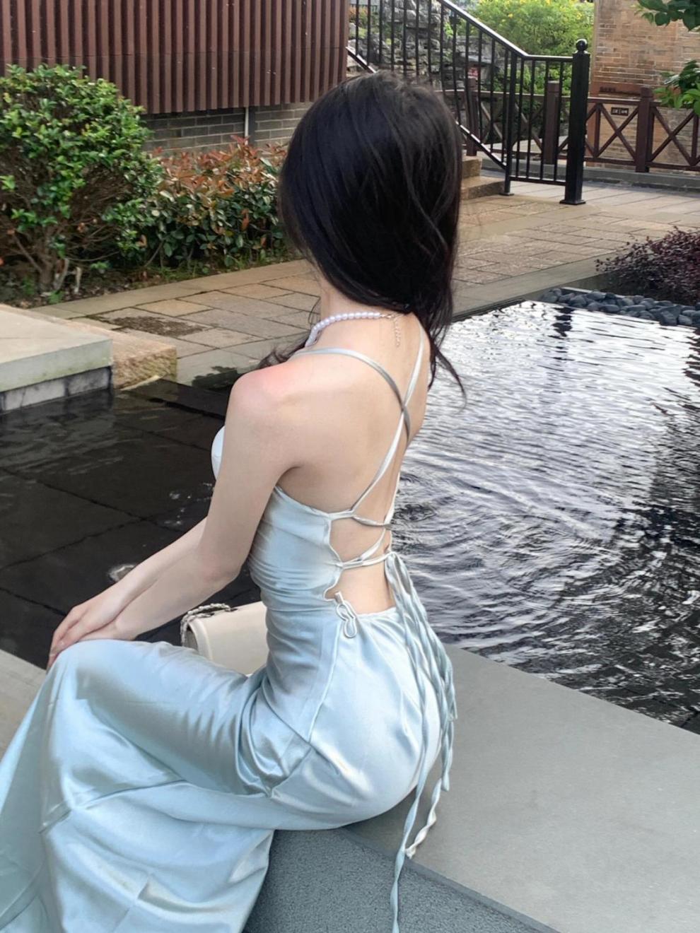 프랑스 스타일 로얄 자매 스타일 민트 그린 우아한 슬링 원피스 여성 여름 새로운 백리스 스트랩 허리 슬리밍 긴 원피스스토어 가기